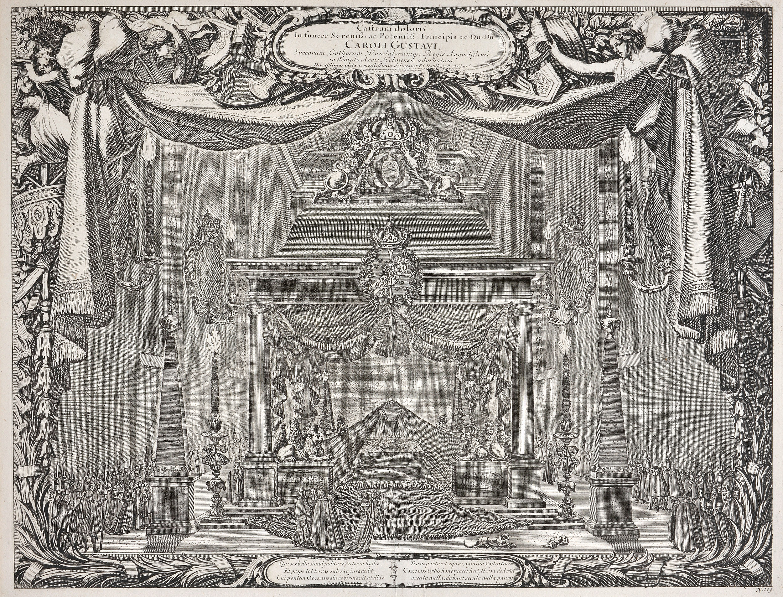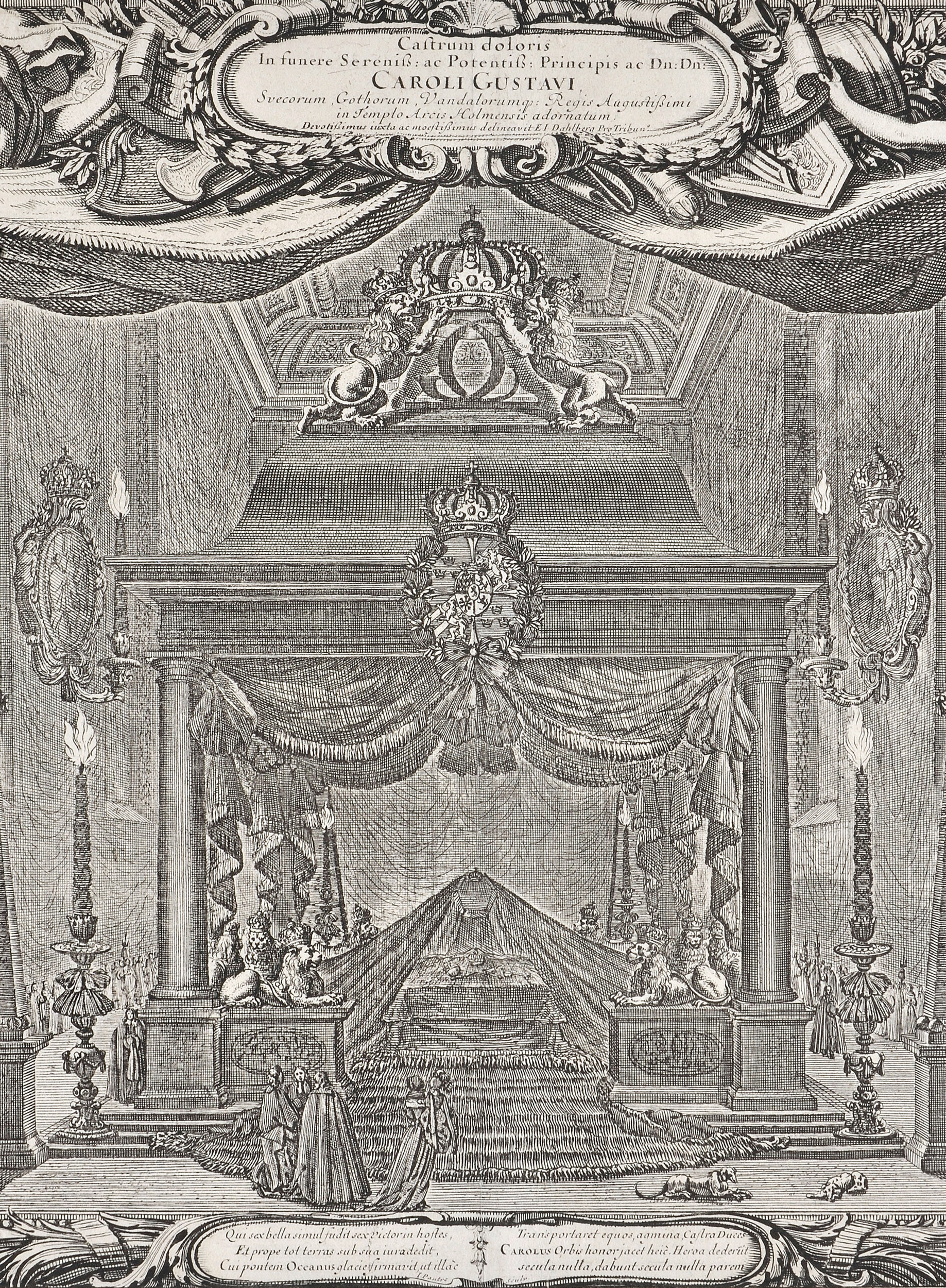 Karol Gustaw, król Szwecji, Samuel Pufendorf, rycina, rysunek, pogrzeb, uroczystość, Castrum Doloris, katafalk