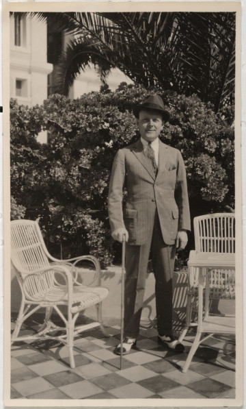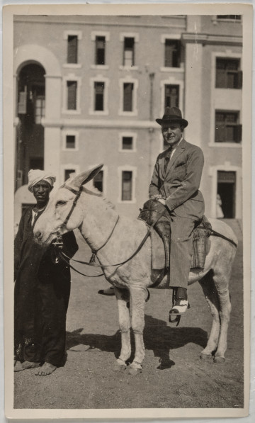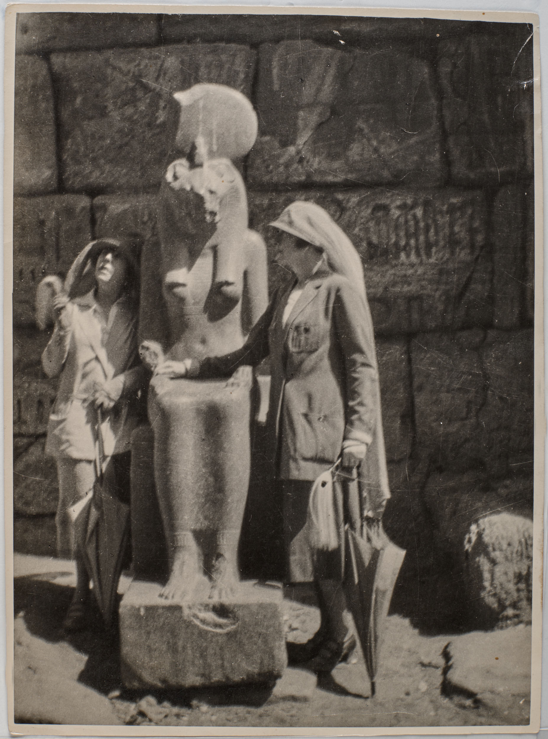 Fotografia przedstawiająca hrabinę Elżbietę z Radziwiłłów Romanową Potocką matkę Alfreda Antoniego Potockiego, IV ordynata łańcuckiego podczas podróży do północnej Afryki w końcu lat 20. XX wieku. Elżbieta Potocka wraz z druga nieznaną kobieta stoją po obu stronach posagu bogini Sechmet. Romanowa Potocka ukazana bokiem zwrócona na prawo, w ciemnym kostiumie i kapeluszu z woalem, trzyma w lewej ręce miotełkę do odganiania owadów oraz parasolkę a prawą ma położoną na kolanach posągu. Droga kobieta ubrana podobnie stoi przodem z uniesiona głowa. W tle ściana z kamiennych głazów.