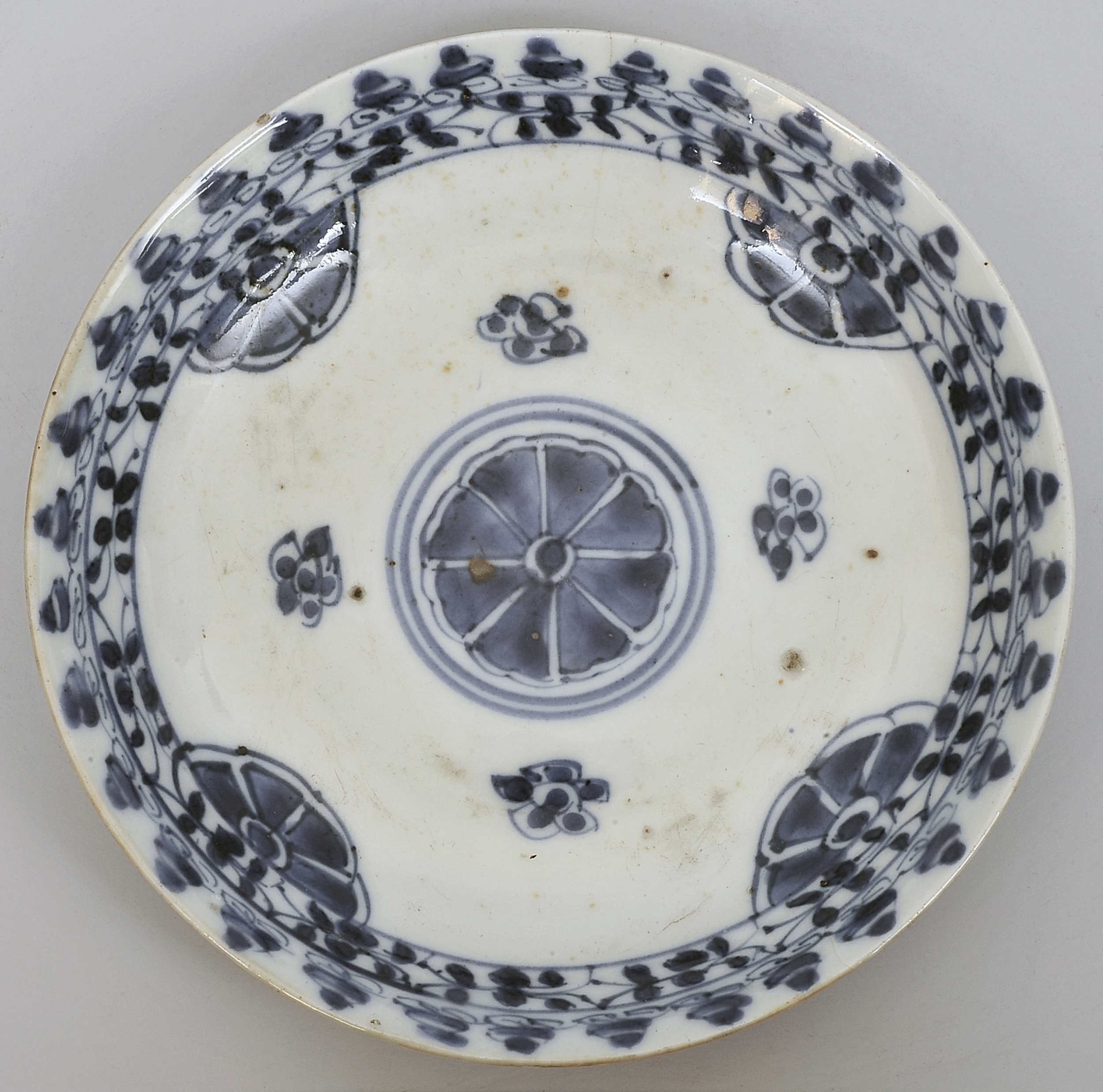 Talerzyk należy do wyrobów białoniebieskich, które zaczęto produkować w Chinach najpewniej w VII wieku. Przedmioty te zdobiono jedynie niebieskim pigmentem w technice podszkliwnej. Pierwsze tego typu naczynia pojawiły się w okresie panowania dynastii Tang (618 – 906). Przedmioty te podlegały ówcześnie jednemu wypałowi. Oznacza to, że niebieską dekorację malowano na wysuszonym czerepie i dopiero po pokryciu przedmiotu szkliwem, poddawano go wypałowi. Z końcem XIII wieku wprowadzono w słynnych manufakturach w Jingdezhen nową recepturę masy porcelanowej i udoskonalono technologię wytwarzania porcelany. Nieprzypadkowo ośrodki w Jingdezhen słyną z najpiękniejszych przykładów porcelany białoniebieskiej, z mistrzowskiego operowania kobaltem.