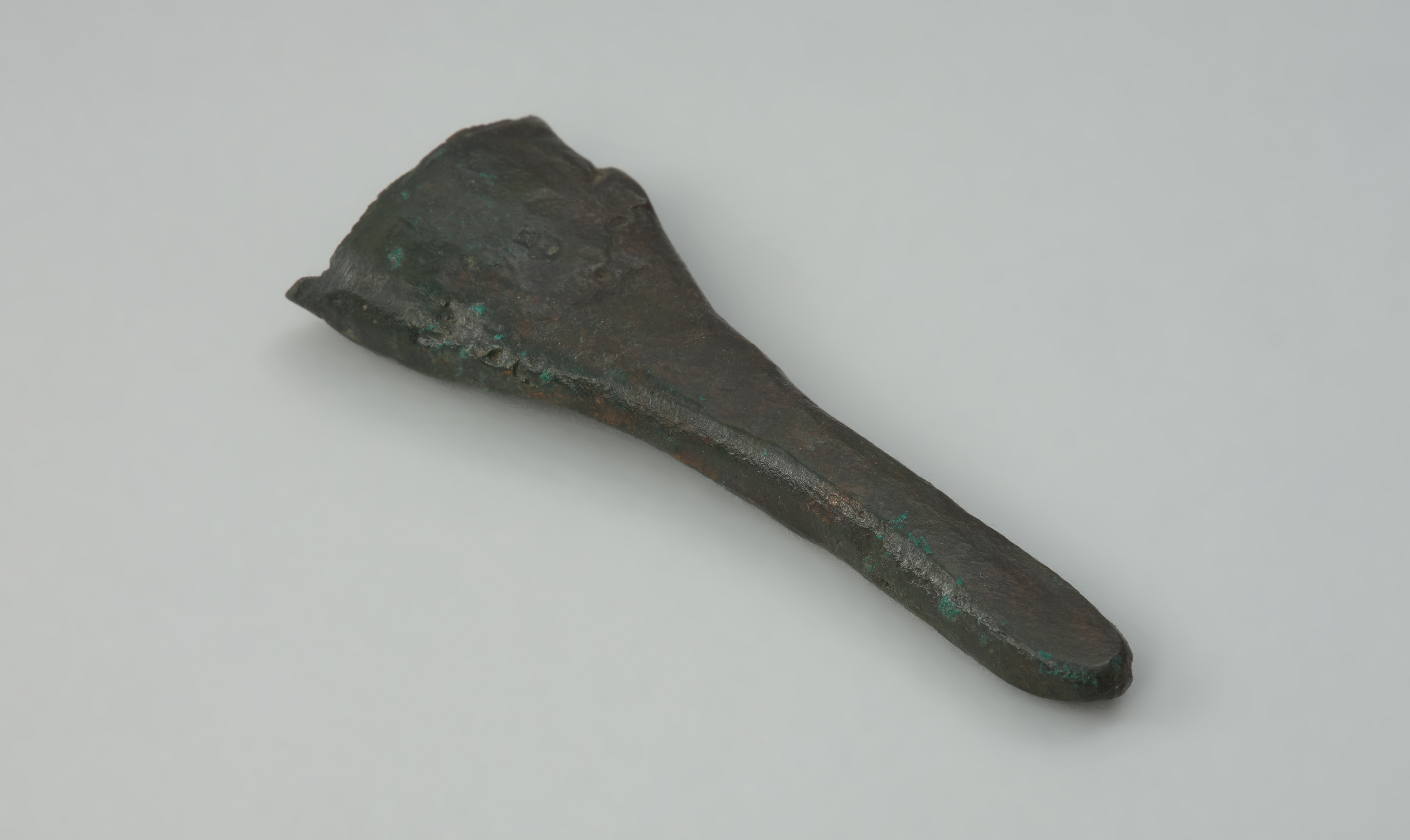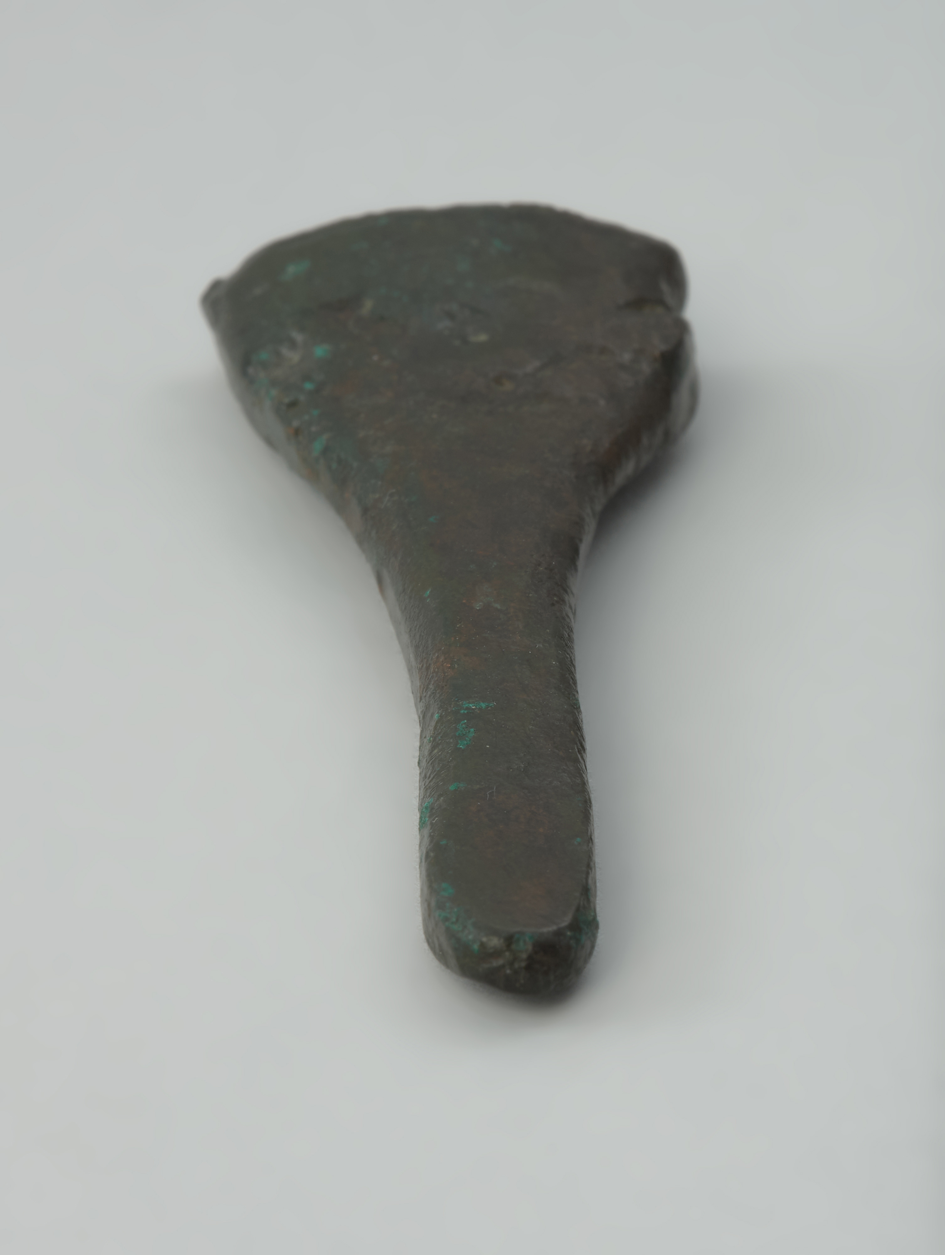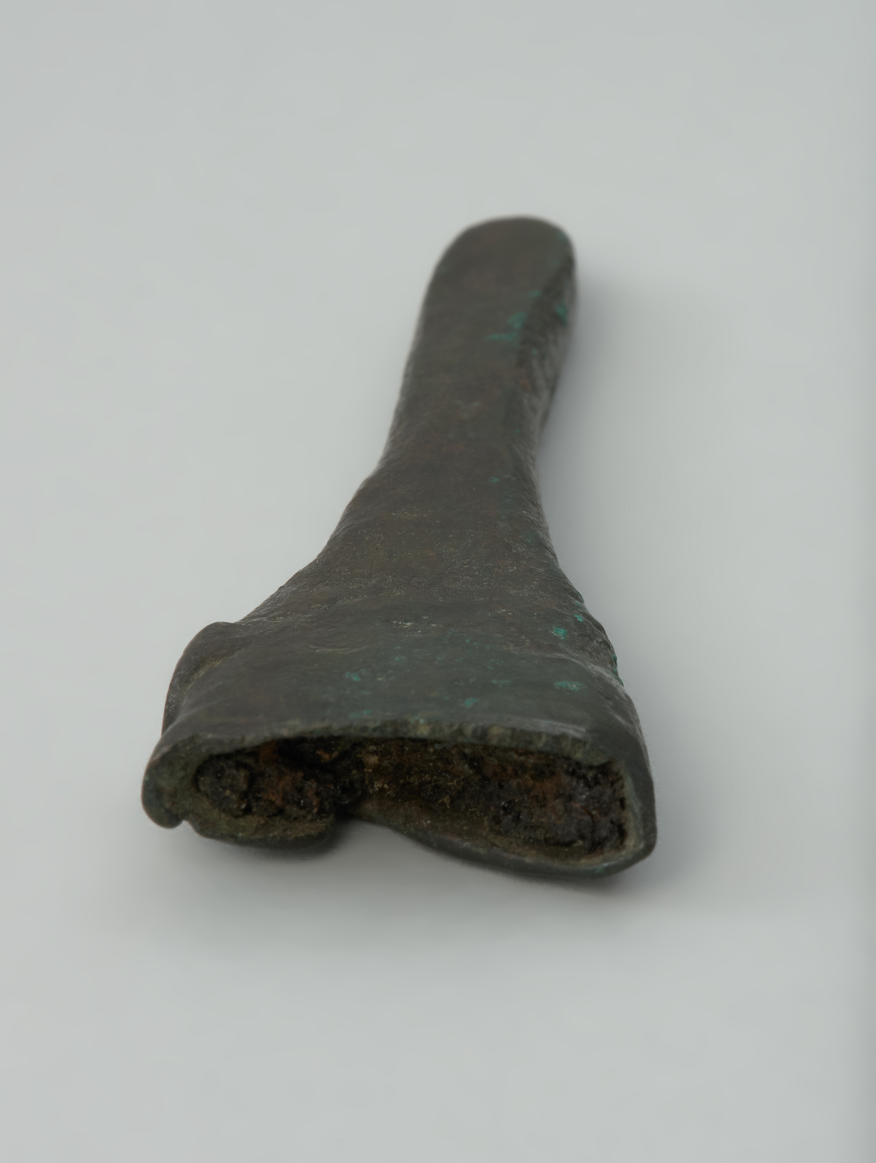 Ten niewielki przedmiot o lejkowatym kształcie to okucie dolnej części pochwy miecza, tzw. trzewik. Trzewiki brązowe oraz inne detale pochew, wykonywane najpewniej także z surowców organicznych, należą do bardzo rzadkich znalezisk na obszarze Polski. Prezentowany zabytek stanowi element dość dużego skarbu zawierającego całe i pokawałkowane wytwory. Znajdowała się w nim broń i jej części, przetyczka z uprzęży końskiej, przedmioty związane z metalurgią, narzędzia żniwne, ozdoby ramion i ubioru oraz szczypczyki, małe kółka i fragment brązowego naczynia. Depozyt, datowany na V okres epoki brązu (ok. 900–750 BC), został odkryty w 1833 roku na cmentarzysku popielnicowym kultury łużyckiej lub w jego pobliżu. Przedmioty z brązu znajdowały się w naczyniu glinianym ukrytym obok głazu narzutowego. Zabytki zabezpieczył i przekazał następnie do zbiorów szczecińskiego Towarzystwa Historii Pomorza i Starożytności kupiec Dohrn z Klęskowa. Występujące w skarbie liczne pokawałkowane przedmioty odzwierciedlają zjawisko dość powszechnego gromadzenia surowca brązowego pod koniec epoki brązu. Miał on w tym czasie najczęściej postać sztabek lub placków, ale także złomu, na który składały się uszkodzone lub źle odlane wytwory. W 1944 roku trzewik, miecz oraz kilka innych części skarbu ewakuowano w głąb Niemiec, w celu ich zabezpieczenia przed zniszczeniami wojennymi. Do zbiorów Muzeum Narodowego w Szczecinie przekazano je dopiero w 2009 roku w efekcie realizacji polsko-niemieckiej wymiany dawnych znalezisk archeologicznych.