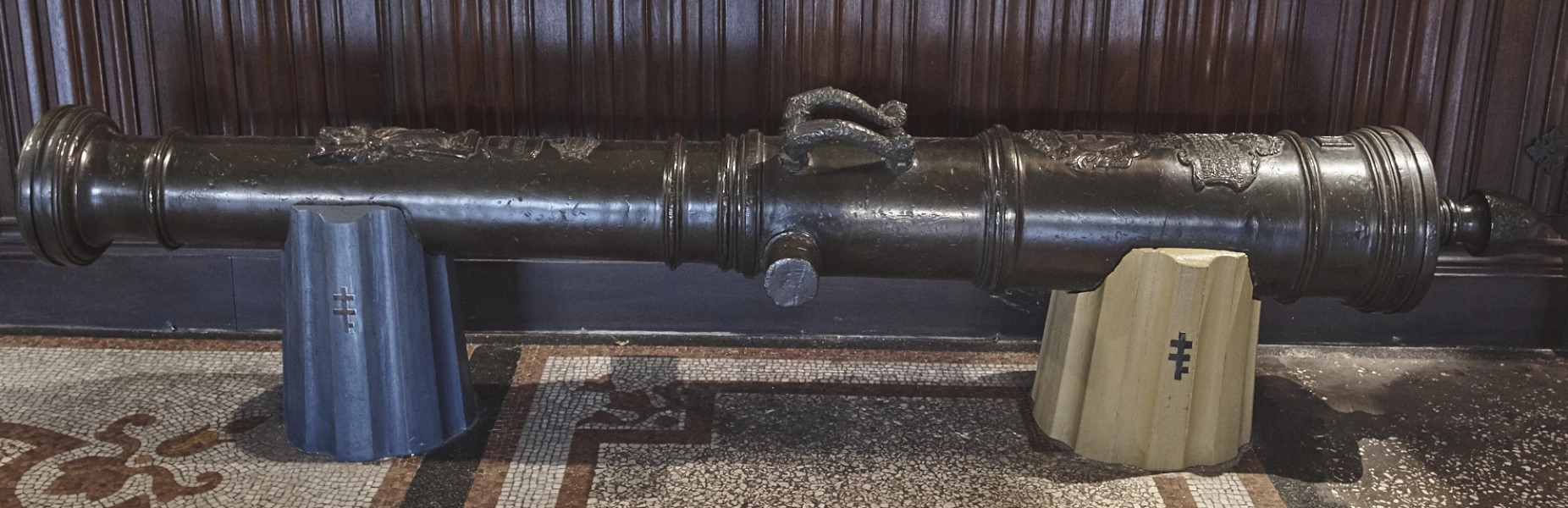 z cyną, cynkiem i ołowiem. Lufa ma długość 2,45 m, kaliber 9 cm, zagwożdżony zapał i bogate zdobienie oraz uszy w kształcie delfinów, wygiętych pałąkowato