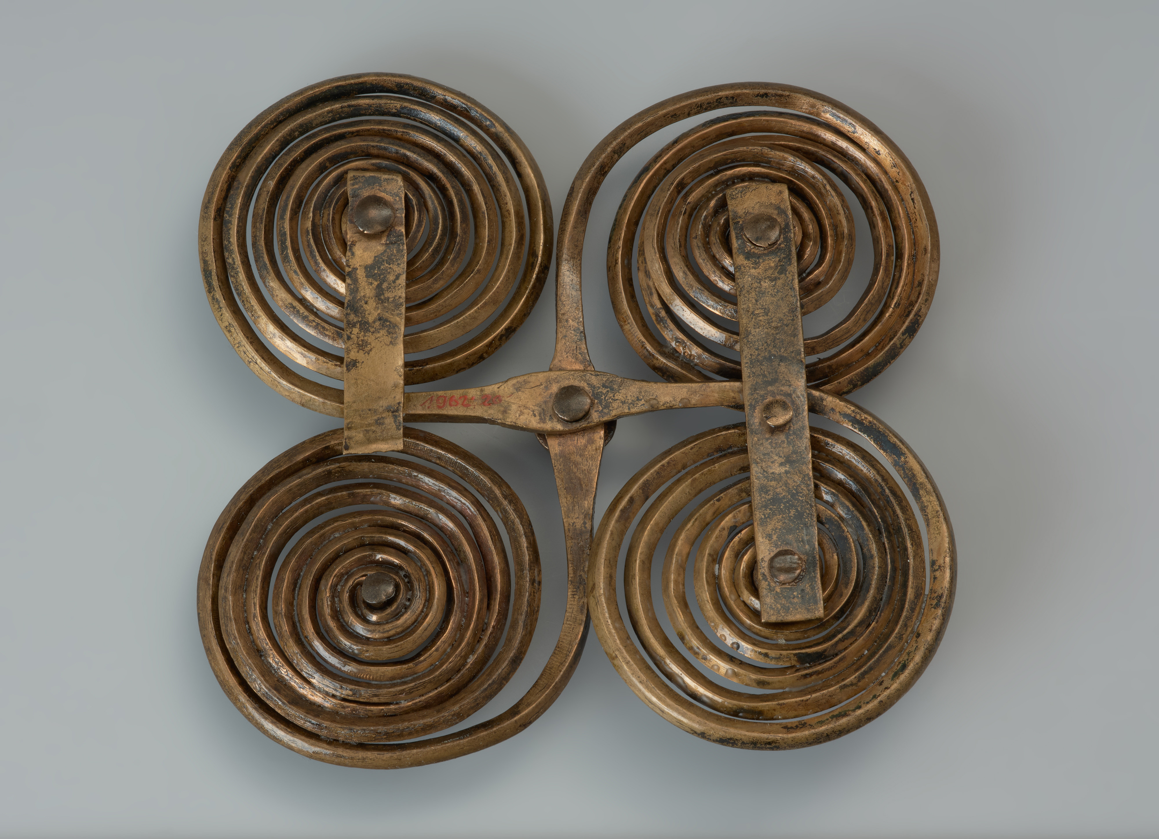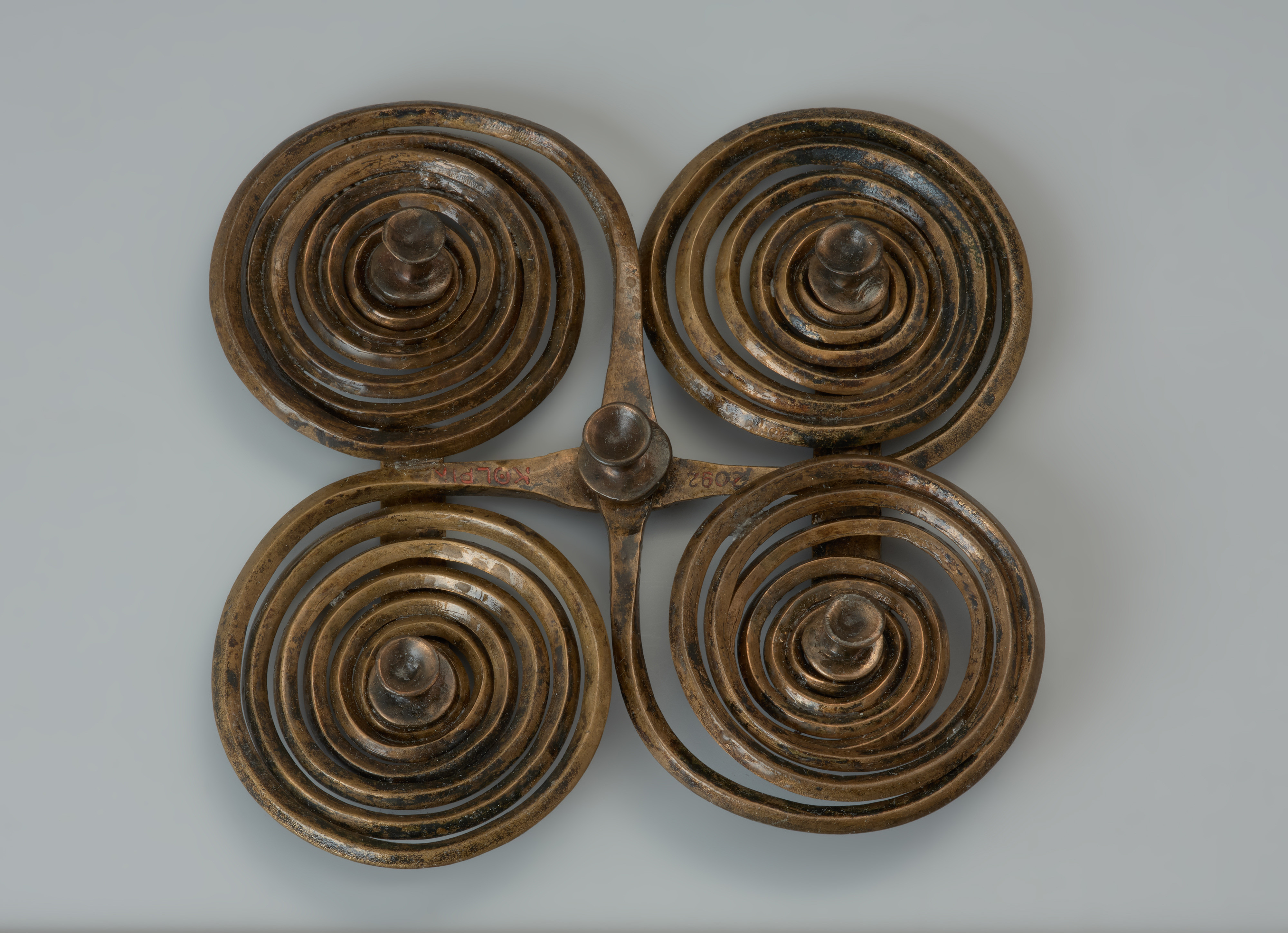 Fibula krzyżowa to oryginalna ozdoba wykonana z dwóch prętów brązowych o rombowatym przekroju, z których uformowano po parze spiralnych tarczek. Elementy te złożono na krzyż, uzyskując czworokątny kształt zapinki. Jej dekoracji dopełnia pięć ozdobnych guzków. Jest to zabytek niepowtarzalny, o dużej wartości wystawienniczej. Fibula jest częścią skarbu odkrytego w bagnie w 1884 roku, na który złożyły się ponadto części rzędu końskiego (dwa wędzidła, 14 brzękadeł, 14 guzków, trzy kółka), dwie pary form do odlewnia siekierek, trzy fibule, okazała brzytwa i destrukty kilku wyrobów brązowych oraz żelaznych. Należy podkreślić, że bagienny kontekst odkrycia może świadczyć o jego szczególnym znaczeniu związanym z wierzeniami i składaniem darów ofiarnych. Depozyt trafił do zbiorów muzealnych w Szczecinie i był tu przechowywany do sierpnia 1944 roku. Z uwagi na zbliżający się front i naloty alianckie został ewakuowany wraz z innymi cennymi zabytkami w głąb Niemiec. Do Szczecina powrócił dopiero w 2009 roku w wyniku realizacji polsko-niemieckiej wymiany dawnych zbiorów archeologicznych. Depozyt z Kiełpina datowany na wczesną epokę żelaza, tj. okres halsztacki C (ok. 750–600/550 BC), uchodzi za wyjątkowy zespół znalezisk archeologicznych. Większość występujących w nim zabytków ma cechy wyrobów z kręgu kultury halsztackiej, której nazwa wywodzi się od cmentarzyska w miejscowości Hallstatt w Austrii. Forma oraz technika wykonania prezentowanej zapinki wskazują, że może być ona importem z obszaru tej kultury. Co ciekawe, jest jedynym tego typu znaleziskiem w północnej części środkowej Europy.