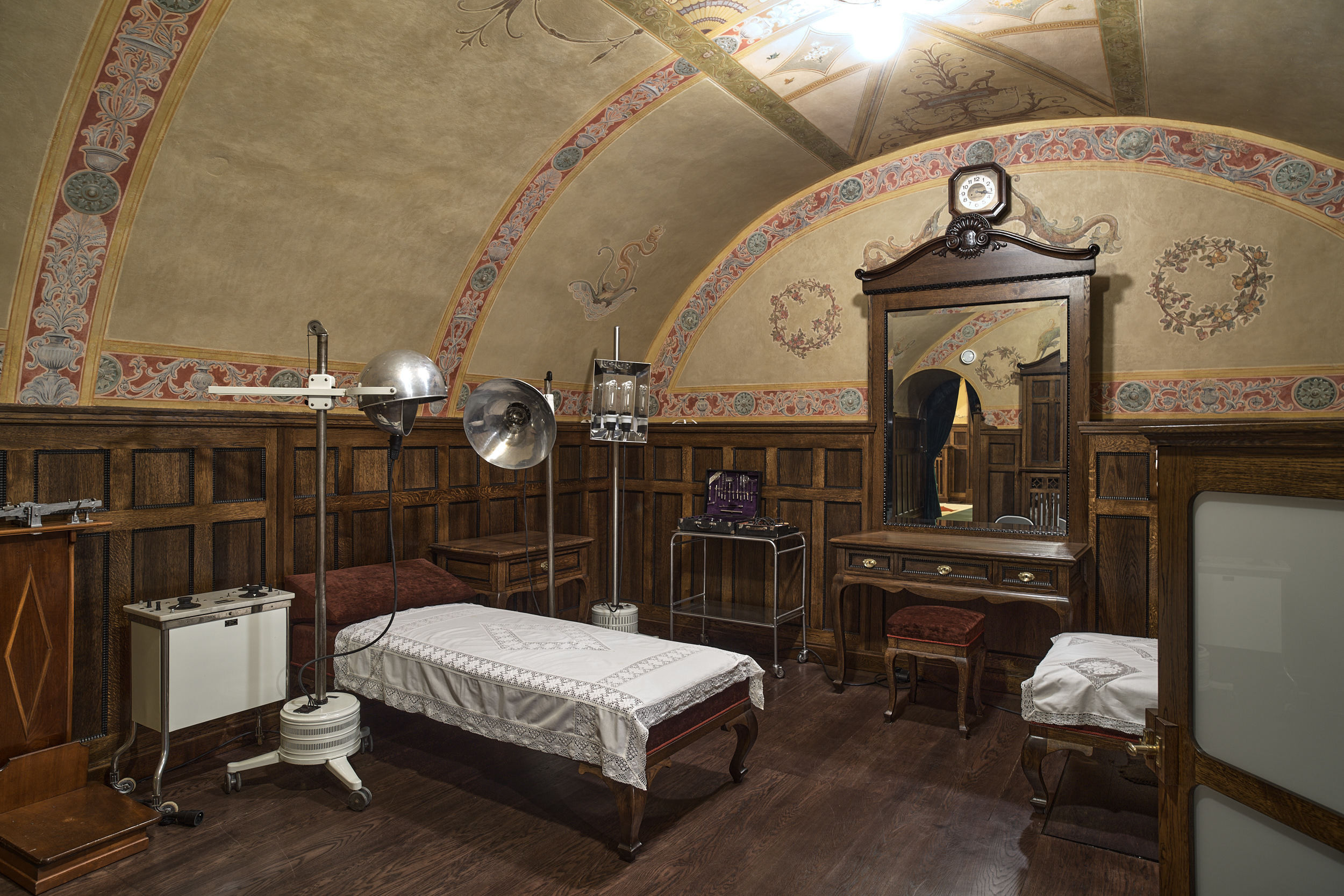 Najbardziej nowoczesną realizacją w łańcuckim zamku ostatniego ordynata Alfreda Antoniego Potockiego w międzywojniu XX wieku były, powstałe w 1928 roku w części piwnic, tzw. Rzymskie Łaźnie, do których wchodzi się z parterowego, północnego korytarza. Innym sposobem komunikacji pomiędzy łaźniami a wszystkimi kondygnacjami zamku była winda. Ten rekreacyjny kompleks, jaki tworzą wyłożone porcelanowymi płytkami lub boazerią i ozdobione dekoracją malarską sklepione komnaty, przeznaczony był do szeroko pojętej odnowy fizycznej: ćwiczeń, masażu i hydro i elektroterapii. Zainstalowano w nich cały system nowoczesnych wanien i urządzeń balneologicznych i gimnastycznych. Łaźnie urządzone były bardzo wykwintnie: schodzi się do nich szerokimi, paradnymi schodami. Poczekalnia i bar z dekoracją malarską ścian i sklepienia, z ciężkimi kotarami pomiędzy pomieszczeniami, oświetlają dyskretnie kinkiety. Stoją tam skórzane klubowe fotele i kanapy, a w barze wysoki pulpit i stołki. Ordynat zapraszał do łaźni swoich gości– bywanie w nich stało się jedną z łańcuckich atrakcji.