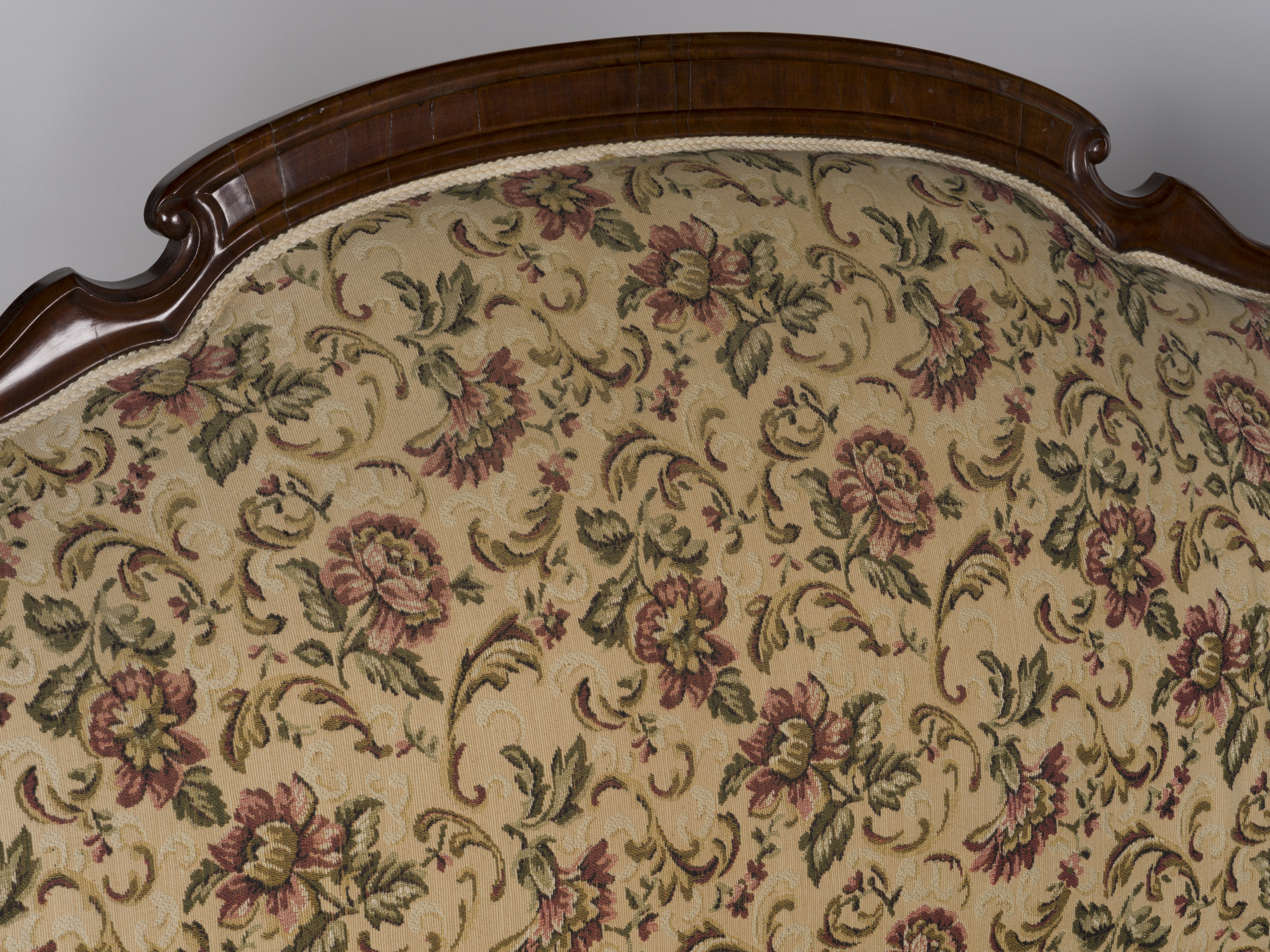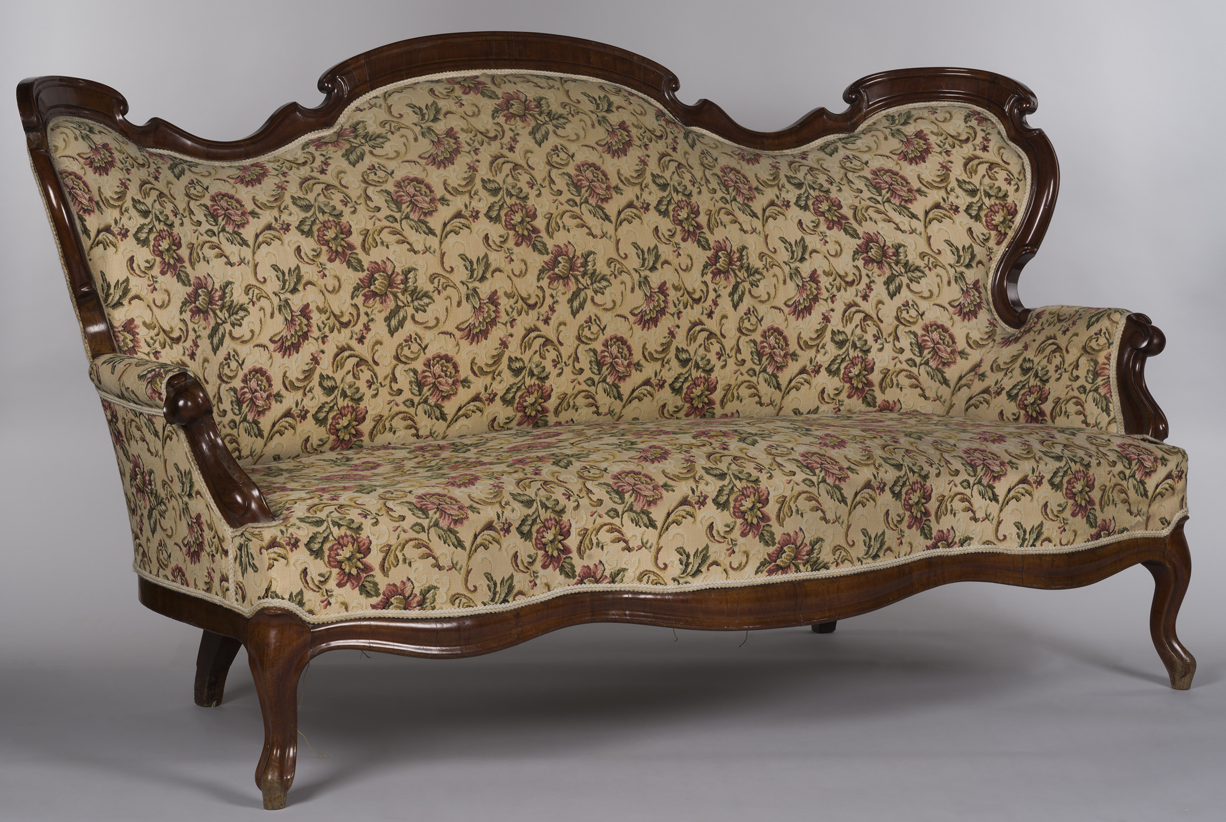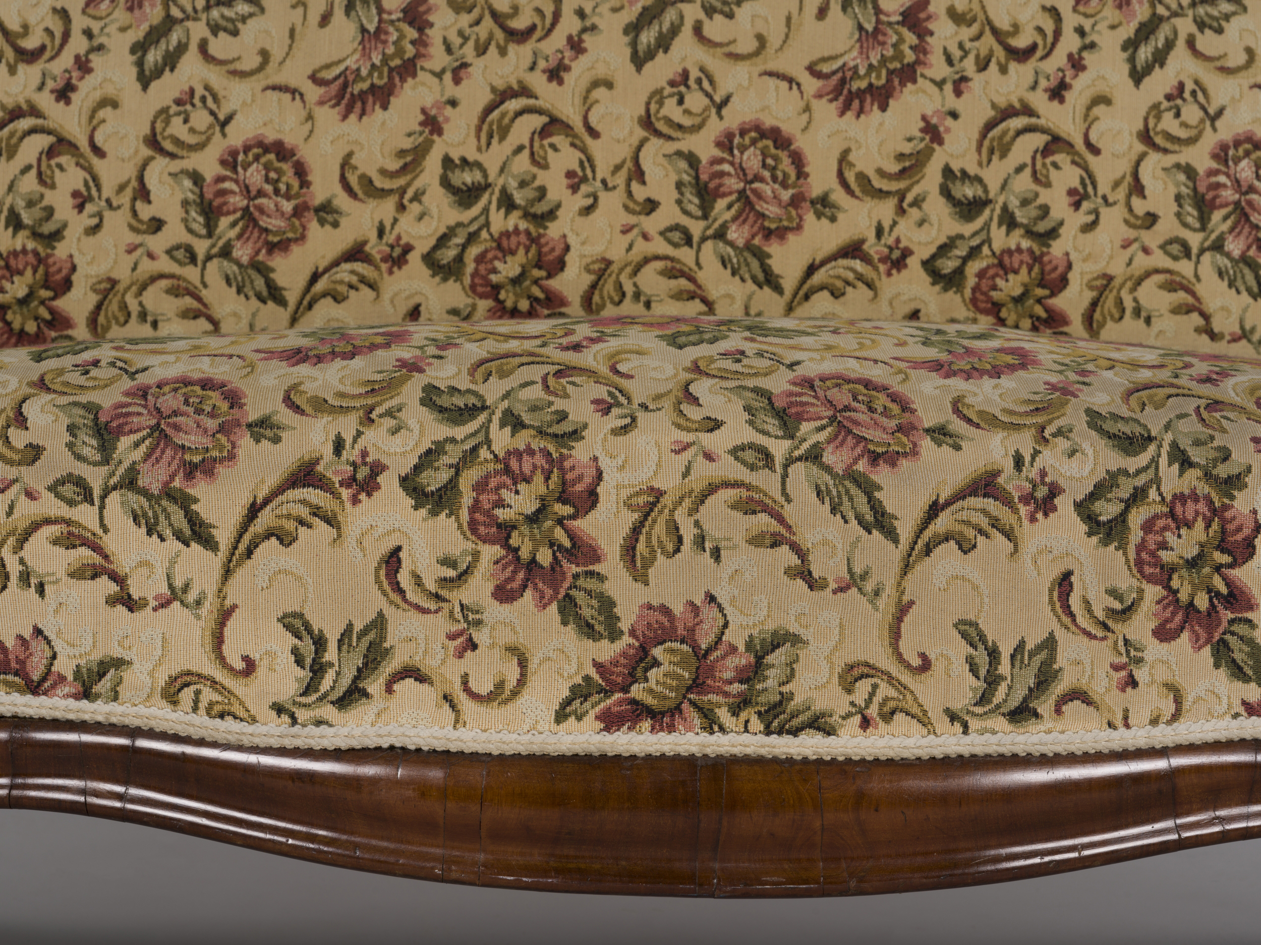 Kanapa należy do francuskiego kompletu mebli w stylu regencyjnym o wysokiej wartości artystycznej, składającego się pierwotnie z kanapy i dwunastu foteli. Reprezentuje typ à oreilles - oparcie pleców łączące się z pełnymi bokami i z siedziskiem zachowało jeszcze barokowy kształt. Górna krawędź boków pełni jednocześnie rolę podłokietników. Falista linia pozostałych elementów zaciera linie konstrukcyjne mebla. Siedzisko wsparte jest na ośmiu wygiętych nóżkach typu cabriole wiązanych u dołu dwoma łączynami krzyżakowymi. Widoczne elementy drewnianej konstrukcji w naturalnym kolorze drewna pokrywa bogata rzeźba z wiotkimi liniami gałązek akantu oplatającymi ramy, oraz muszlami akcentującymi podziały kompozycyjne, nadając im walor lekkości. Do osiągnięcia tego efektu przyczynia się znacząco wspaniała kompozycja kwiatów znanych z barokowych obrazów mistrzów flamandzkich.W części centralnej oparcia - wspaniały bukiet kwiatów w dekoracyjnej wazie, po bokach kogut i pies. Rzędy główek mosiężnych ćwieków mocujących tkaninę do konstrukcji drewnianej dają dyskretne złote refleksy. Komplet mebli pod koniec XVIII w. stanowił wyposażenie Apartamentów ks. Izabeli Lubomirskiej, później dekorował dawne Apartamenty Królewskie. Obecnie zachowała się kanapa (Wil.964) (z której okupanci niemieccy w czasie 2. wojny światowej wycięli nożem tkaninę siedziska) i sześć foteli (Wil.962/1-6).