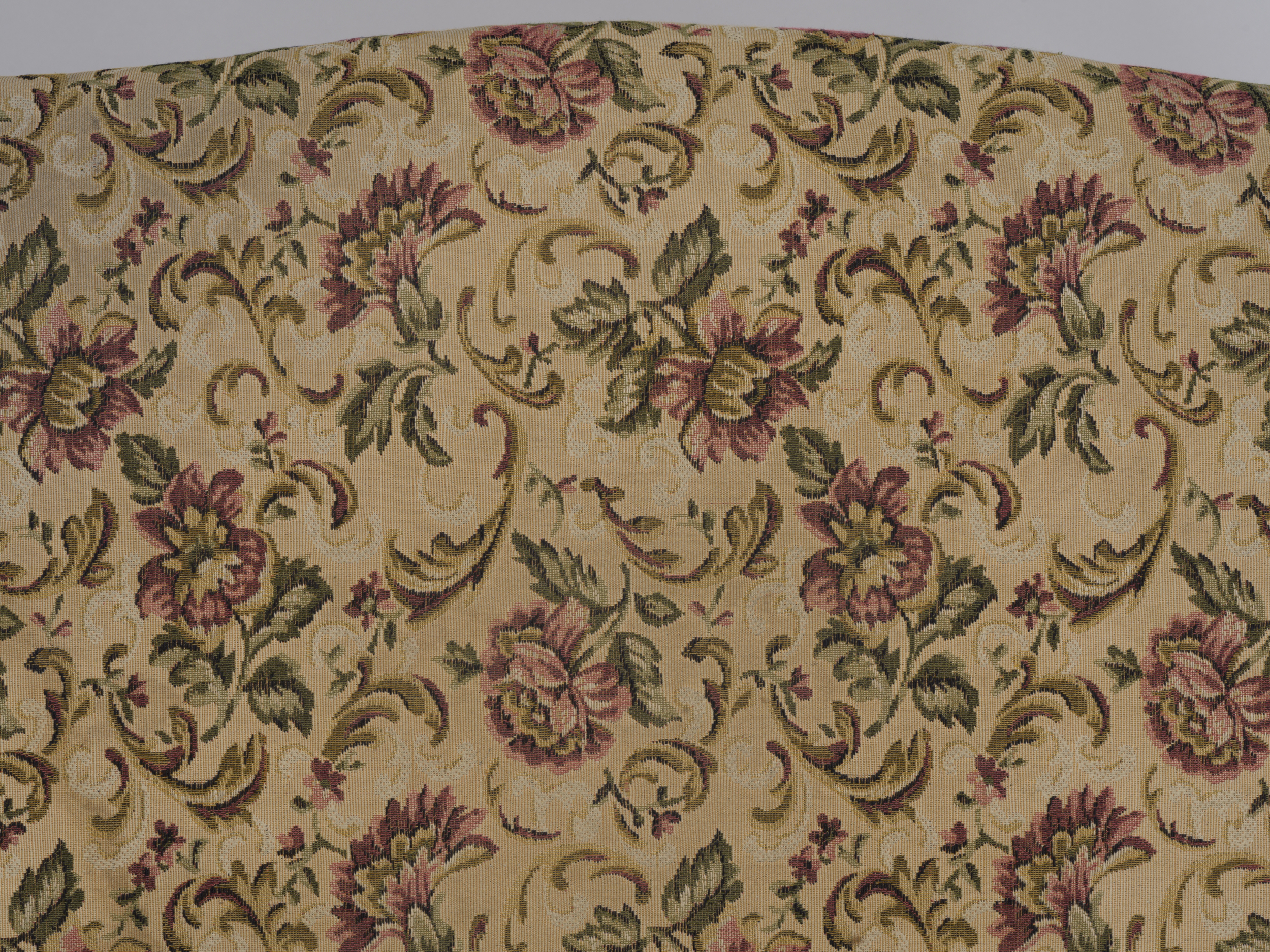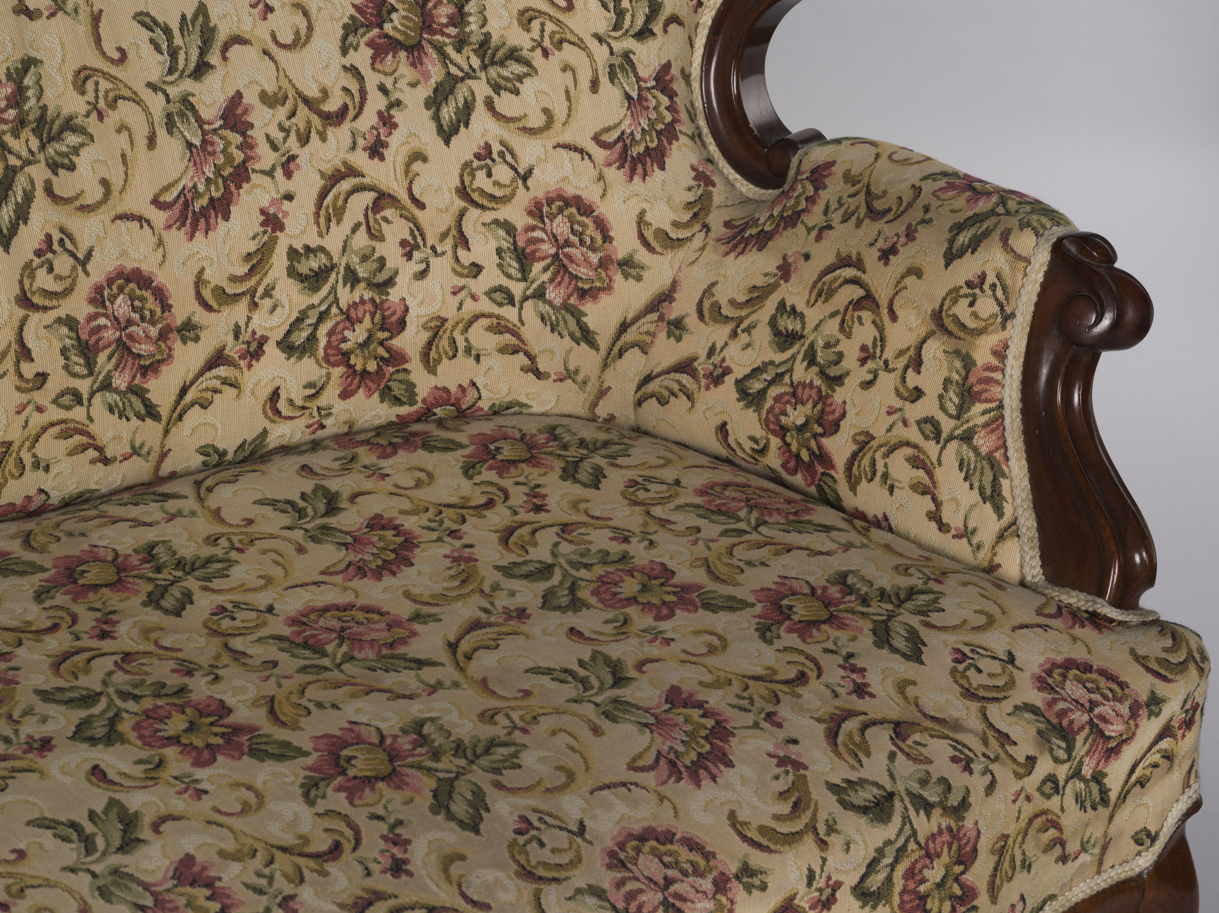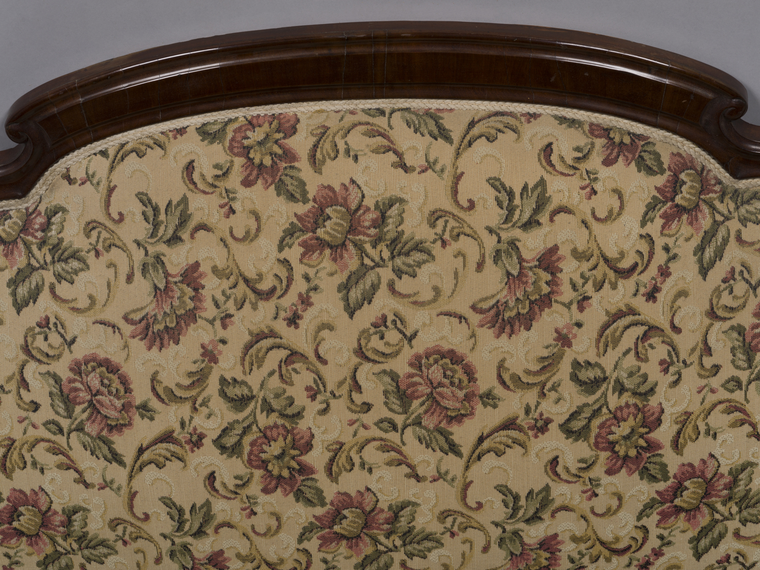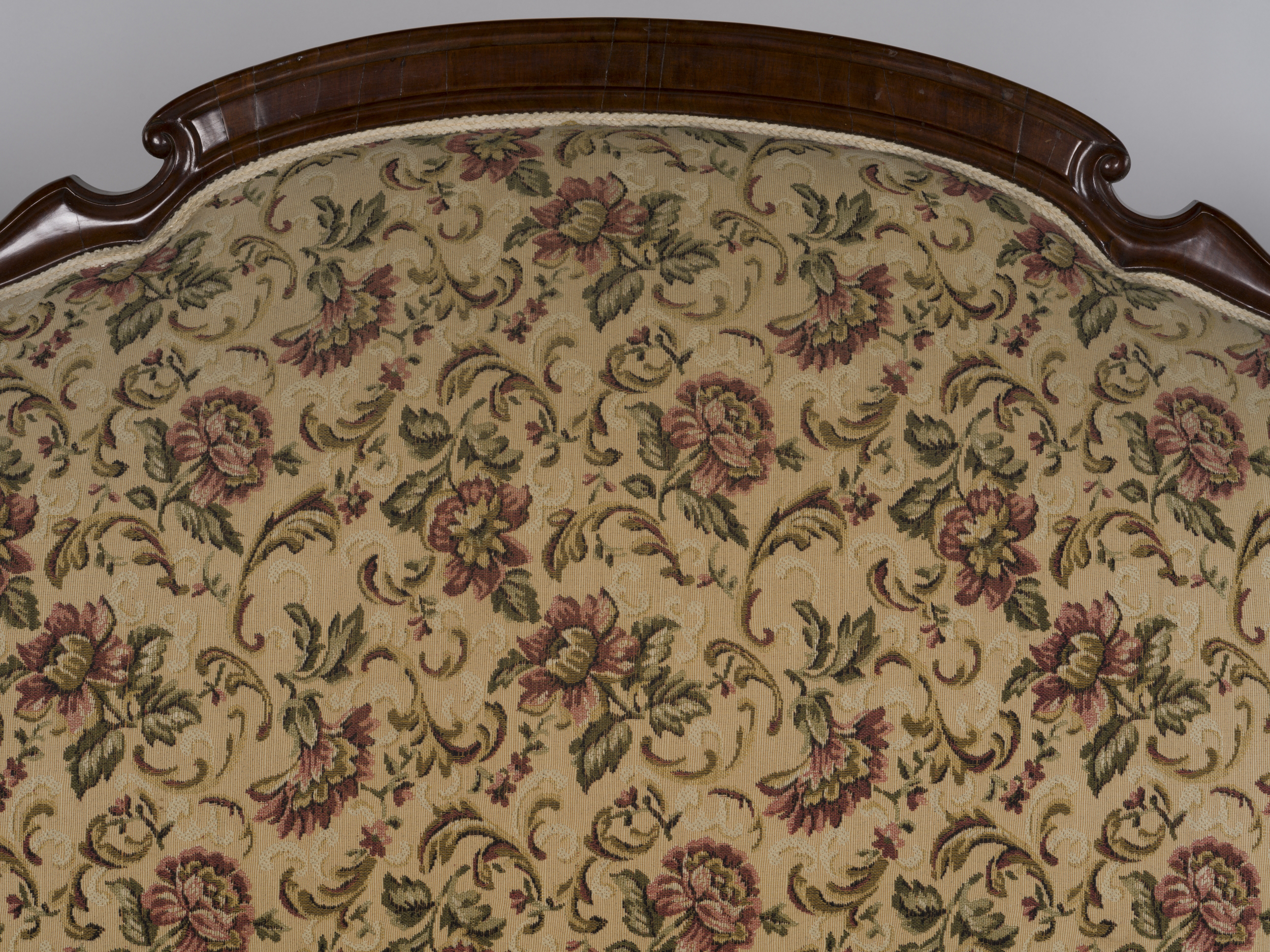 Kanapa należy do francuskiego kompletu mebli w stylu regencyjnym o wysokiej wartości artystycznej, składającego się pierwotnie z kanapy i dwunastu foteli. Reprezentuje typ à oreilles - oparcie pleców łączące się z pełnymi bokami i z siedziskiem zachowało jeszcze barokowy kształt. Górna krawędź boków pełni jednocześnie rolę podłokietników. Falista linia pozostałych elementów zaciera linie konstrukcyjne mebla. Siedzisko wsparte jest na ośmiu wygiętych nóżkach typu cabriole wiązanych u dołu dwoma łączynami krzyżakowymi. Widoczne elementy drewnianej konstrukcji w naturalnym kolorze drewna pokrywa bogata rzeźba z wiotkimi liniami gałązek akantu oplatającymi ramy, oraz muszlami akcentującymi podziały kompozycyjne, nadając im walor lekkości. Do osiągnięcia tego efektu przyczynia się znacząco wspaniała kompozycja kwiatów znanych z barokowych obrazów mistrzów flamandzkich.W części centralnej oparcia - wspaniały bukiet kwiatów w dekoracyjnej wazie, po bokach kogut i pies. Rzędy główek mosiężnych ćwieków mocujących tkaninę do konstrukcji drewnianej dają dyskretne złote refleksy. Komplet mebli pod koniec XVIII w. stanowił wyposażenie Apartamentów ks. Izabeli Lubomirskiej, później dekorował dawne Apartamenty Królewskie. Obecnie zachowała się kanapa (Wil.964) (z której okupanci niemieccy w czasie 2. wojny światowej wycięli nożem tkaninę siedziska) i sześć foteli (Wil.962/1-6).