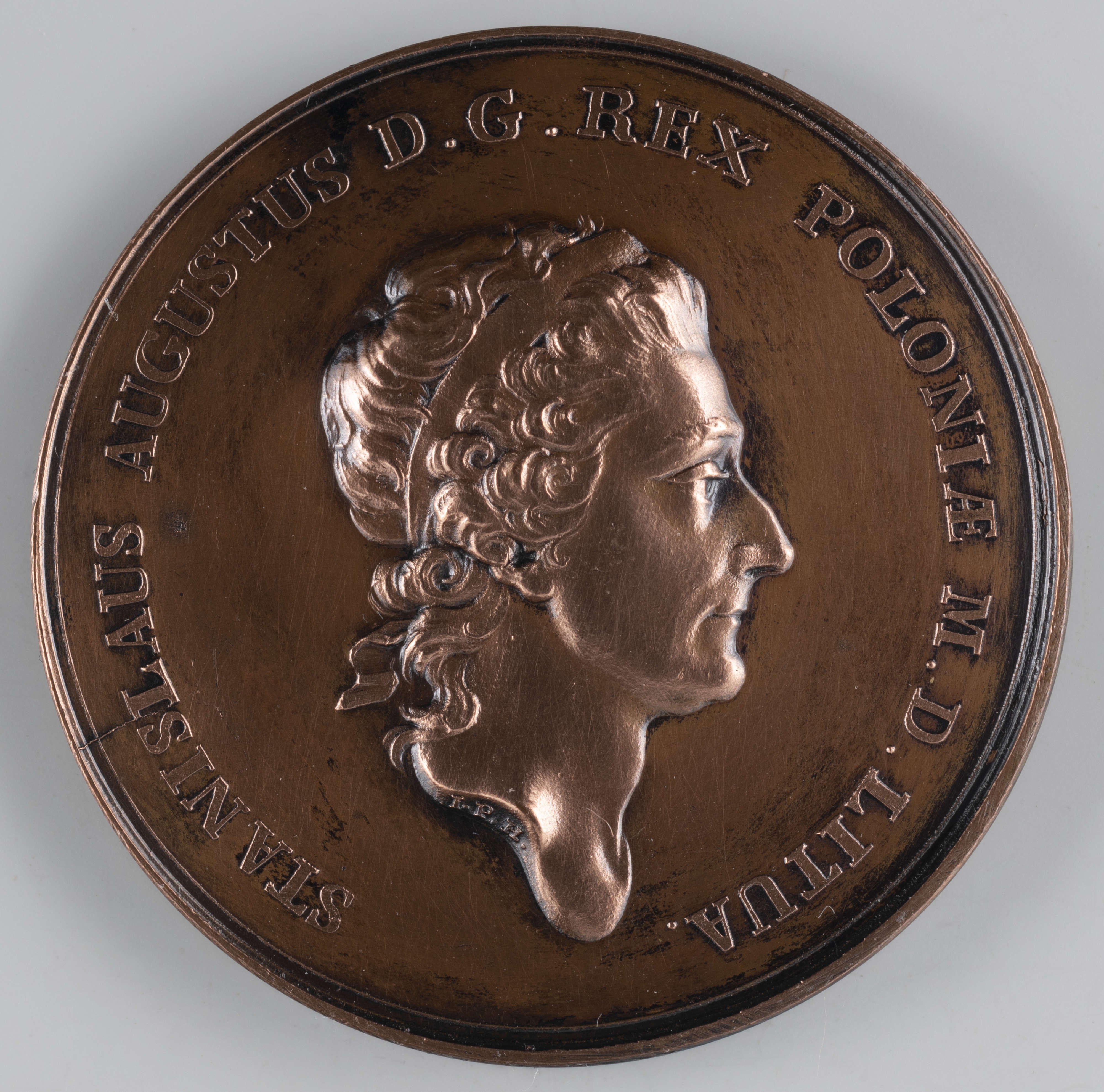Awers medalu przedstawia odwzorowanie głowy Stanisława Augusta Poniatowskiego z przepaską na włosach, otoczonej łacińskim napisem „STANISLAUS AUGUSTUS D[ei] G[ratia] REX POLONIAE M[agnus]. D[ux]. LITUA[niae]”, w tłumaczeniu: „Stanisław August z Bożej łaski król polski, wielki książę litewski”. Sygnatura pod szyją monarchy – I. P H. – informuje, że autorem pracy był nadworny medalier królewski Jan Filip Holzhaeusser (1741–1792). Umieszczone na medalu wyobrażenie władcy zaprojektował artysta po raz pierwszy na królewskim medalu koronacyjnym w 1766 roku. Cieszący się uznaniem monarchy portret był najczęściej przywoływany w późniejszej twórczości Jana Filipa Holzhaeussera. Okoliczności powstania pracy tłumaczy dziewięciowierszowa łacińska inskrypcja na awersie: „DEFICIENTI AD IMPENAS EXERCITUS AERARIO PUBLICO GEMMAS PROPRII GAZOPHILACII INTULIT ET DONAVIT. S.A.R. A. MDCCXC.”, w tłumaczeniu: „W niedostatku na wydatki wojskowe własne klejnoty skarbowi publicznemu dostarczył i darował król Stanisław August roku 1790”.
