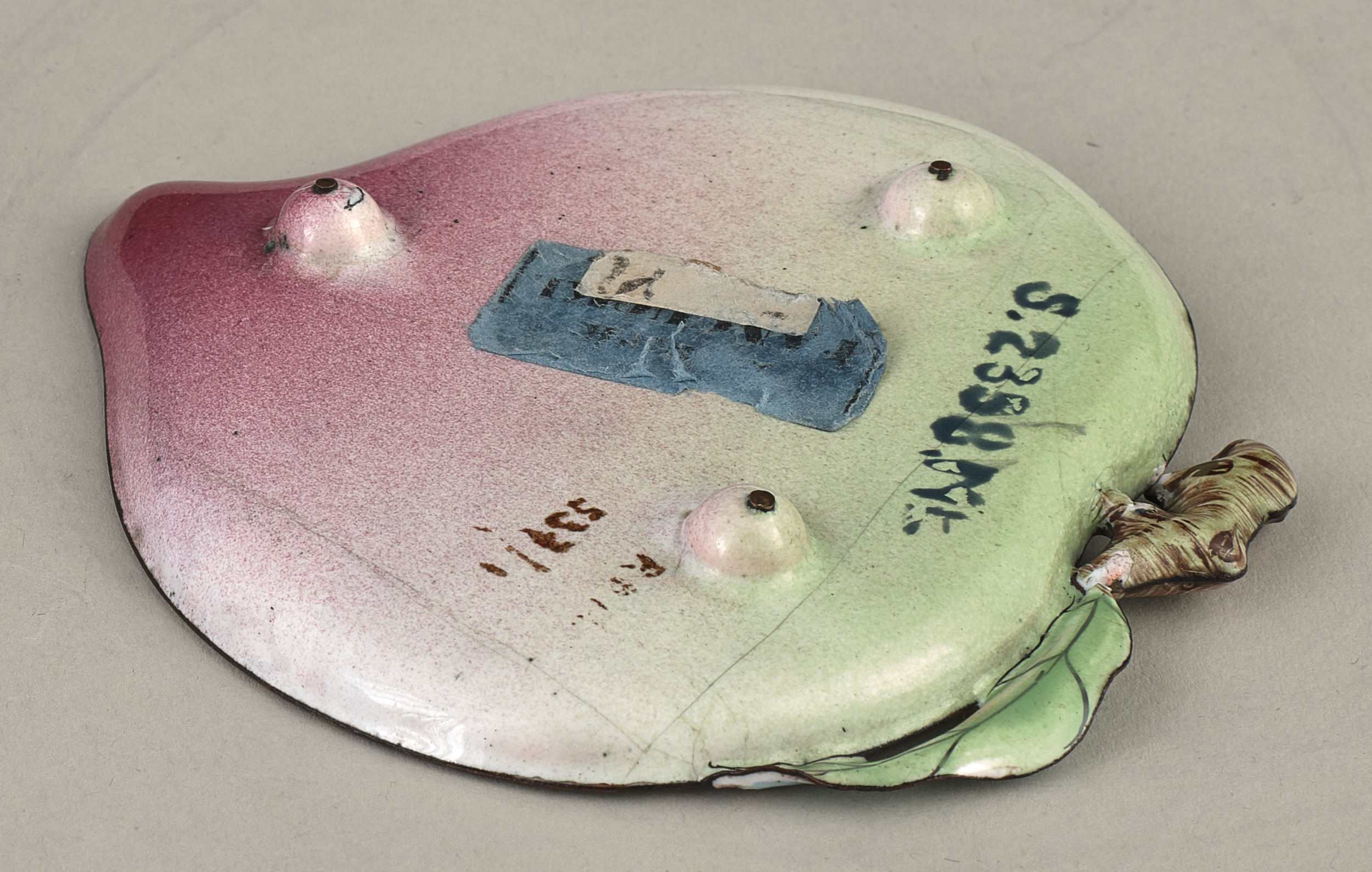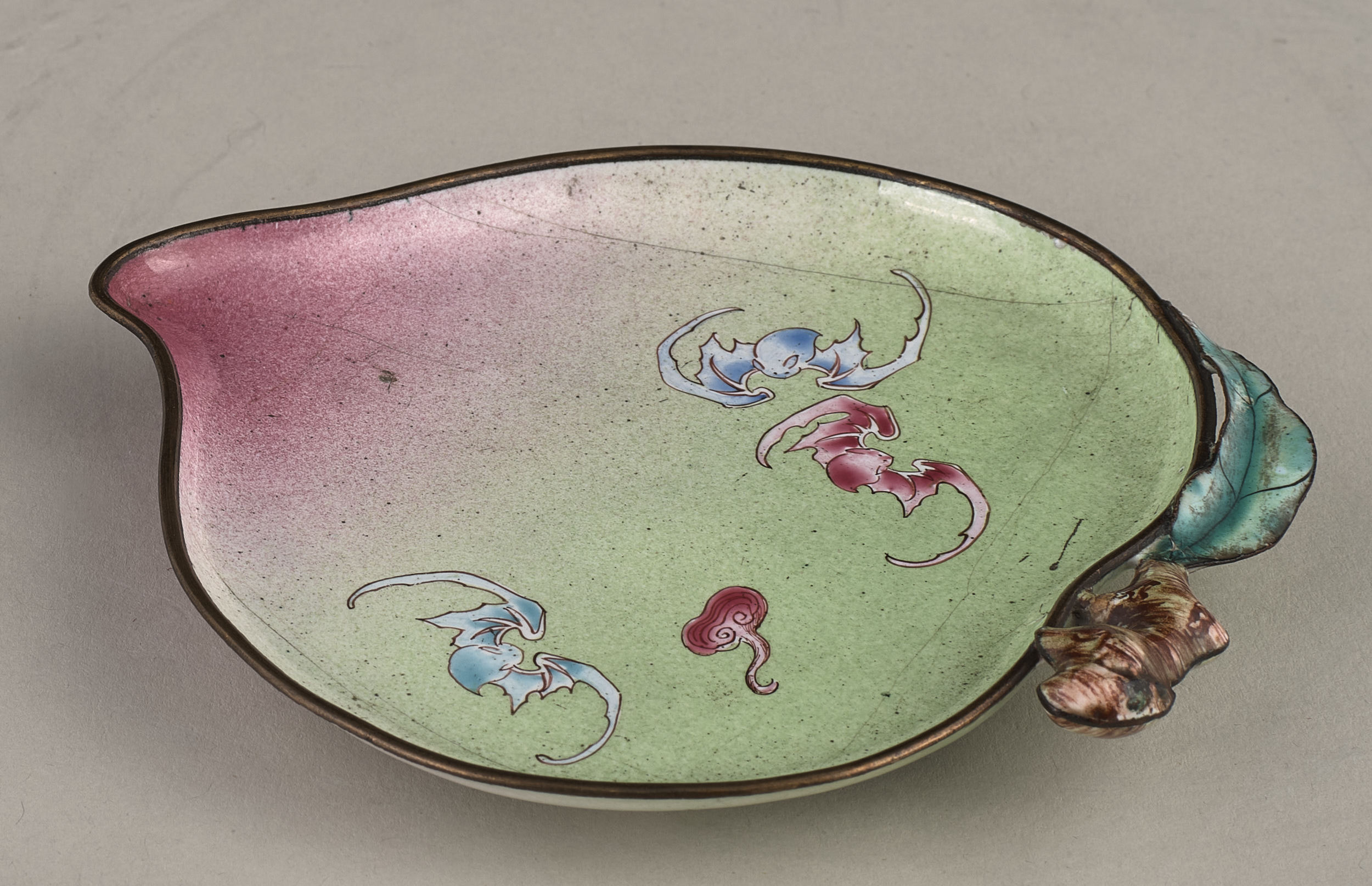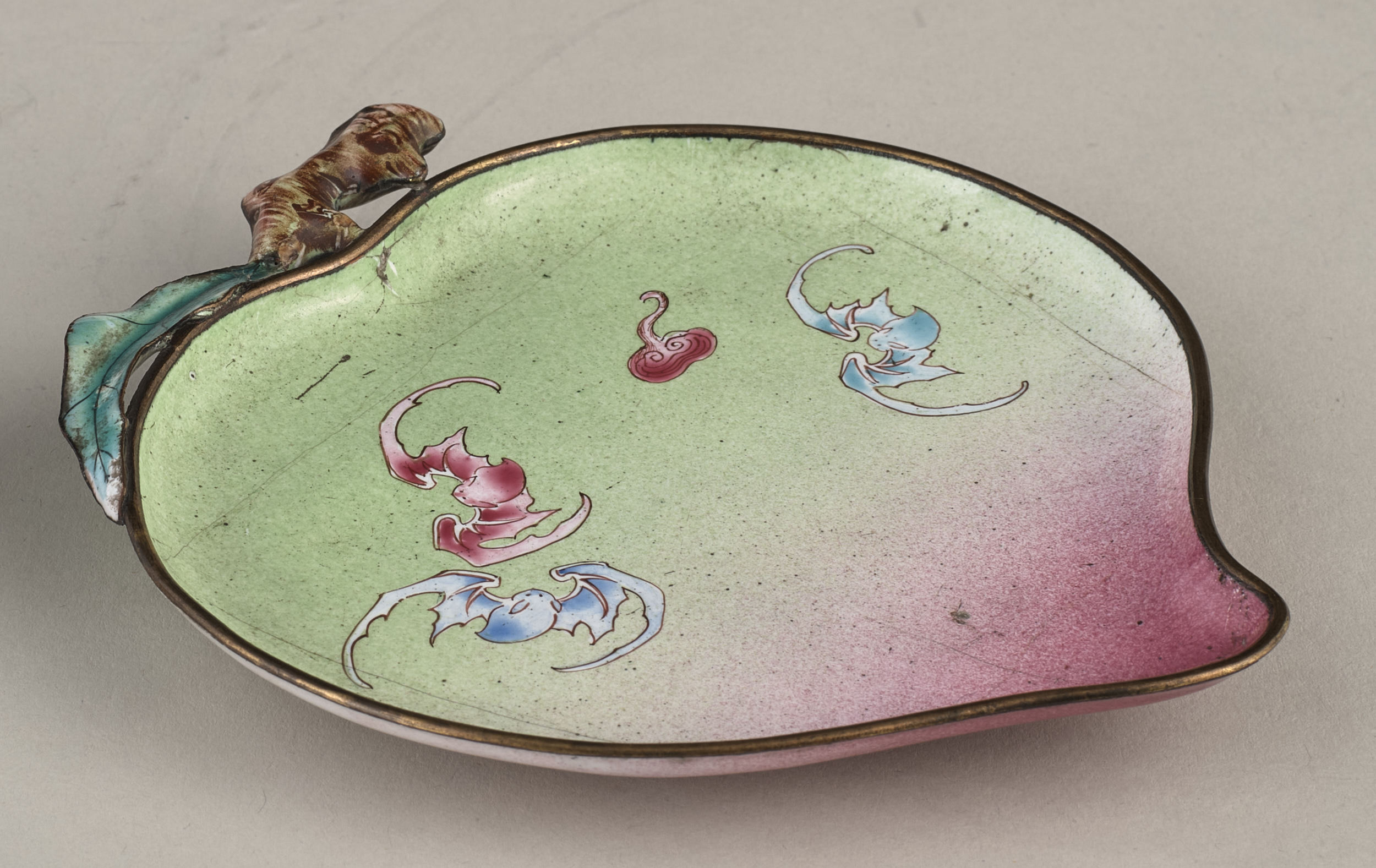 Spodek miedziany na trzech niskich nóżkach w kształcie przepołowionego owocu brzoskwini z uchwytem w formie gałązki. Pokryta została emalią typu fa-lang, z zewnątrz w kolorze zielonym przenikającym stopniowo w różowy, wewnątrz różowym. Lustro zdobione motywem trzech nietoperzy i stylizowanymi obłokami w kolorze silnego różu. Czareczka datowana jest na XVIII/XIX wiek. Według symboliki chińskiej nietoperz jest symbolem szczęścia  i długowieczności. Nietoperz w języku chińskim jest homonimem słowa „fu” - szczęście. Chiński podziw dla nietoperzy zaczął się tysiące lat przed Chrystusem. W ramach podziału świata ożywionego i nieożywionego, gdzie przeplatają się ze sobą pierwiastki męskie i żeńskie, dobro i zło, siły bierne i aktywne, nietoperzom przypisano związek z pierwiastkiem męskim, wręcz męskością jako taką. Dlatego też stworzenia te przedstawiano często w otoczeniu kwiatów i owoców związanych z pierwiastkiem żeńskim, ze światem kobiet. Nietoperze przedstawiano często z brzoskwinią, symbolem płodności. W okresie panowania Mandżurów nietoperze były w Chinach popularnym motywem zdobniczym. Dekorowano nimi wazy i czarki do herbaty, haftowano je na szatach cesarzy i rzeźbiono na meblach i tronach cesarskich.