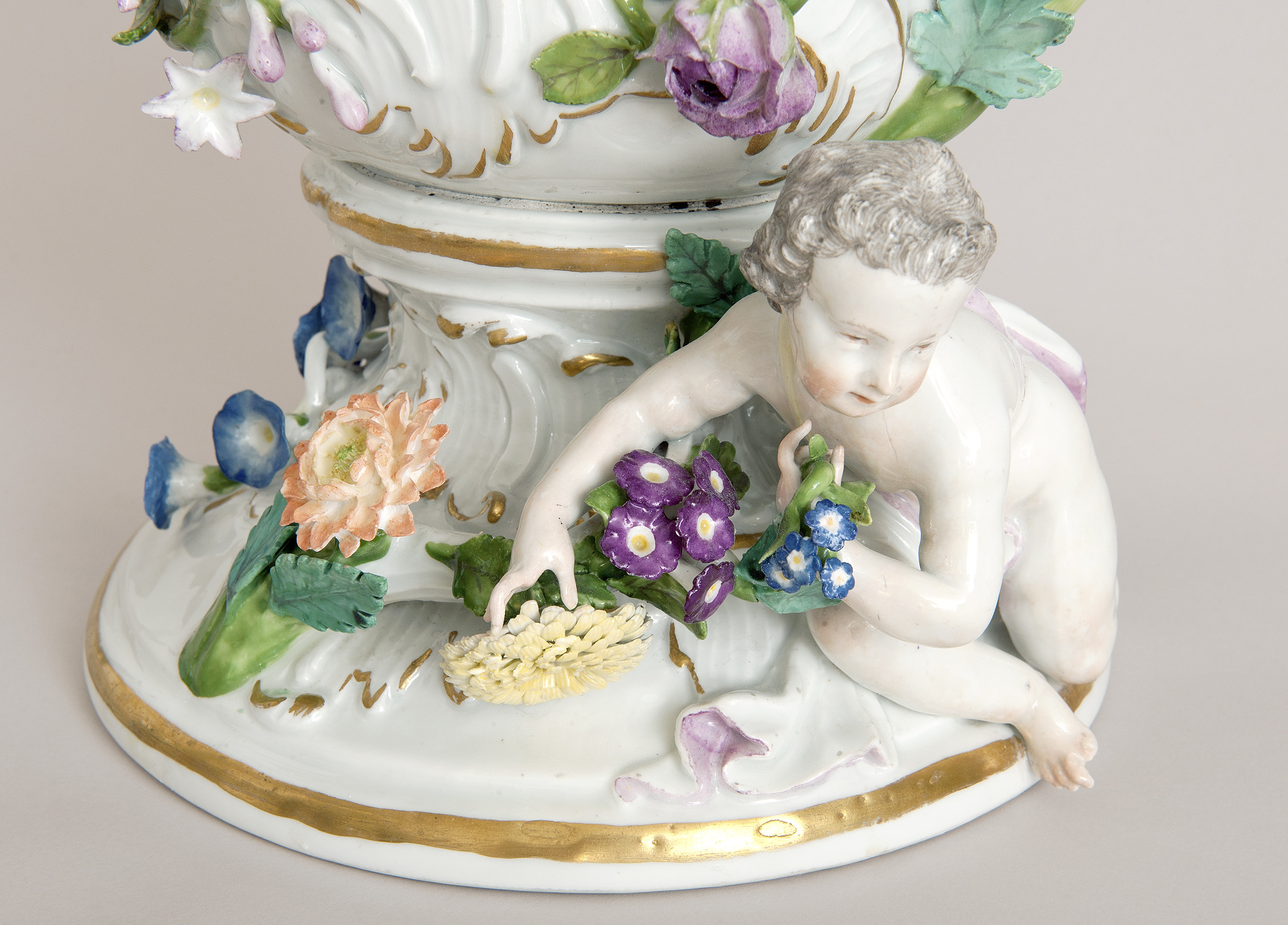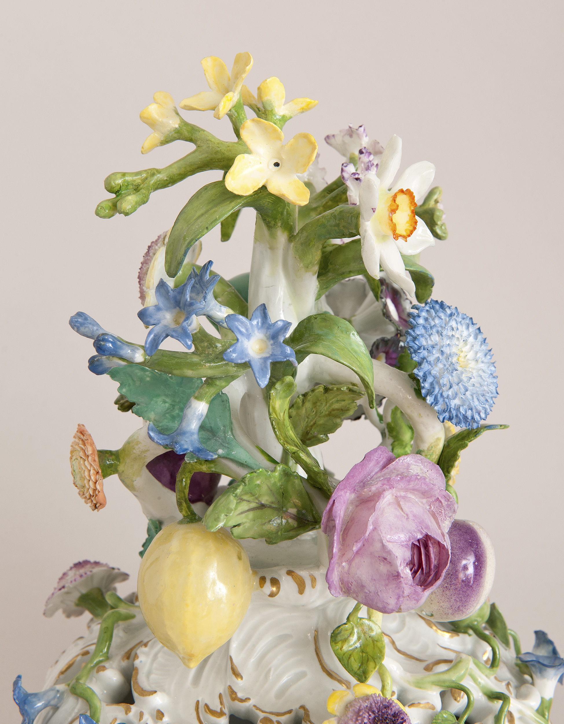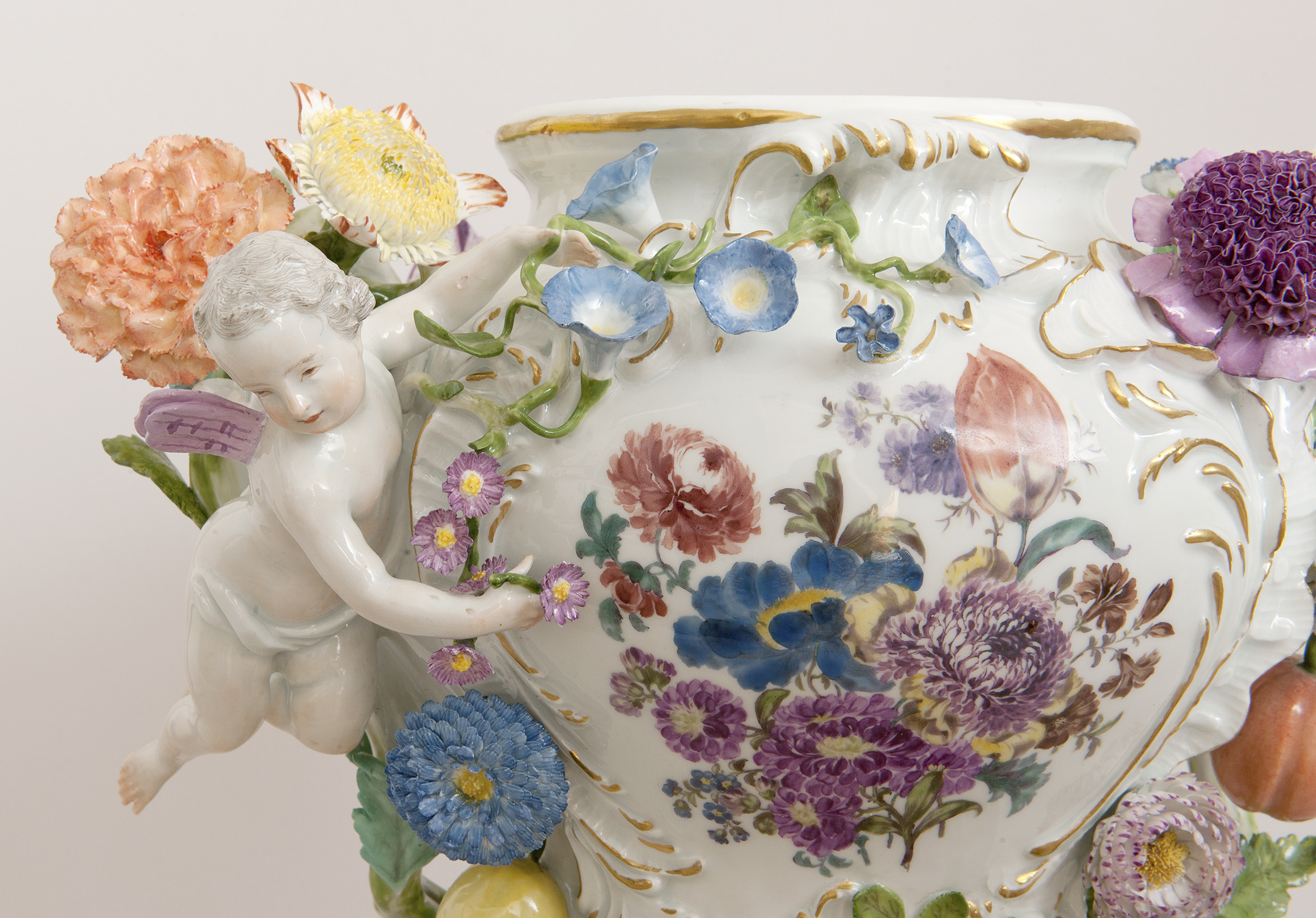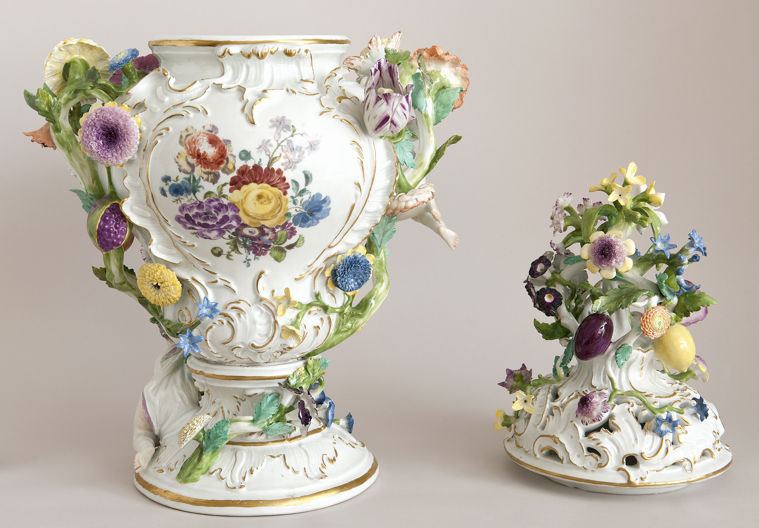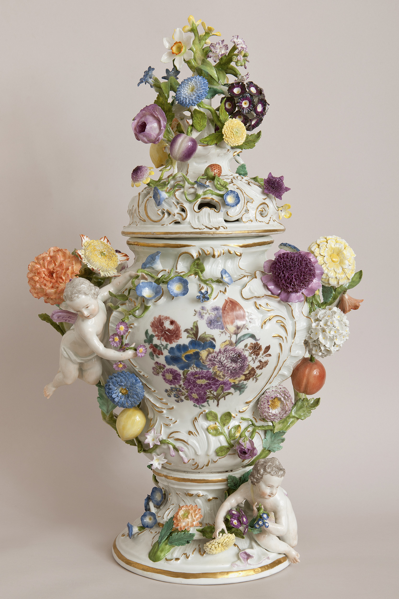 Wysoki, porcelanowy wazon z ażurową pokrywą. Takie naczynia nazywane są wazonami pot-pourri – wykorzystywano je do przechowywania pachnących mieszanek kwiatów, ziół, olejków i przypraw. Moda na naczynia z mieszanką zapachową pojawiła się już w XVII wieku, jednak to wiek XVIII przyniósł prawdziwy jej rozkwit, a prym wiódł tutaj dwór francuski. Naczynia takie stanowiły ozdobę dworskich, a później także mieszczańskich salonów, ustawiane najczęściej na gzymsach kominków. Wykonywane były z drogich materiałów, takich jak brąz złocony czy laka, a porcelana okazała się szczególnie odpowiednim tworzywem – ze względu na jej odporność na wilgoć.