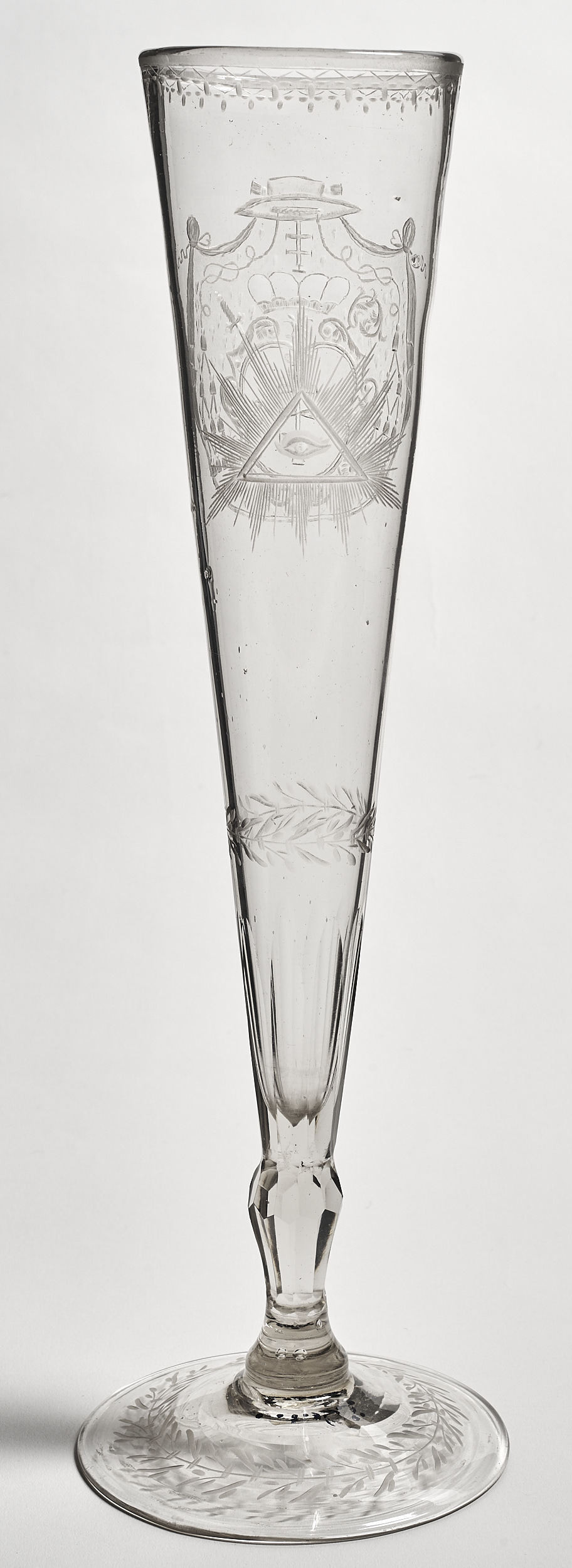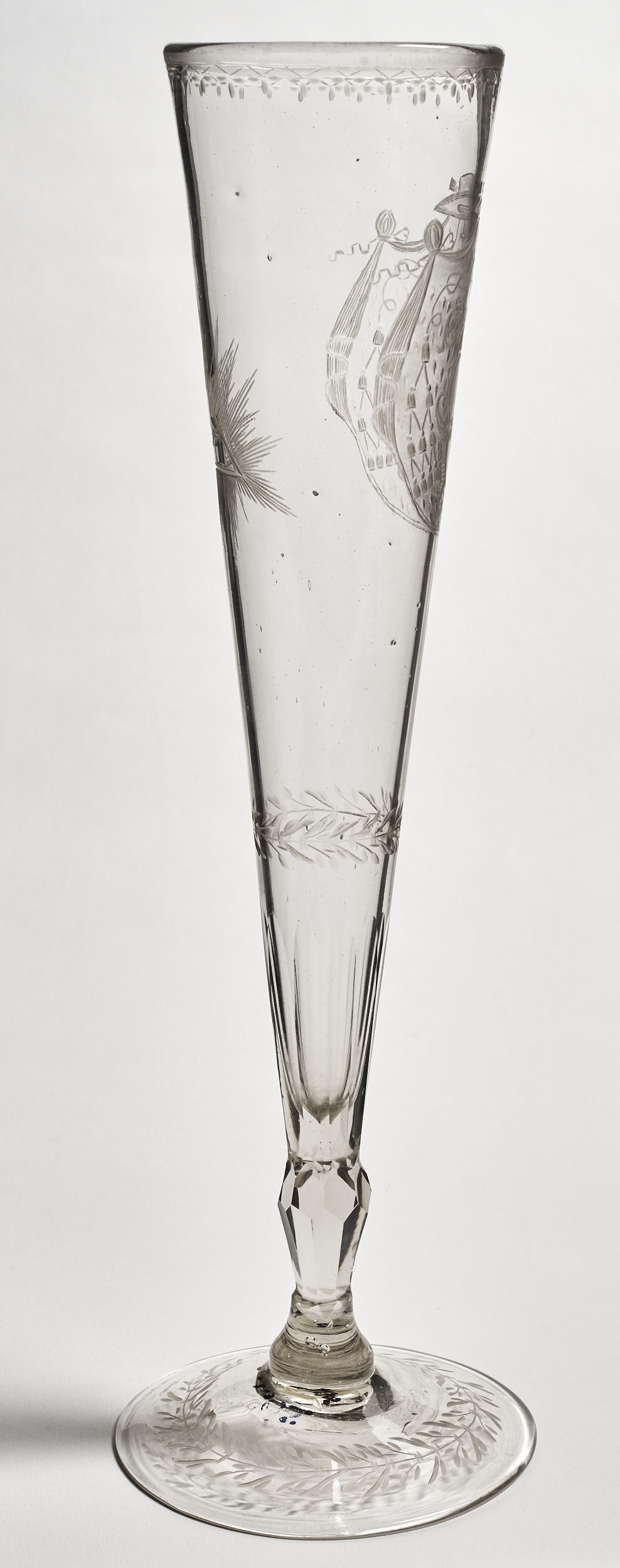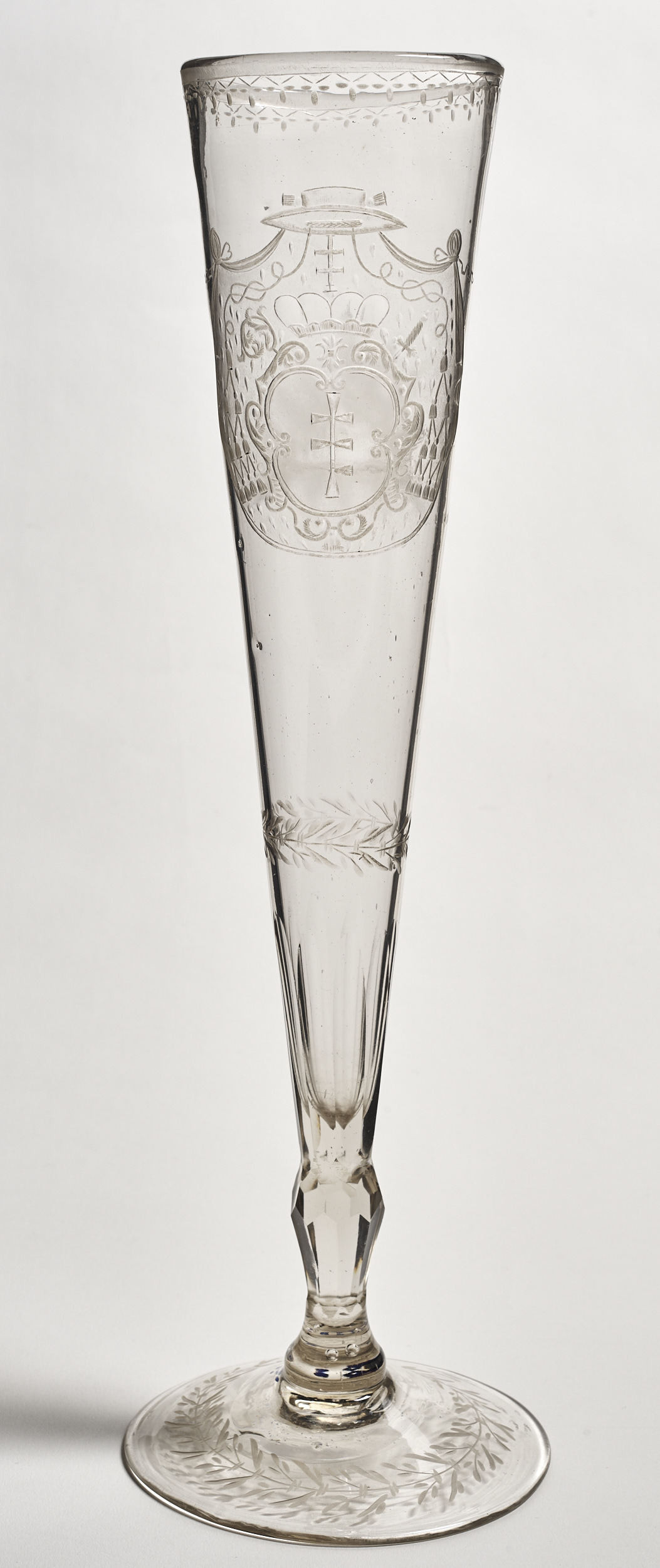 Kielich – flet wykonany został w latach 1720-1230 w manufakturze szkła pod Lubaczowem zwanej Hutą Kryształową założoną w 1717r. przez hetmana Adama Mikołaja Sieniawskiego. Był on żonaty z Elżbietą Lubomirską, córką Stanisława Herakliusza Lubomirskiego, właściciela Łańcuta w latach 1699-1702.W zbiorach szkła polskiego w Łańcucie najliczniejsza jest grupa zabytków z tejże pobliskiej huty. Była to jedna z najstarszych polskich manufaktur szkła, która w produkcji swoich wyrobów osiągnęła bardzo wysoki, europejski poziom ich wykonania. Kierował nią Franciszek Fremel, znakomity specjalista saski sprowadzony do Polski w 1710r. przez Augusta II Sasa. Huta czynna była przez cały wiek XVIII. Wyrabiano w niej szkła stołowe i świeczniki. Wśród rozmaitych kielichów charakterystyczne były flety do szampana, o wąskiej i wysmukłej czarze na tralkowym trzonie i okrągłej stopie. Powyższy kielich wykonany został z bezbarwnego szkła. Jest to kielich z okrągłą stopą, z tralkowym trzonem z pełnego szkła, o wysmukłej, stożkowej czarze. Nasadę czary i trzon zdobi szlif fasetowy. Z przodu czara zdobiona jest rżniętym kartuszem barokowym z herbem prymasa Teodora Potockiego – Pilawą, zwieńczonym mitrą książęcą, na tle płaszcza gronostajowego. Nad płaszczem kapelusz kardynalski z rozmieszczonymi symetrycznie dwoma sznurami ze zwisającymi dziesięcioma chwostami. Z tyłu czary Oko Opatrzności. Stopę zdobi wić gałązki roślinnej. Podobny motyw na czarze.
