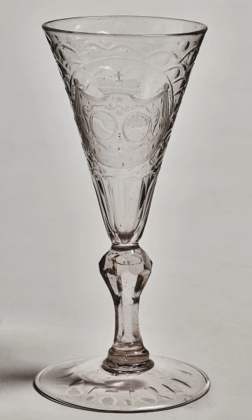Kieliszek do wina z herbami Szreniawa i Mniszech. Kieliszek do wina wykonany został około 1725 r. w manufakturze szkła pod Lubaczowem zwanej Hutą Kryształową, założoną w 1717 r. przez hetmana Adama Mikołaja Sieniawskiego. Był on żonaty z Elżbietą Lubomirską, córką Stanisława Herakliusza Lubomirskiego, właściciela Łańcuta w latach 1699-1702. W zbiorach szkła polskiego w Łańcucie najliczniejsza jest grupa zabytków z tejże pobliskiej huty. Była to jedna z najstarszych manufaktur szkła, która w produkcji swoich wyrobów osiągnęła bardzo wysoki, europejski poziom ich wykonania. Kierował nią Franciszek Fremel, znakomity specjalista saski sprowadzony do Polski w 1710 r. przez Augusta II Sasa. Huta czynna była przez cały wiek XVIII. Wyrabiano w niej szkła stołowe i świeczniki. Powyższy kieliszek wykonany został ze szkła cienko wydmuchanego, zabarwionego fioletem. Jest to kieliszek z dużą, okrągłą stopą, z tralkowym, fasetowanym trzonem, o stożkowej czarze szlifowanej we wzór „karpiej łuski”, dołem z pionowymi fasetami. Czara zdobiona jest z przodu dwoma kartuszami z herbami: Szreniawa i Mniszech – Józefa i Teresy z Mniszchów Lubomirskich, umieszczonymi w rezerwowym medalionie, na tle udrapowanego płaszcza gronostajowego zwieńczonego mitrą książęcą. Dno stopy od spodu oszlifowane jest owalnymi, promieniście ułożonymi fasetami. W zbiorach Muzeum – Zamku w Łańcucie znajdują się cztery takie kieliszki.