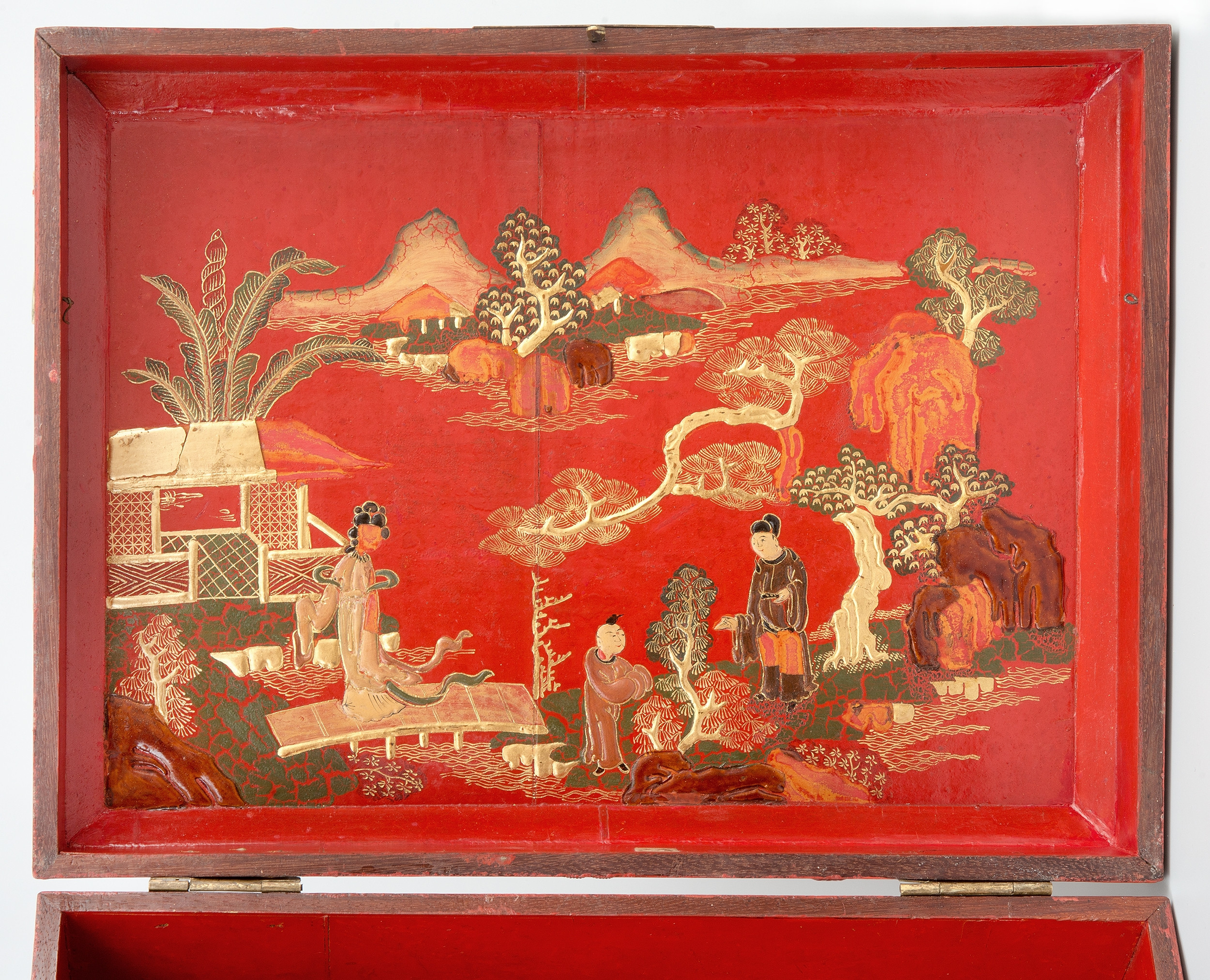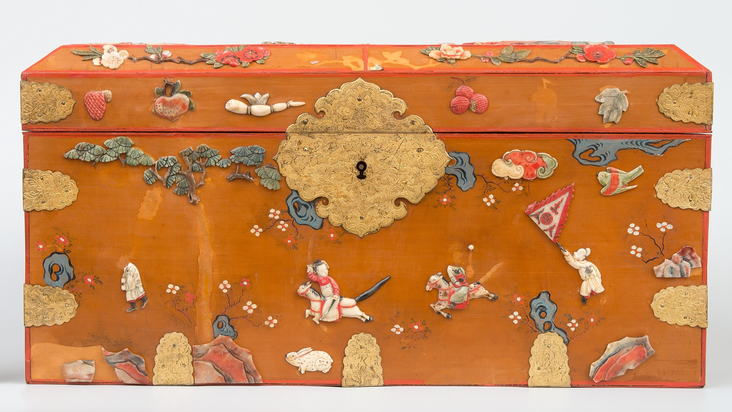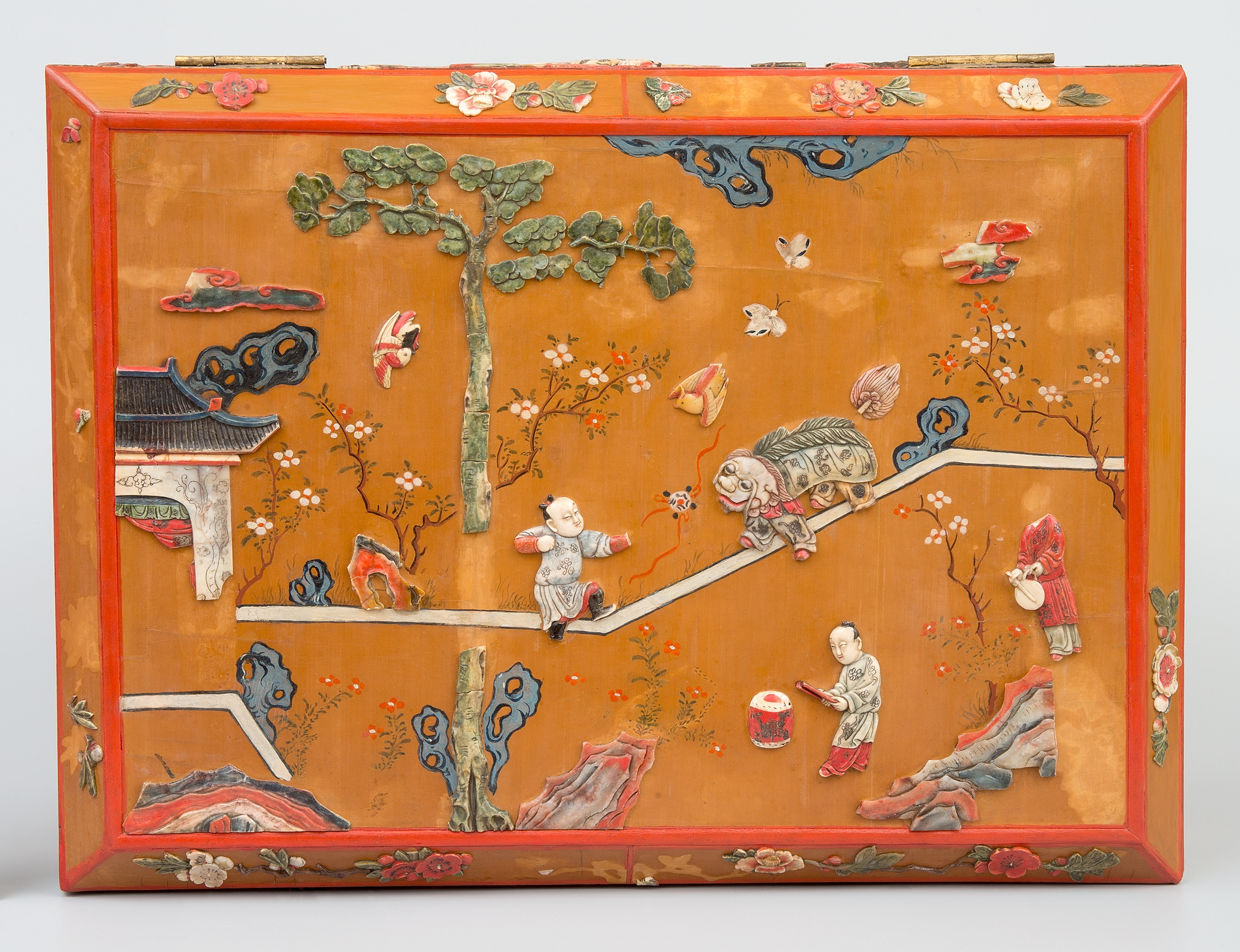 Prostopadłościenna drewniana szkatuła dekorowana laką i słonińcem. Powierzchnia puzdra została pokryta imitacją laki oraz bogactwem rzeźbionych i polichromowanych dekoracji wykonanych w kamieniu mydlanym. Front szkatuły zdobi metalowe okucie z zameczkiem, z tyłu umieszczono dwa dekoracyjne zawiasy. Po bokach pudełka zamontowano półokrągłe uchwyty z rozetkami. Wszystkie krawędzie naczynia zaakcentowano czerwienią. Dodatkowo wzmocniono i ozdobiono je podłużnymi okuciami. Wnętrze puzdra, wypełnione czerwoną imitacją laki, zdobi dodatkowo piękna scena pejzażowo-figuralna umieszczona na spodniej stronie wieka.