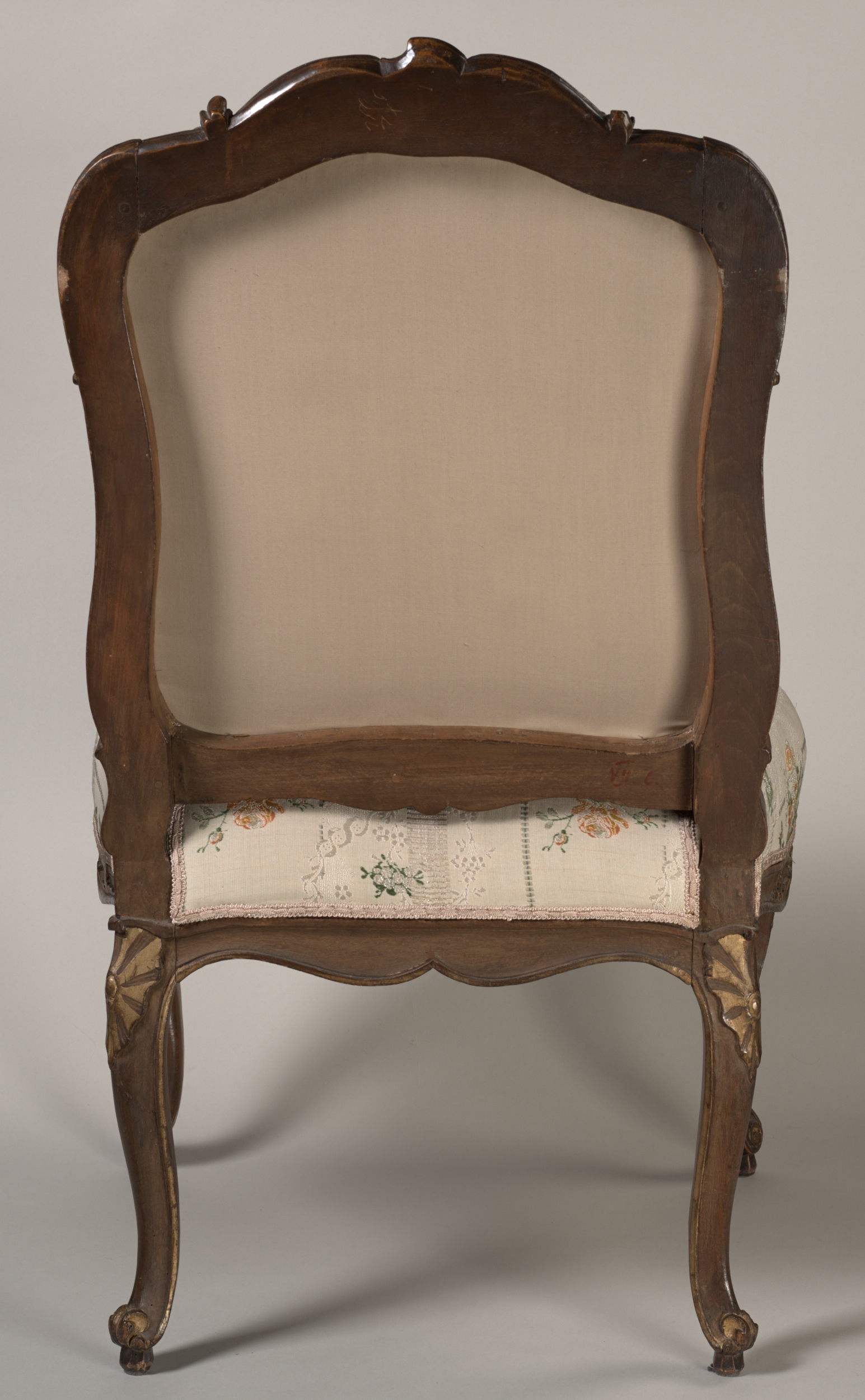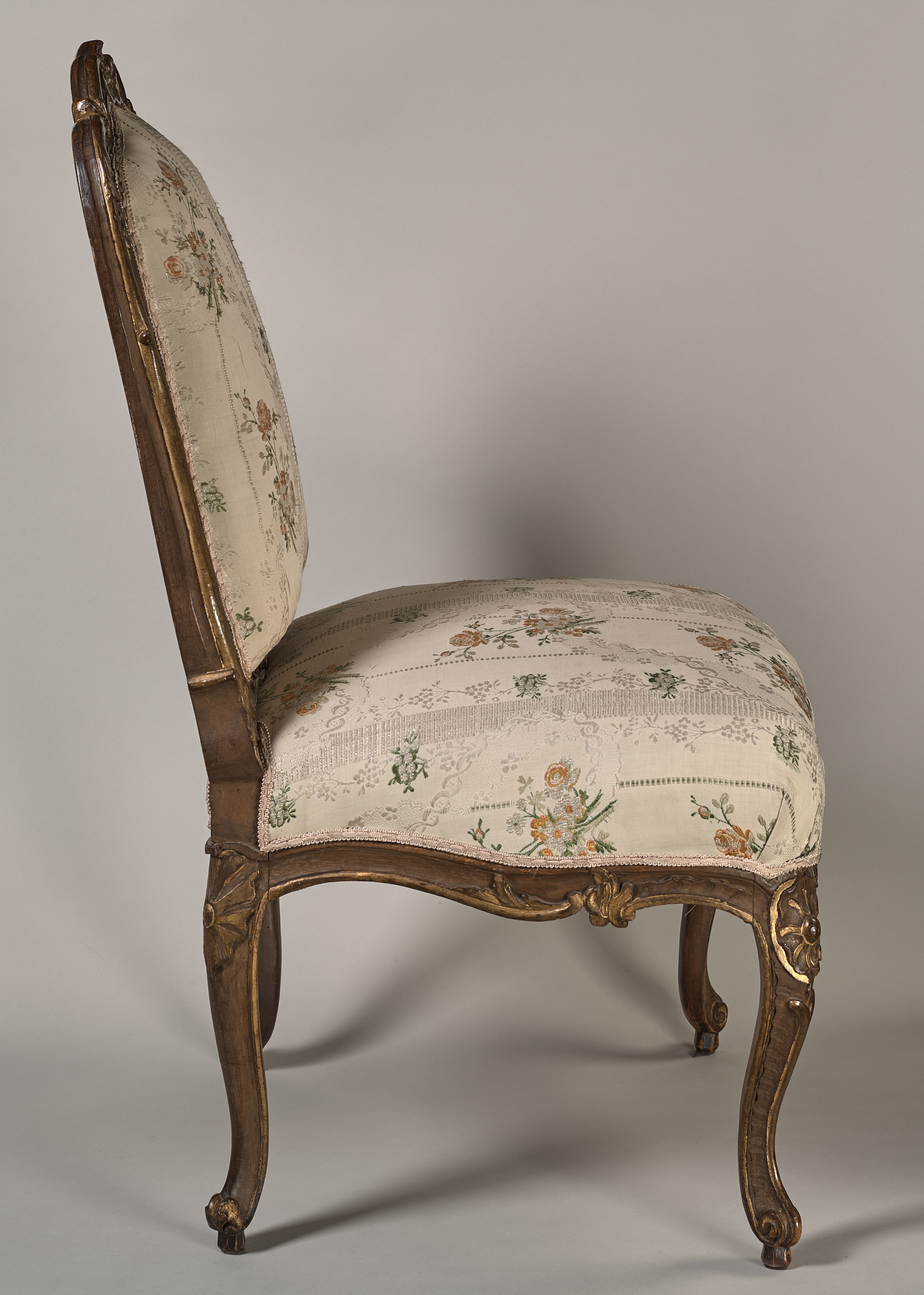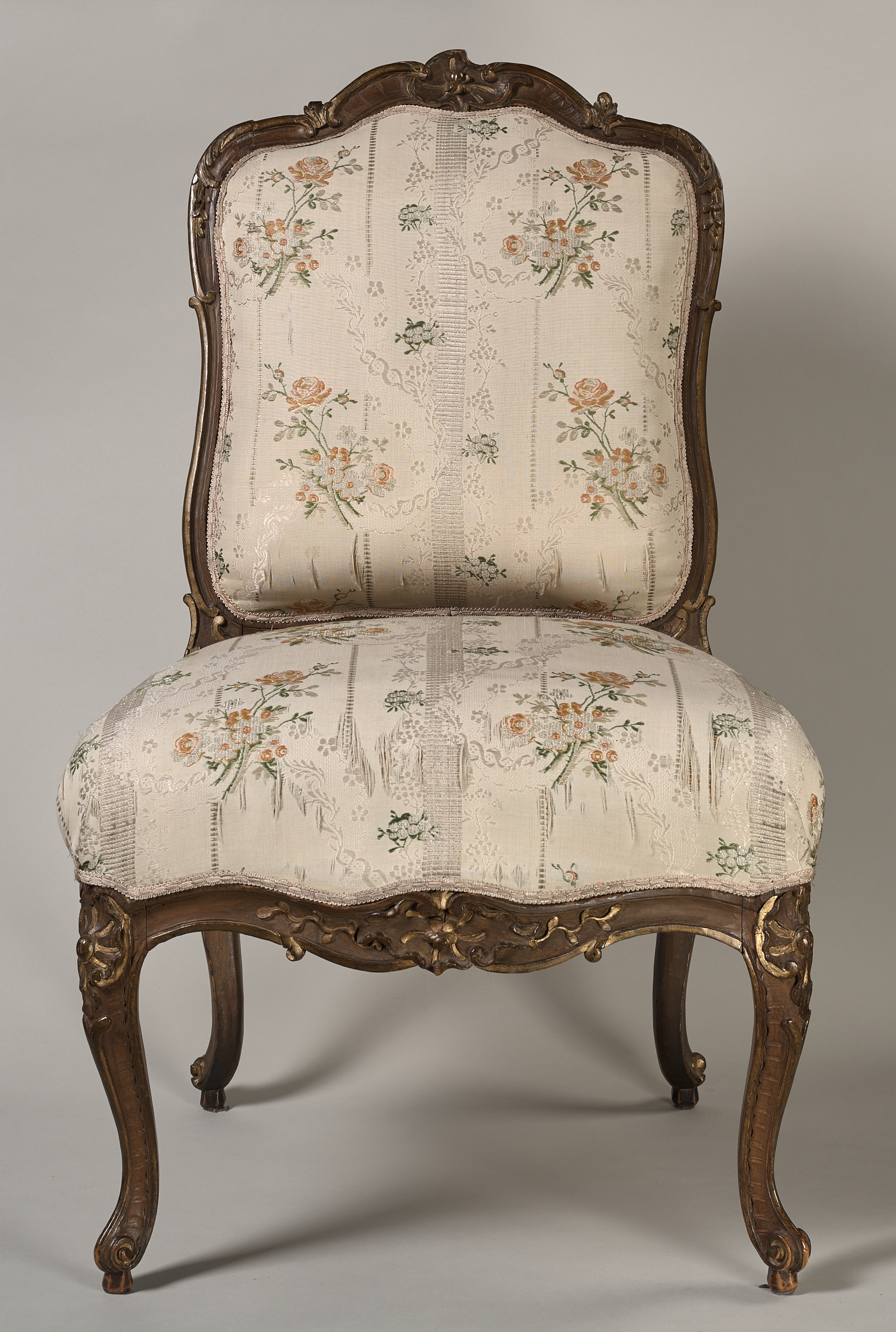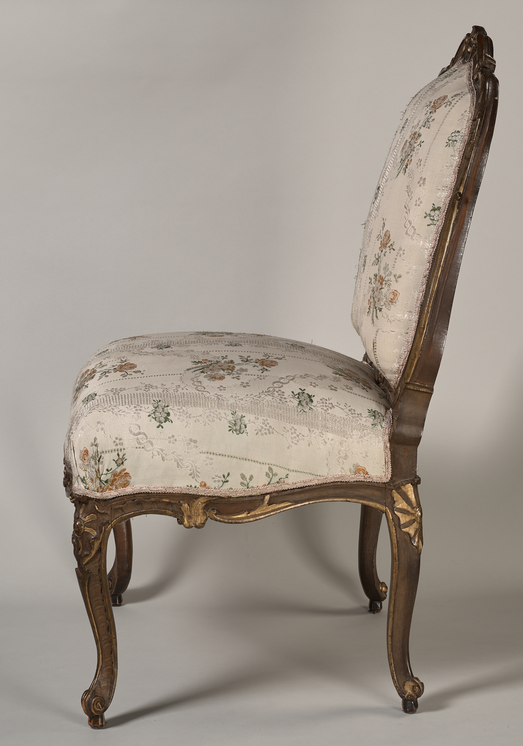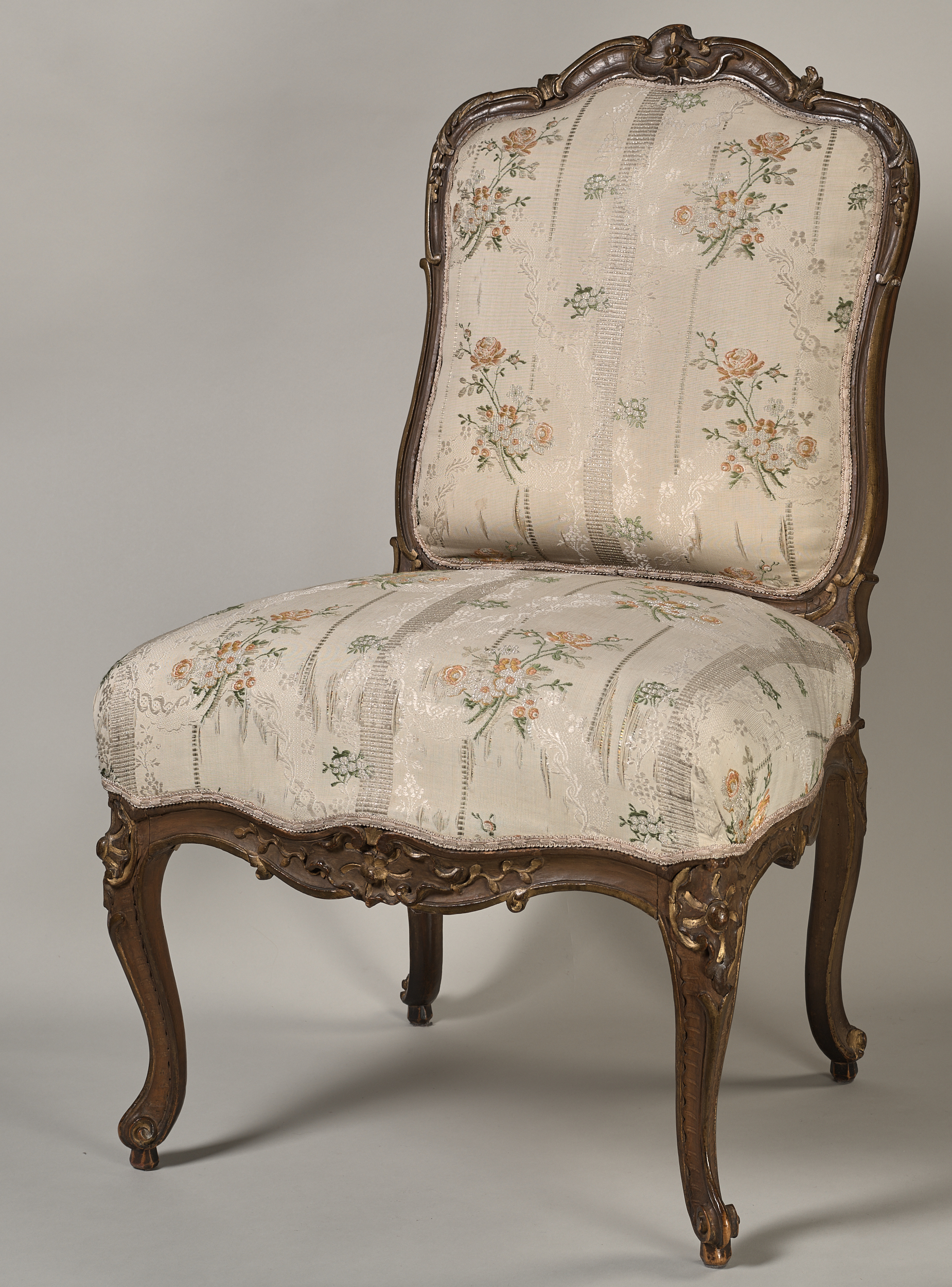 Oto krzesło. Rokokowy mebel. Skupieni na jego pochodzeniu, cechach stylistycznych, kształcie i ozdobach zapominamy, że sprzęt ten spełniał  funkcję użytkowo-reprezentacyjną. Jego szkieletowa konstrukcja jest jedną z najczęściej stosowanych w czasach nowożytnych. Podstawę siedziska tworzy oskrzynienie złożone z czterech połączonych ramiaków. Od spodu z naroży oskrzynienia wychodzą wygięte nogi, które w rokokowych krzesłach zazwyczaj nie mają łączyn. Boczne ramiaki oparcia stanowią przedłużenie tylnych nóg. Konstrukcję oparcia domykają ramiaki poziome. W prezentowanym egzemplarzu istnieje prześwit pomiędzy siedziskiem i oparciem, wykonanymi w pełnej tapicerce. Szkielet mebla jest ukształtowany i ozdobiony w typowy dla stylu rokoka sposób. Zapoczątkowany we Francji w czasach panowania króla Ludwika XV styl rokoko ogarnął całą Europę. W Austrii i na terenach pozostających pod wpływem dynastii Habsburgów, rokoko przeżywało największy rozkwit w czasach panowania cesarzowej Marii Teresy Habsburg. Od jej imienia środkowoeuropejska odmiana rokoka nazywana jest stylem Marii Teresy lub terezjańskim. W tej odmianie rokokowe dekoracje są dodatkiem do konstrukcji i nie naruszają tektoniki mebla, co widać na prezentowanym egzemplarzu.