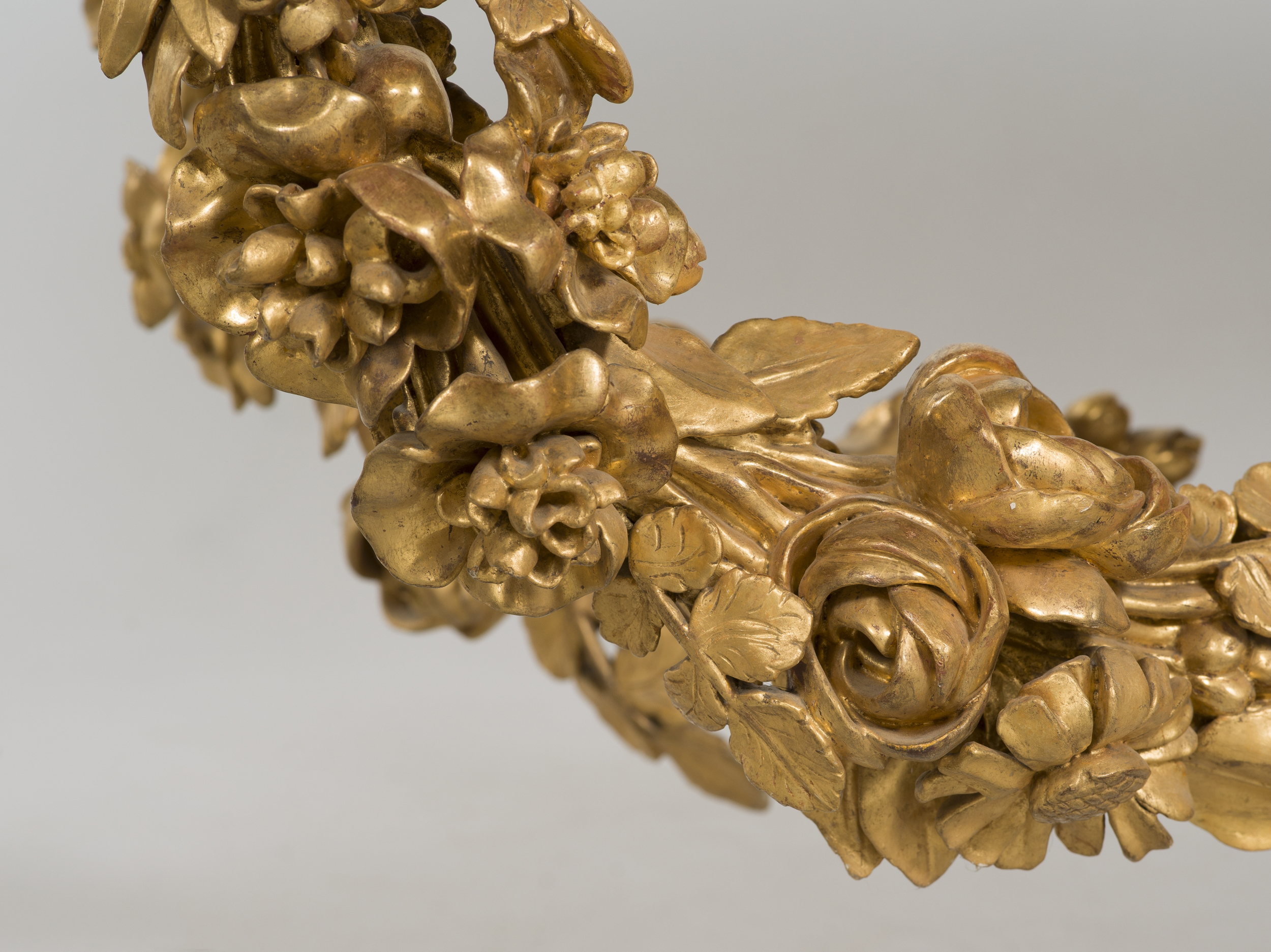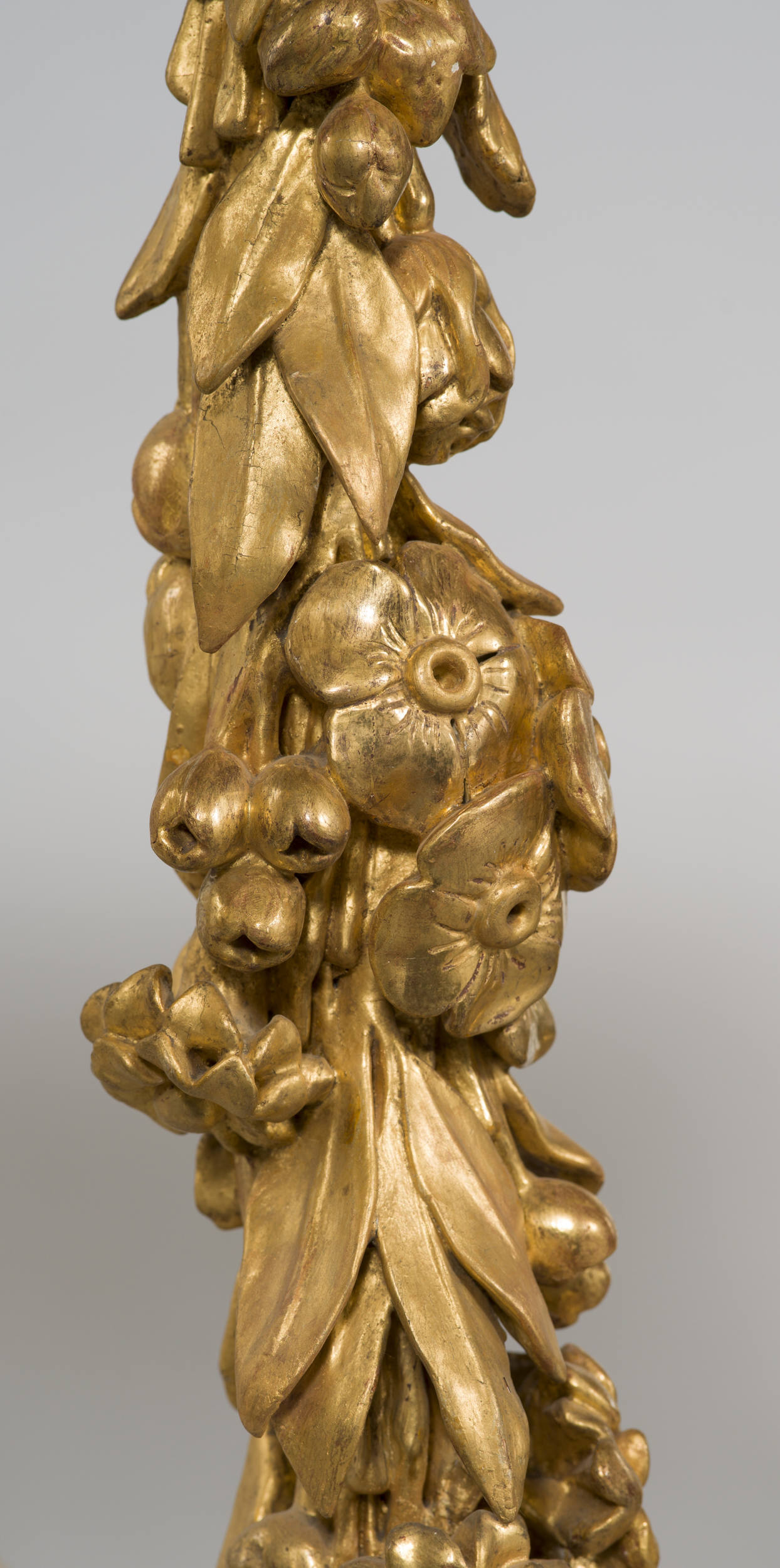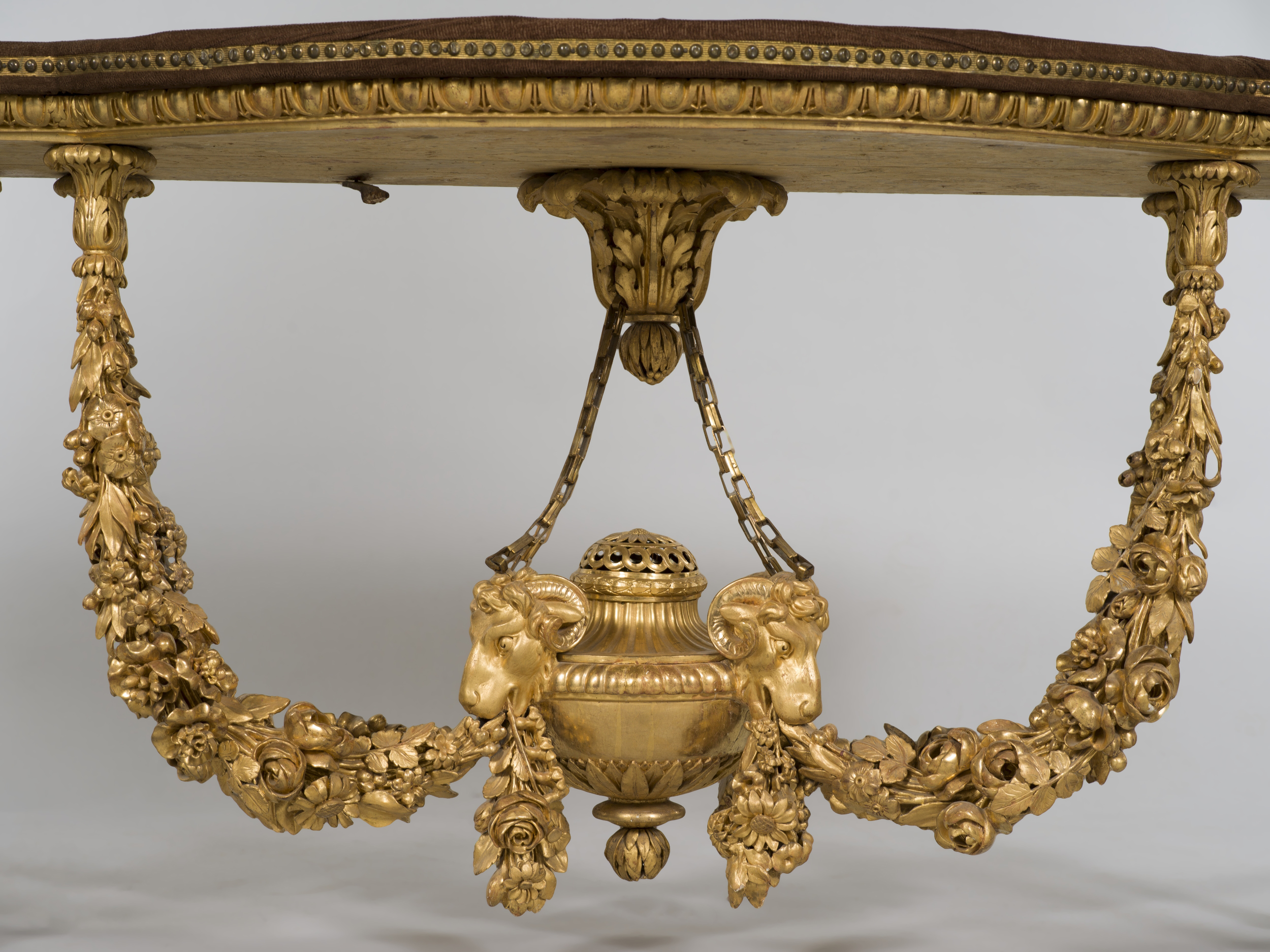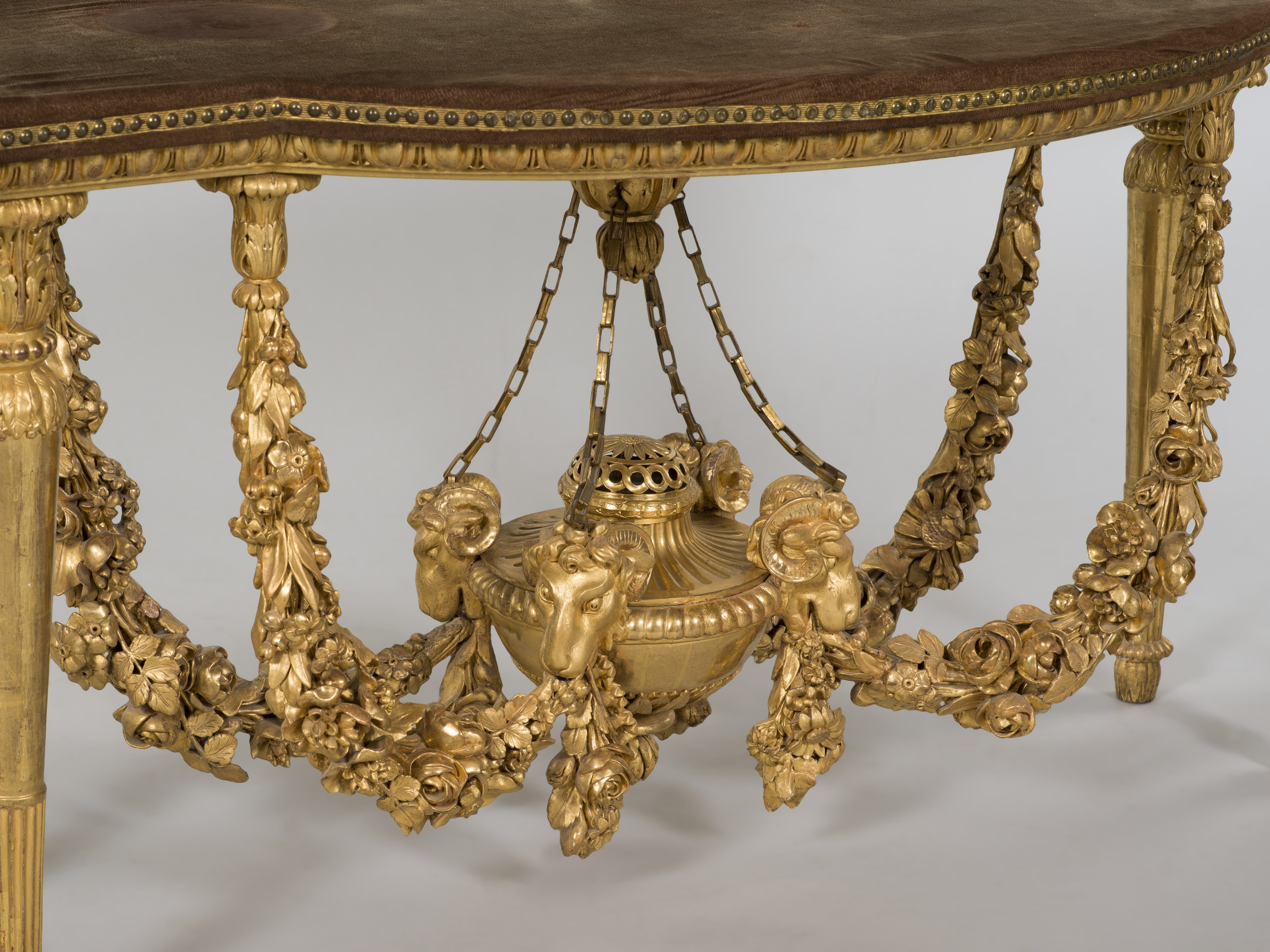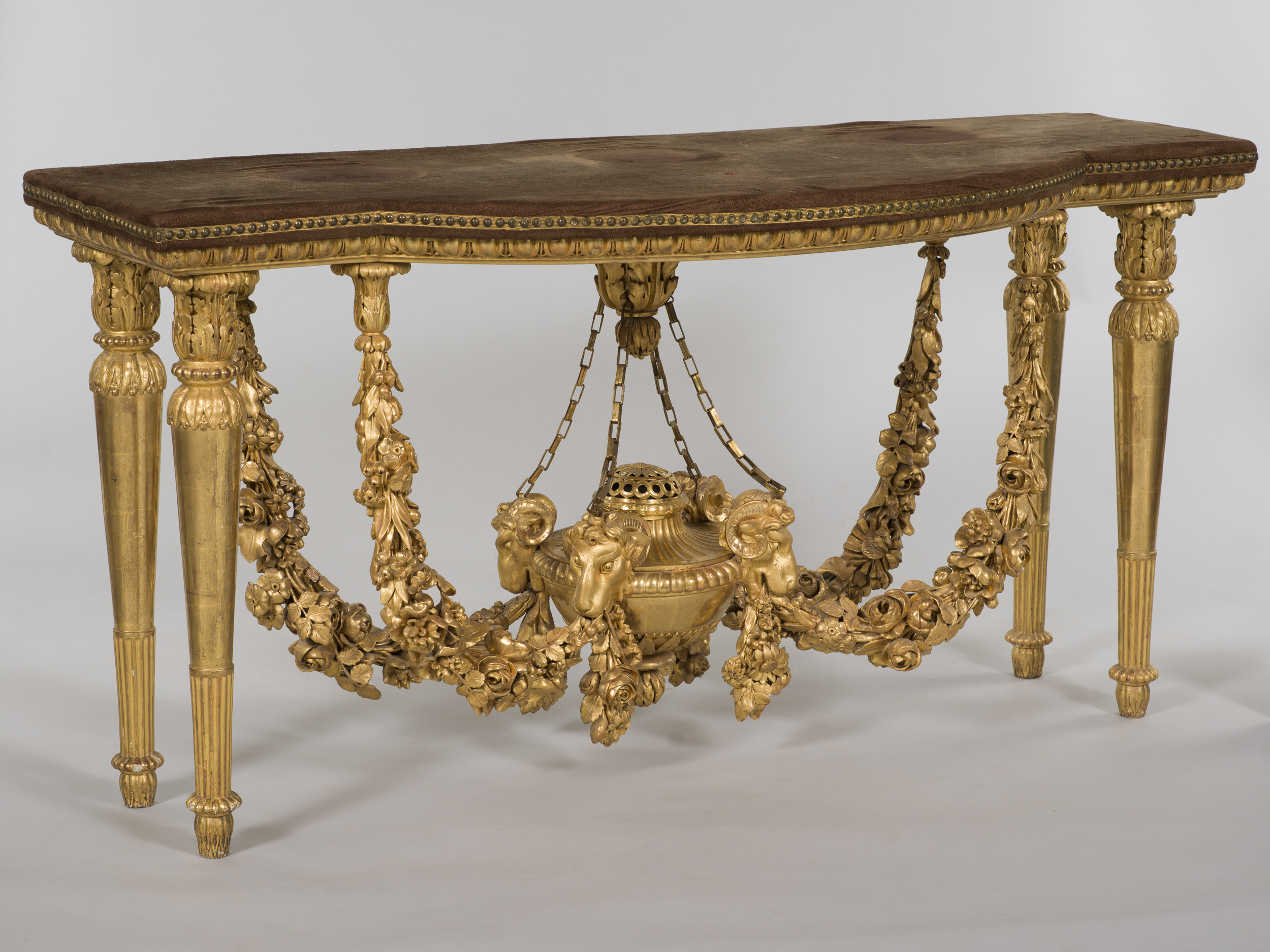 Jest meblem przyściennym (od strony ściany pozbawiony dekoracji) o konstrukcji stołu z blatem zbliżonym do prostokąta o przedniej krawędzi w części środkowej wygiętej łukowato do przodu. Rama oskrzynienia, podtrzymująca blat powtarza jego kształt. Całość wsparta jest na czterech prostych, toczonych nogach zwężających się ku dołowi. Wymienione elementy stanowią niejako konstrukcję do montażu pod blatem głównego elementu dekoracyjnego jakim jest efektowna kompozycja złożona z okazałej kadzielnicy podwieszonej na jego głównej osi połączonej z dwoma symetrycznie zwisającymi pełnoplastycznymi, bogato rozbudowanymi girlandami rzeźbionymi w drewnie. Dla podniesienia walorów artystycznych mebla zestawiono połączenie elementów rzeźbionych w drewnie z metalowymi - kadzielnicę i łańcuchy na której zawisła wykonano z brązu złoconego. Stylizacja dekoracji nawiązuje do wzorów antycznych; metalowa kadzielnica w kształcie wazonu z dwoma uchwytami w kształcie antycznych bukarionów – głów baranich podtrzymujących w pyskach końcówki girland, ramę oskrzynienia na wzór antycznego gzymsu zdobi motyw tzw. wolich oczu stosowany w architekturze greckiej, toczone w części dolnej kanelowane nogi w swej górnej części zdobione są wiązką liści akantu nawiązującą do kapiteli korynckich kolumn.
