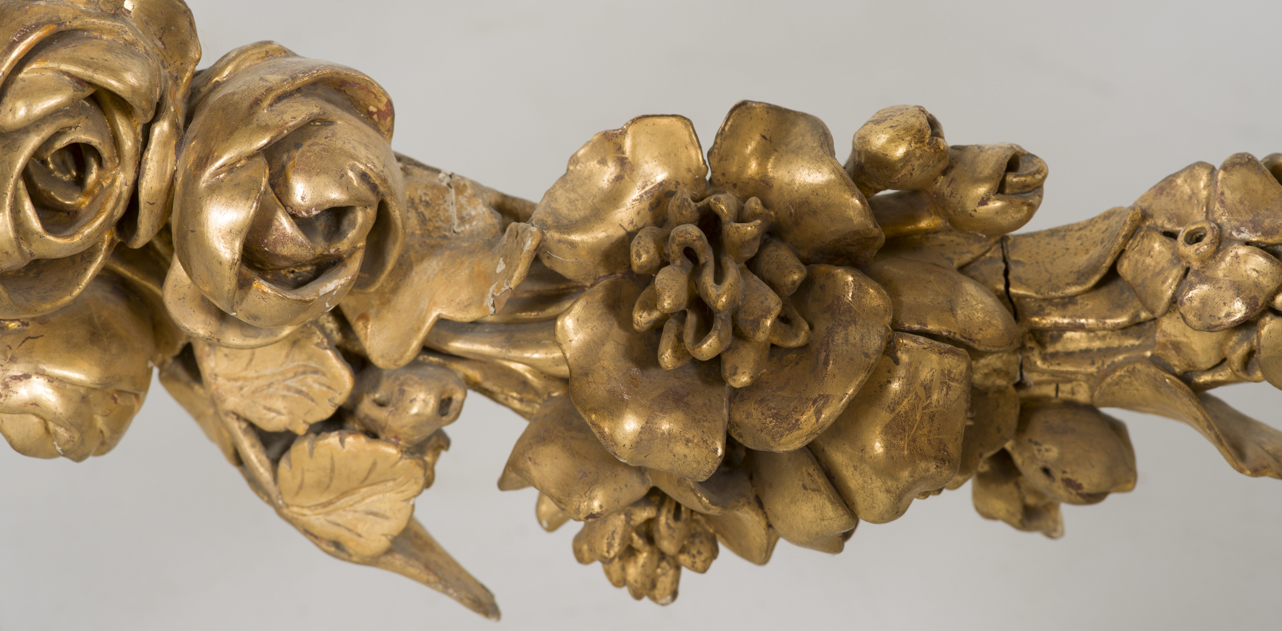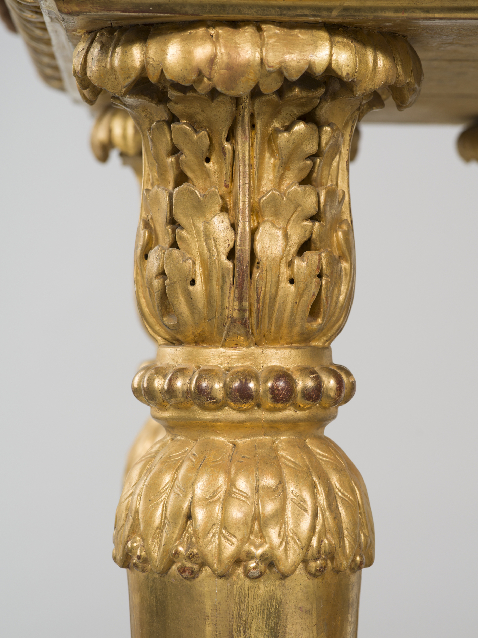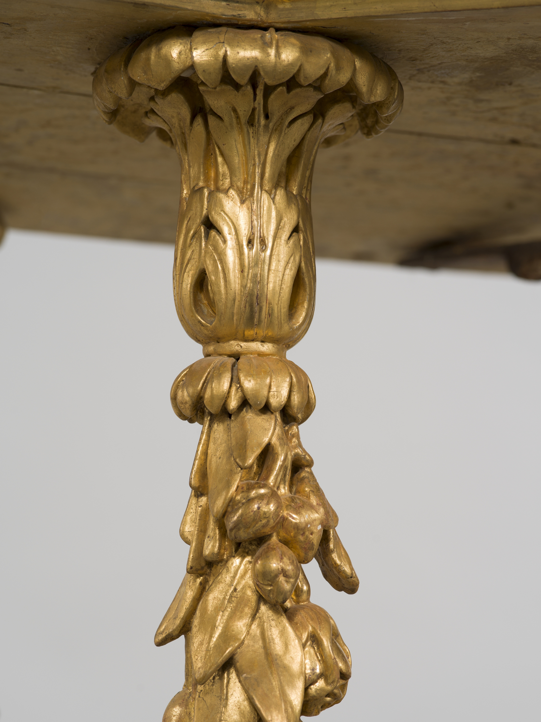 Pierwotnie marmurowy blat konsoli nie zachował się, zastąpiono go blatem drewnianym obitym aksamitem mocowanym na krawędzi dekoracyjnymi ćwiekami.