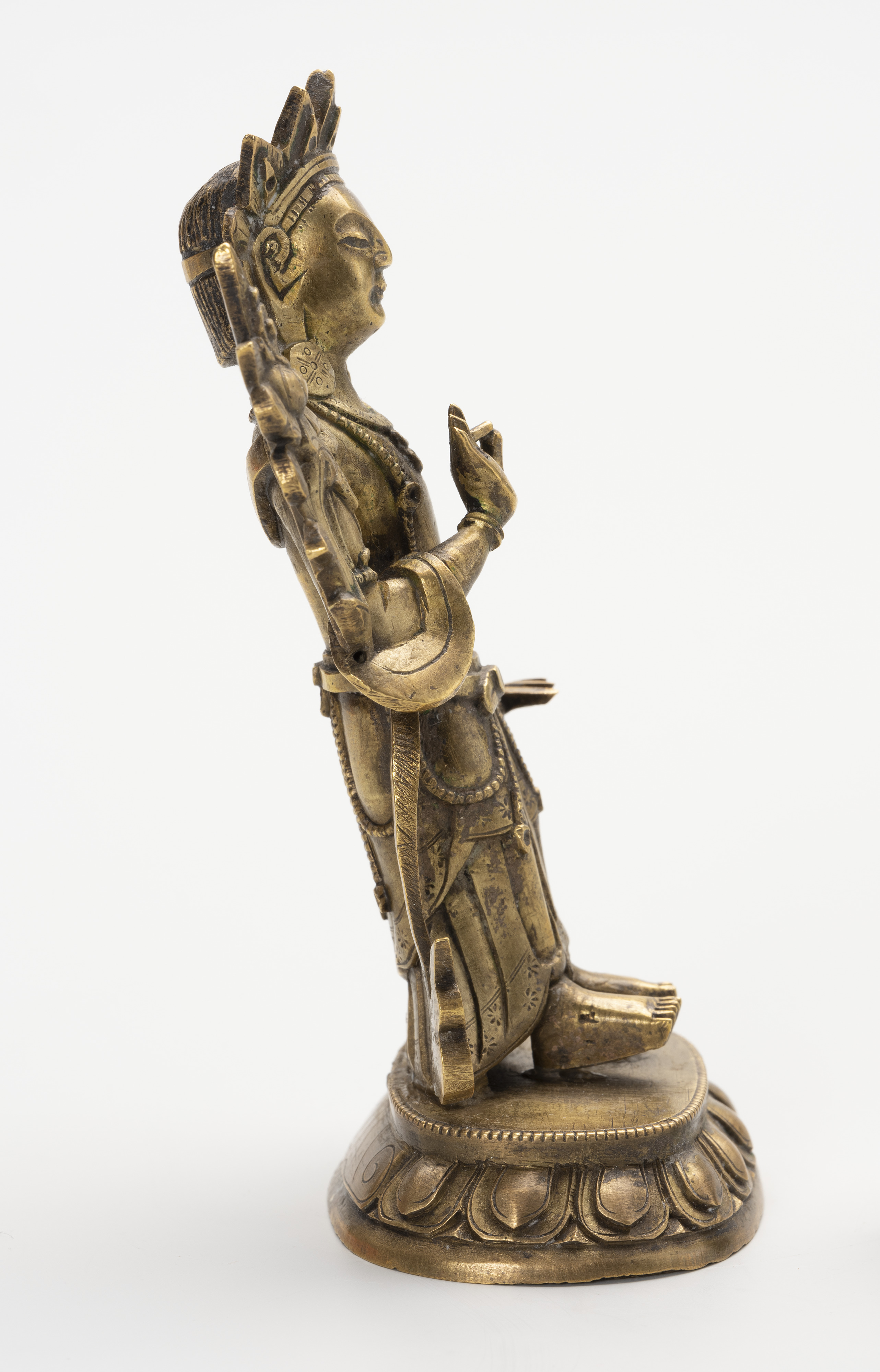Ubrana w szaty królewskie i biżuterię książęcą postać stoi na lotosowym postumencie. Kwiat lotosu wyłania się zza jej prawej ręki, którą ułożoną ma w geście argumentacji, nazywanym mudra witarka, w którym złączony czubek kciuka i palca wskazującego tworzą krąg. Ta buddyjska figurka sakralna przedstawia Bodhisattwę Awalokiteśwarę Padmapani (sanskryt Padmapāṇi, tybetański Phyag na padmo, czyli Nosiciel Lotosu lub Niosący Lotos). Padmapani to podstawowa forma Awalokiteśwary (tybetański Czenrezig) – bodhisattwy współczucia i miłosierdzia, najpopularniejszego bóstwa buddyzmu tybetańskiego, wyznawanego częściej niż samego Buddę. Znakami charakterystycznymi dla Padmapani są kwiat lotosu oraz mała figurka Buddy Amitābhy znajdująca się w diademie. Na prezentowanym przedstawieniu widoczny jest lotos oraz inny symbol Awalokiteśwary – oznaczająca współczucie skóra antylopy.