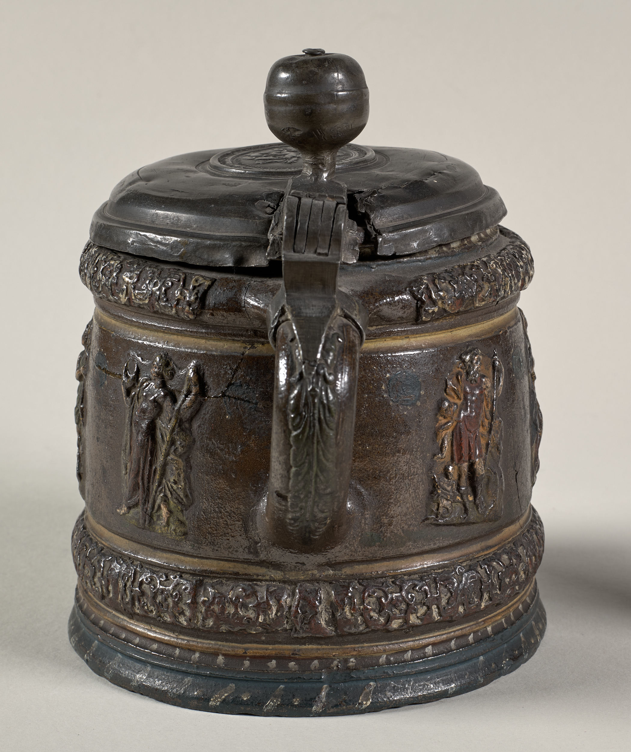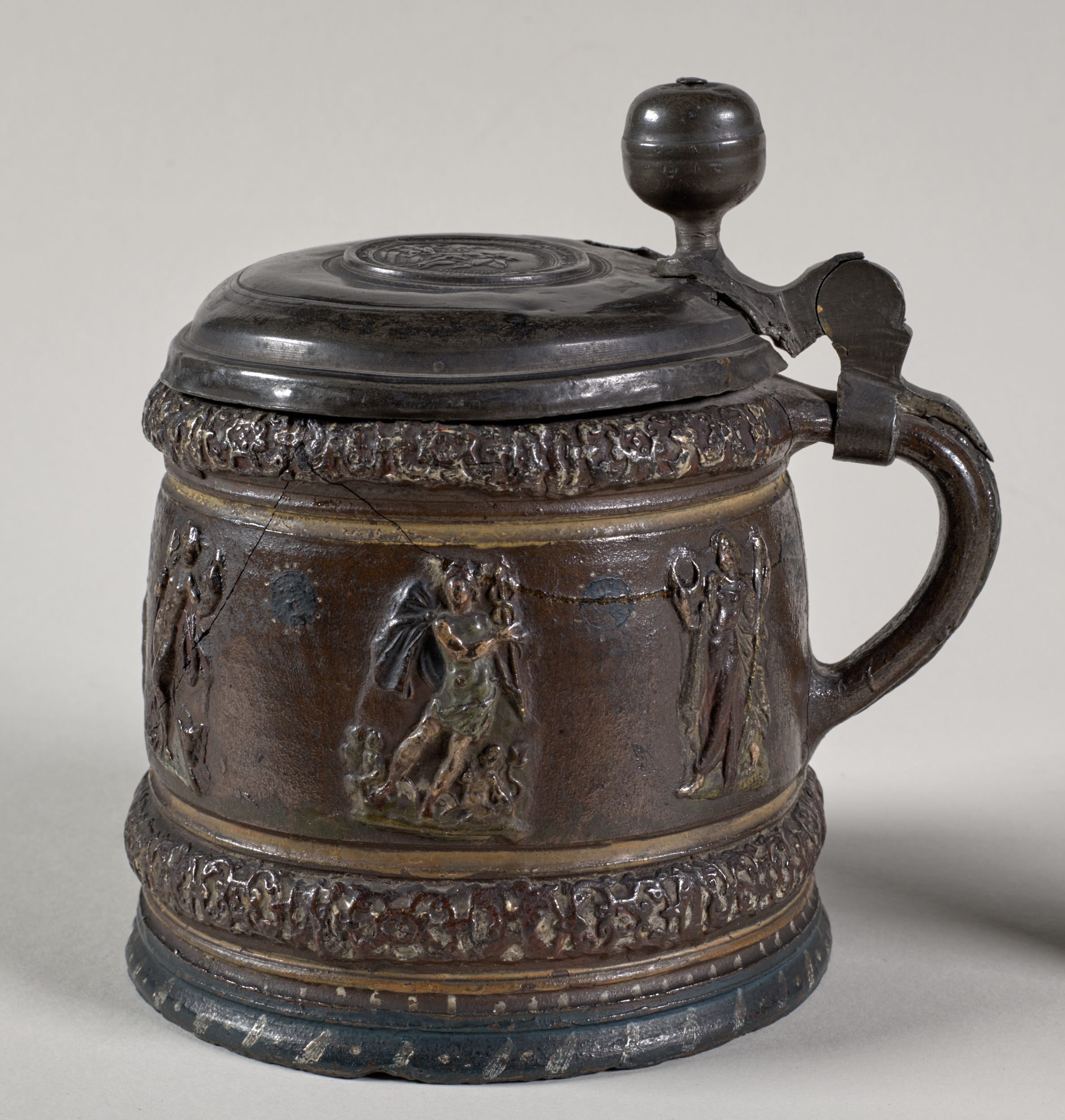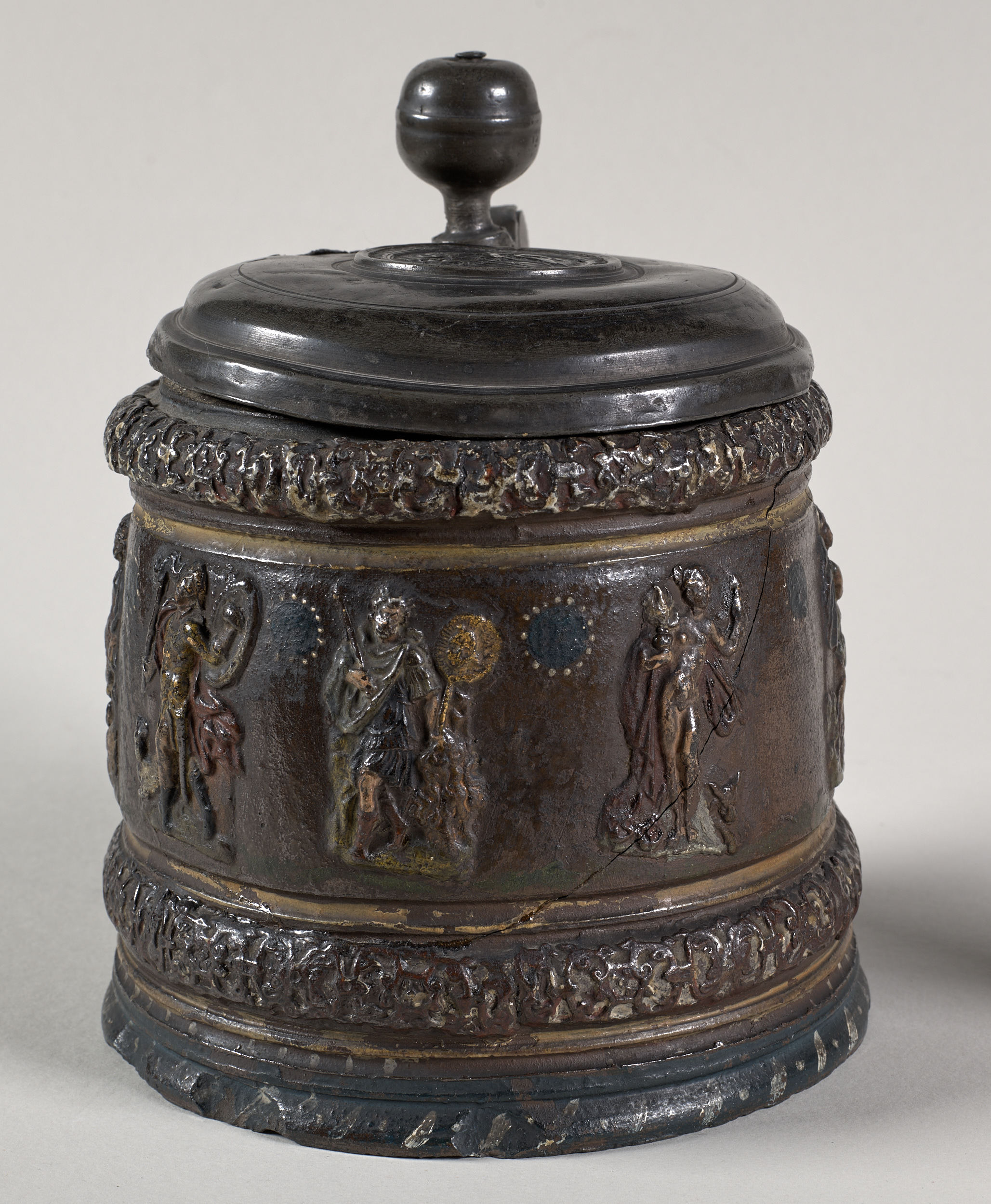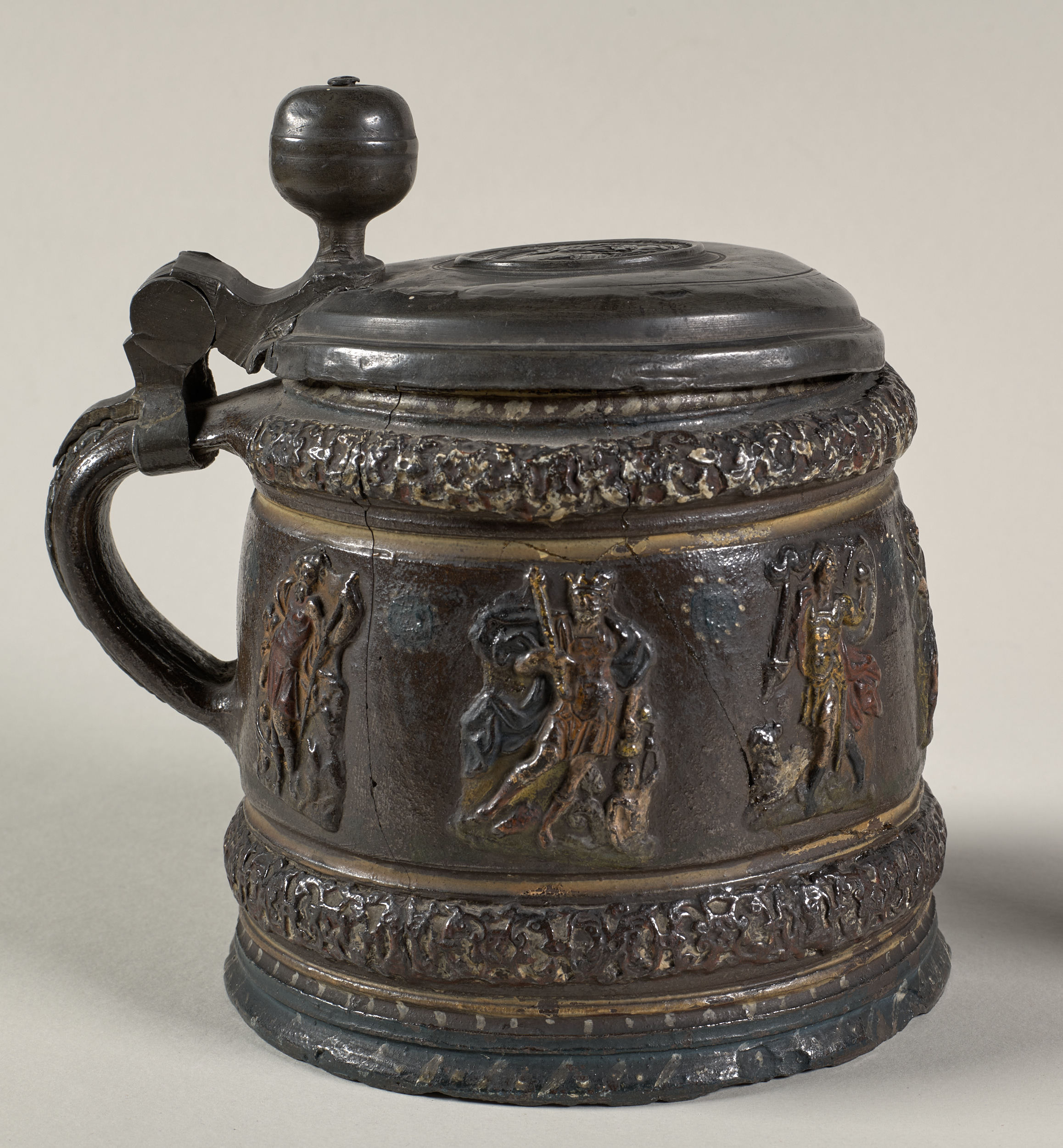 Kufel cylindryczny, lekko zwężający się ku górze, z wyodrębnionym na brzuścu pasem z pojedynczymi, siedmioma postaciami mitologicznymi, m.in. Hermesem, Jazonem, Posejdonem. Pas ten ujmują nakładane obręcze - dolna i górna, z wytłaczanym ornamentem późnorenesansowym. Podstawę i brzeg kufla zaakcentowane profilowaniem zdobią pojedyncze, ukośne kreseczki, oddzielone kropkami. Uchwyt półkolisty z motywem roślinnym, na uchwycie osadzony ruchomy zawias cynowy, zakończony gałką. Pokrywa cynowa lekko wypukła, na środku okrągła plakietka przedstawiająca św. Jerzego walczącego ze smokiem ujętego w otok z ornamentem roślinnym, pod otokiem napis majuskułą: „BET RECHT ZU GOTT ER HILFFT AUS NOCHT”, co oznacza „módl się dobrze do Boga, on pomoże Ci w kłopotach”.