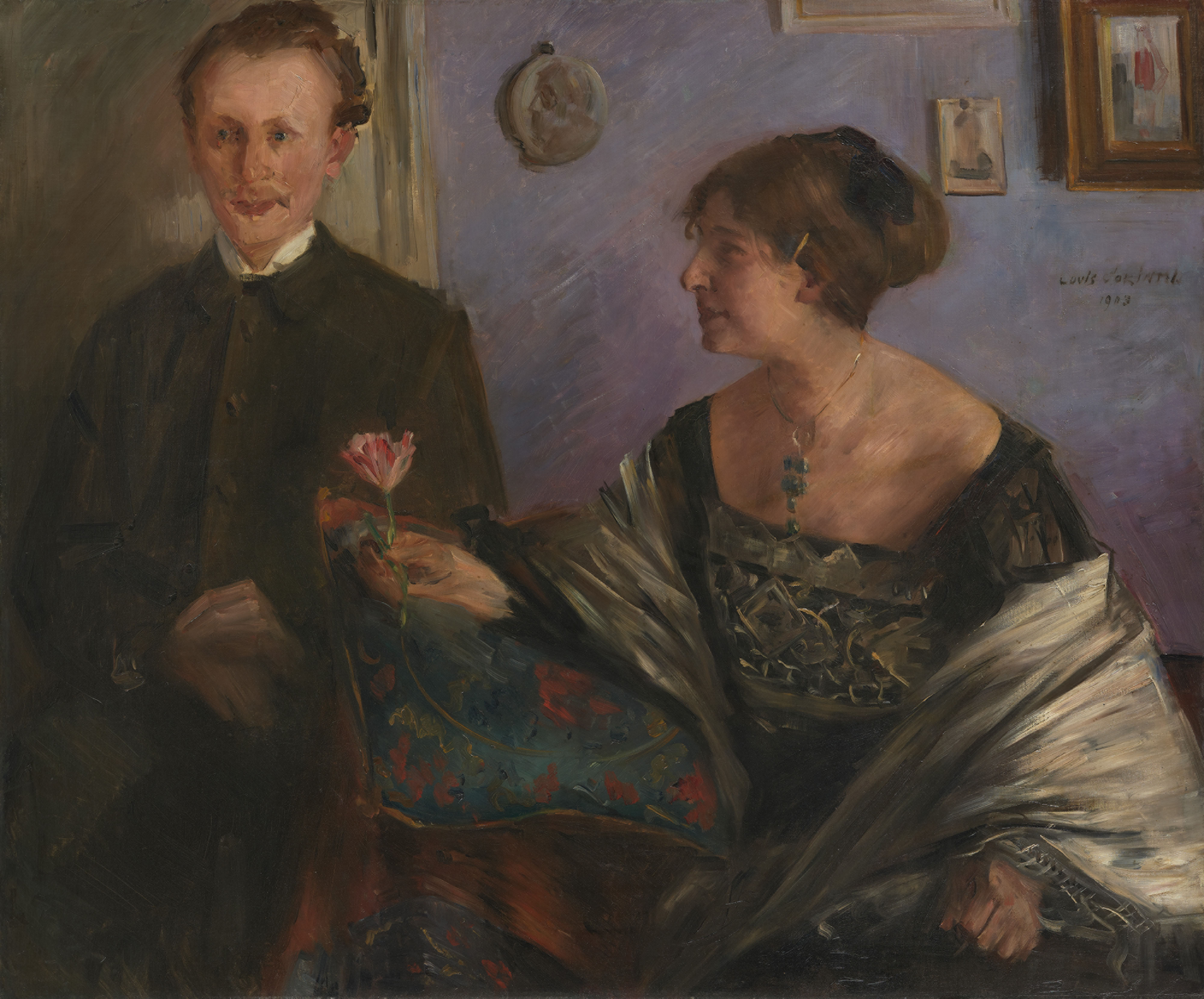 Obraz Lovisa Corintha z 1903 roku, będący świadectwem dojrzałego stylu artysty, przedstawia małżonków, Georga i Ellę Hirschfeldów, należących do berlińskiej bohemy przełomu XIX i XX wieku. Georg Hirschfeld (1873–1942), syn berlińskiego przemysłowca żydowskiego pochodzenia, to uznany prozaik i dramaturg, reprezentant naturalizmu w niemieckiej literaturze (Die Mütter, Zu Hause, Agnes Jordan). Mieszkał i tworzył w Berlinie, Monachium i Wiedniu. W latach 1895–1905 należał do stowarzyszenia Friedrichshagener Dichterkreis, zrzeszającego m.in. Gerharta Hauptmanna, Waltera Leistikowa, Edvarda Muncha, Reinera Marię Rilkego, Augusta Strindberga i Stanisława Przybyszewskiego. Przedstawieni we wnętrzu małżonkowie (ona – wytwornie ubrana, z lekkim uśmiechem, pełna emocji, on – zatopiony we własnych myślach, z nieobecnym spojrzeniem), stanowią ilustrację zaleceń Corintha sformułowanych w podręczniku sztuki malarskiej Das Erlernen der Malerei: „W przypadku mężczyzny zainteresowanie skupia się na opracowaniu cech duchowych, jego rąk, właściwej mu postawy, u kobiety bardziej na oddziaływaniu barw. Mężczyznę ujmuje się bardziej od strony duchowej, kobietę dekoracyjnie. Także tło jest bardzo ważne. (...) Dzisiaj preferuje się prostotę. Albo stosuje się jeden prosty ton, taki, jaki rzeczywiście widzi się za modelem, albo całe wnętrze, które stanowi tło”. Już w końcu 1903 roku obraz został wystawiony w Salonie Sztuki Paula Cassirera przy Victoriastr. 35 w Berlinie. Pierwotnie stanowił własność sportretowanej Elli Hirschfeld-Petersen, później Paula Cassirera, następnie został zakupiony przez Wilhelma oraz Friedę Döringów i zdobił wnętrze szczecińskiej willi przy dzisiejszej ulicy Wojska Polskiego. Na przełomie lat 1925 i 1926 dzieło wraz z 35 innymi pracami malarzy niemieckich XIX–XX wieku podarowane zostało Muzeum Miejskiemu w Szczecinie, dziś jest własnością Muzeum Narodowego w Szczecinie.