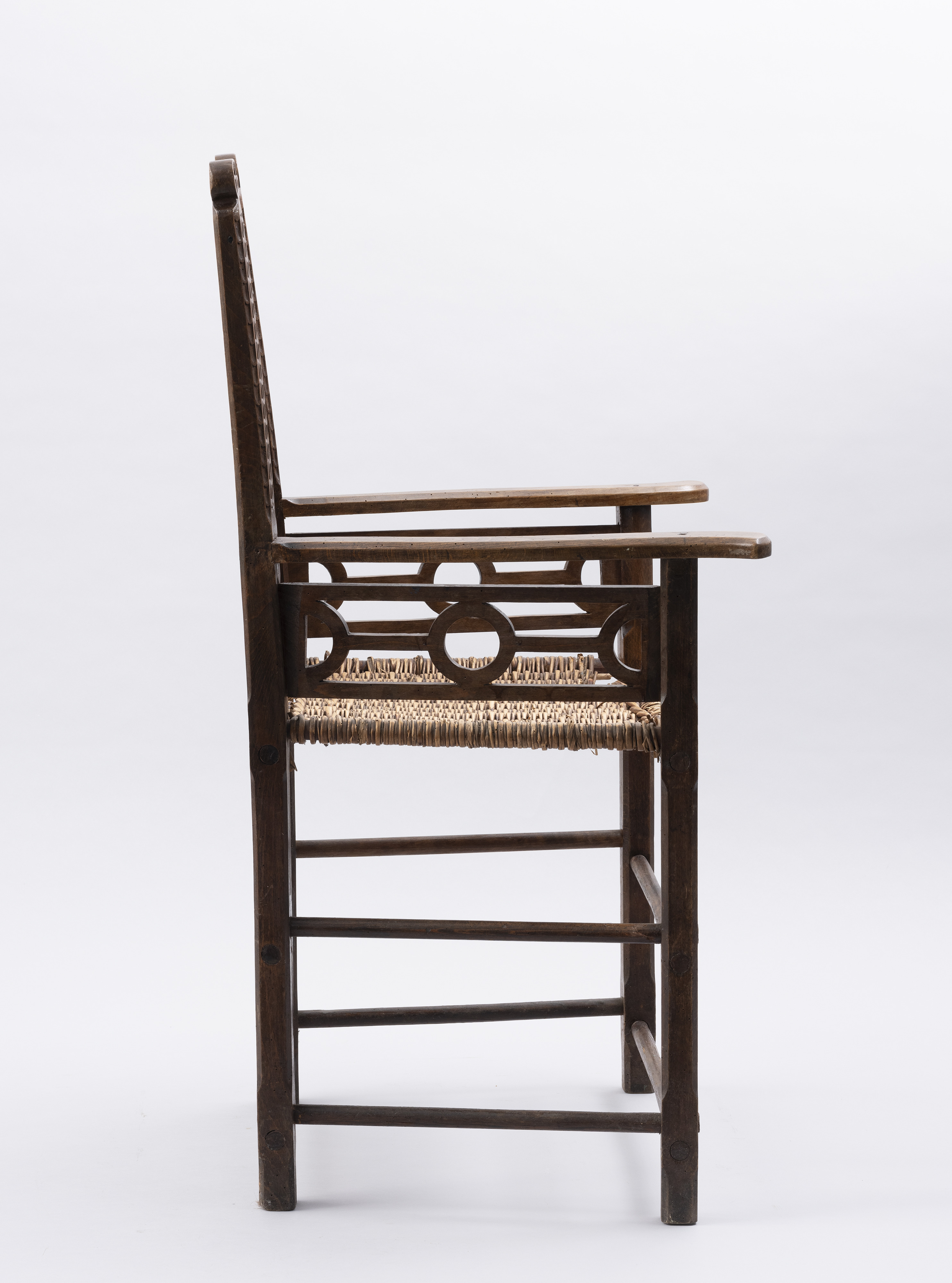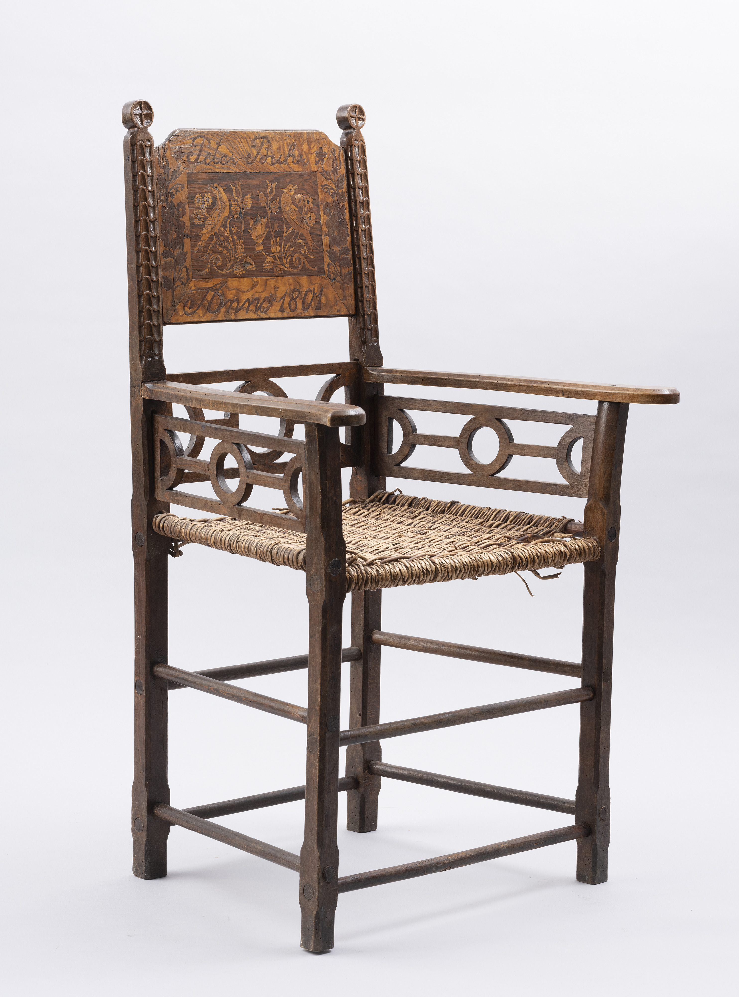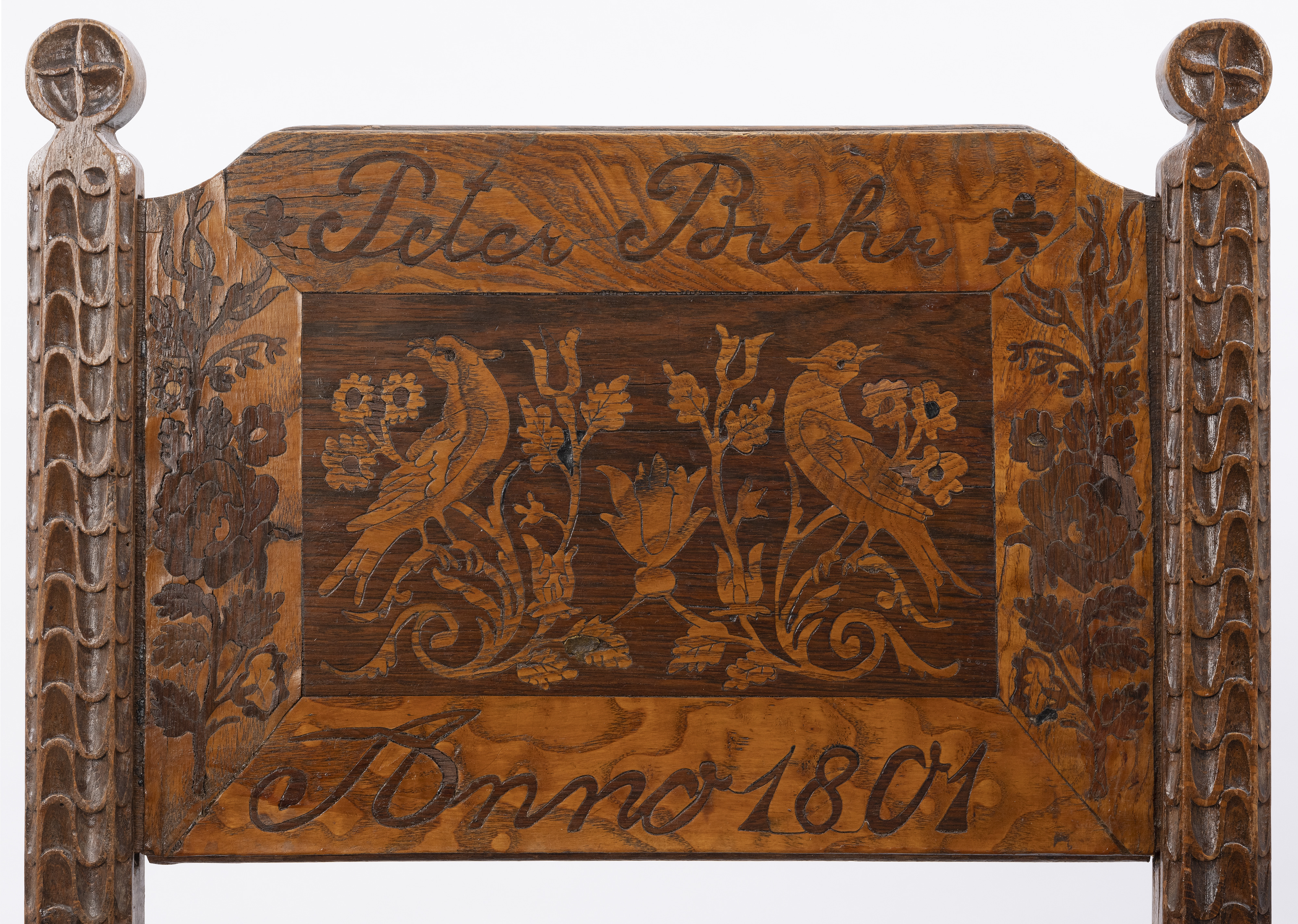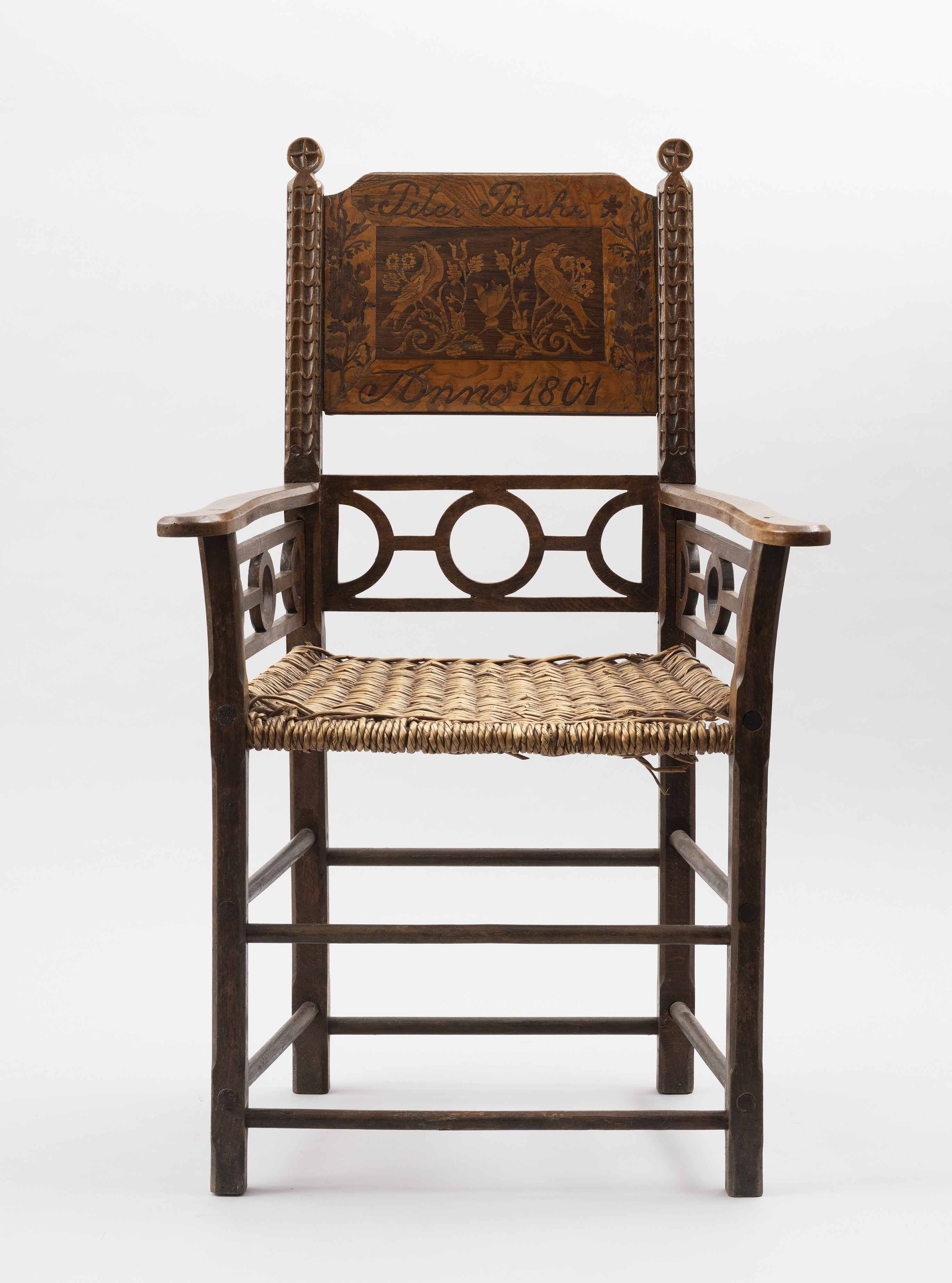 Fotel będący w zborach Muzeum Narodowego w Szczecinie jest cennym obiektem z tej grupy zabytków. Został wykonany niezwykle starannie z wykorzystaniem różnych technik zdobienia drewna, jak snycerka, czyli dekoracyjne rzeźbienie w drewnie oraz intarsja, polegająca na układaniu wzorów lub obrazów na jednolitym tle za pomocą innych gatunków drewna. Choć rzemieślnik będący wykonawcą nie jest znany, to z całą pewnością była to kosztowna praca na zamówienie. Krzesło powstało w 1801 r. dla Petera Buhra, który choć mógł, to prawdopodobnie nie był osobą zamawiającą. Wyjaśnienie pośrednio niesie intarsjowana dekoracja o symbolicznym przesłaniu. Pawie i tulipany to zaklęcie szczęścia, sukcesu i bogactwa. Słonecznik symbolizuje słońce, a więc źródło życia i płodności. Podobne znaczenie mają gałązki układające się w drzewo życia.