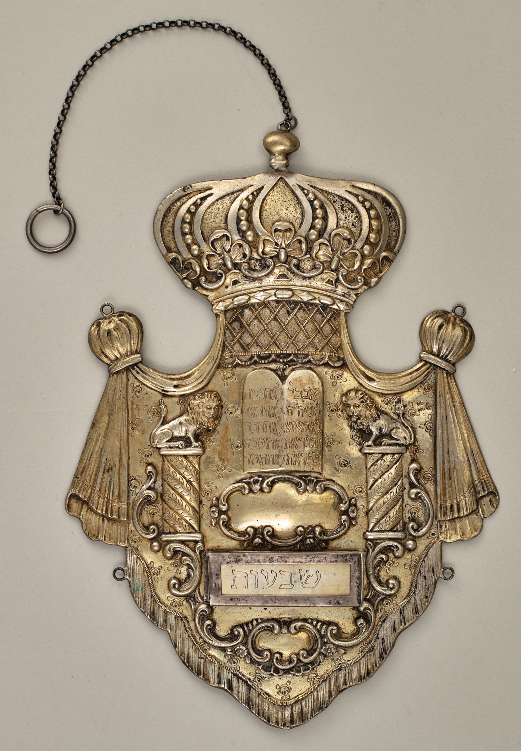 Tas czyli tarcza na Torę to jedna z ozdób nakładanych na rodał ubrany w sukienkę. Zwyczaj przybierania nim Tory wynikał z przepisu talmudycznego, zakazującego przewijania Tory w synagodze, ze względu na niepotrzebną stratę czasu. Egzemplarze Tory musiały więc być przygotowane do czytań o dzień wcześniej. Aby się nie pomylić i wyjąć właściwy zwój, oznaczano je plakietkami. Z czasem szyldy te nabrały form bardziej ozdobnych, przeradzając się w prawdziwe dzieła sztuki złotniczej. Większość tasów posiadała w dolnej partii niewielką, zamykaną skrzyneczkę, do której wkładano tabliczki z nazwami świąt; służyły one do oznakowania zwoju. Opisywany tas posiada prostokątną skrzyneczkę z 7 tabliczkami w środku. Zamyka ją zasuwana ramka, która przytrzymuje tabliczki, pozwalając odczytać znajdujące się na nich napisy. Są one wygrawerowane w języku hebrajskim i podają nazwy świąt: „szbth”, „psch”, „szweuth”, „skuth”, „rsz hsznh”, „szbth rejh”, „Jum kpur”. Spotyka się też tasy bez skrzyneczek, np. z wygrawerowaną tylko nazwą święta lub zupełnie pozbawione tego typu informacji. Najczęściej kompozycję centralną na tasie flankują z boków dwie kolumny (Jachin i Boaz), a w górze wieńczy ją korona podtrzymywana przez dwa lwy.