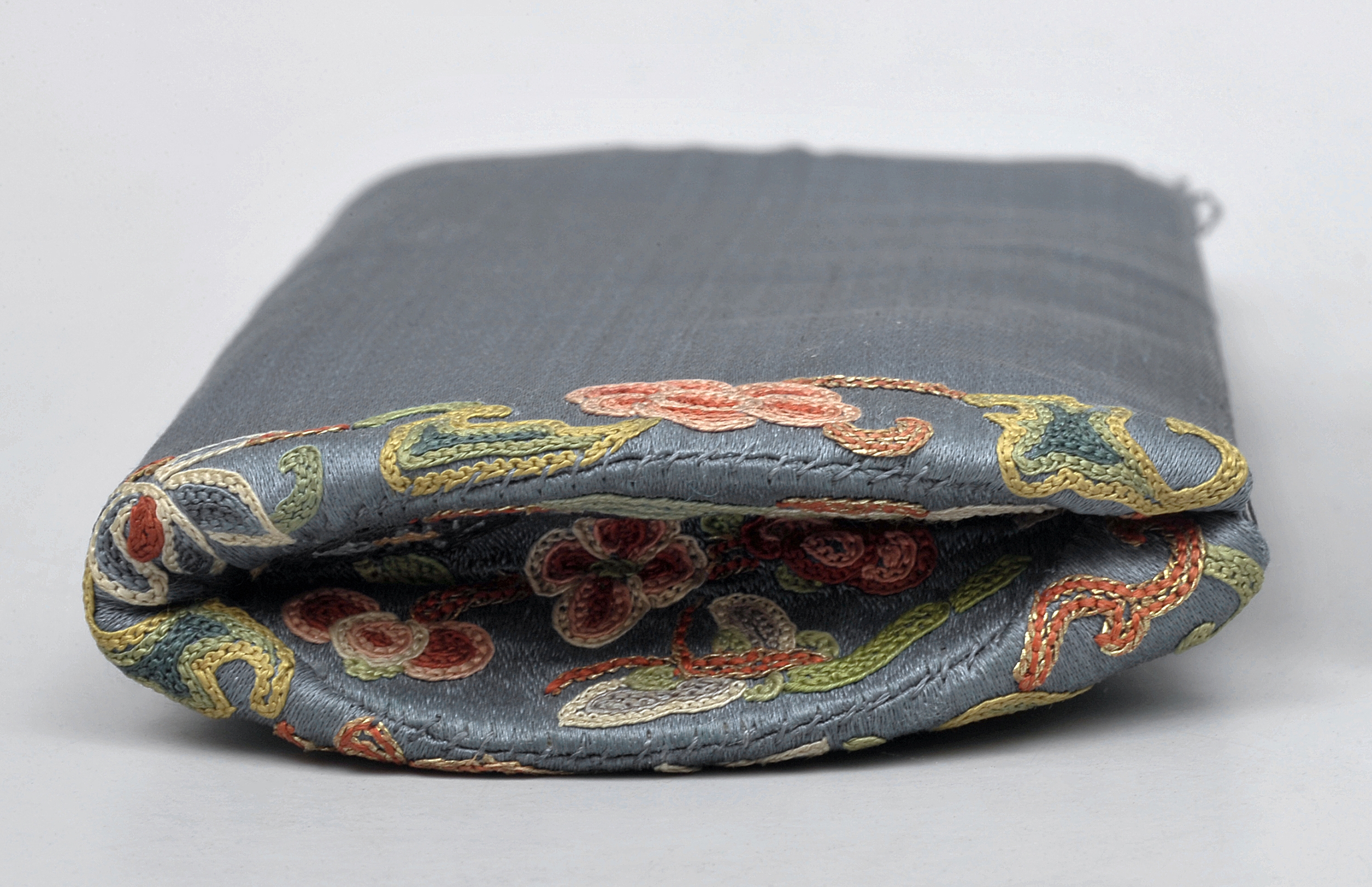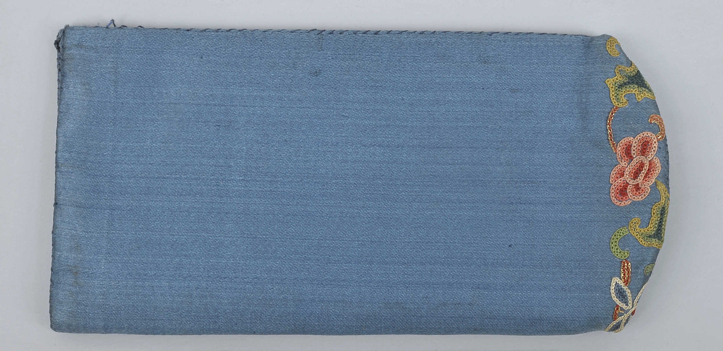 Futerał na okulary wykonany z niebieskiej jedwabnej satyny w kształcie spłaszczonego walca, z rozszerzeniem w części dolnej. Przedmiot został ozdobiony różnobarwnym haftem z motywami ukwieconych gałązek jedynie w obrębie denka. Najpewniej nie zachowały się tasiemki stanowiące uchwyt i zamknięcie.