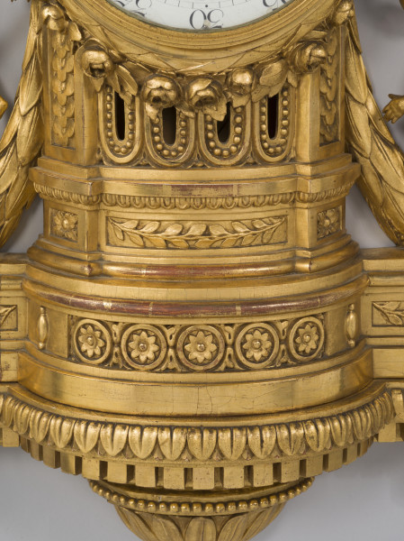 Zegar zakupiony do zbiorów wilanowskich w 1964 r. Wskazuje minuty i godziny oznaczone na tarczy cyframi arabskimi (5-60) i rzymskimi (I-XII) dwoma ażurowymi wskazówkami: godzinową i minutową. Na tarczy dwa otwory naciągowe; chodu oraz bicia godzin i kwadransów.