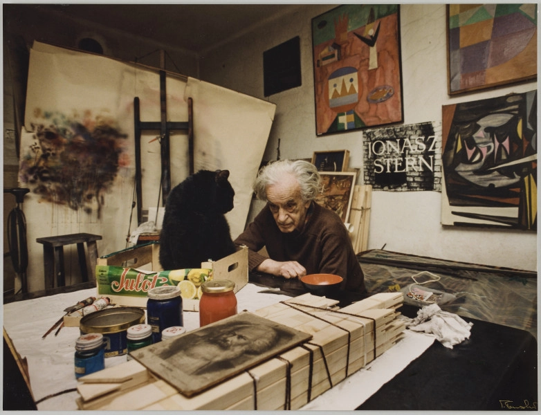 Zdjęcie przedstawia starszego mężczyznę, malarza Jonasza Sterna, w swojej pracowni. Mężczyzna ma zaczesane do tyłu siwe włosy, jest ubrany w brązowy sweter. Siedzi przy stole, na którym ustawione są słoje z farbami oraz pędzle. Na brzegu stołu (na pierwszym planie) leży stos listew, a na nich portret mężczyzny z brodą. Na stole przed malarzem stoi karton, w którym siedzi duży czarny kot. Zwierzę jest zwrócone w stronę malarza. W tle widać sztalugi oraz wiszące na ścianie plakaty. | Jonasz Stern (1904–1988) kształcił się w Szkole Przemysłowej we Lwowie i w Akademii Sztuk Pięknych w Krakowie. W 1933 r. wraz z innymi artystami założył stowarzyszenie artystyczne Grupa Krakowska. | Wybuch II wojny światowej zastał go we Lwowie. Po zajęciu tego miasta przez Niemców w 1941 r. Stern został osadzony w tamtejszym getcie, a następnie wysłany do obozu zagłady w Bełżcu. Udało mu się jednak zbiec z transportu i wrócić do Lwowa. W 1943 r., podczas likwidacji getta we Lwowie (1.06.1943), znów udało mu się uniknąć śmierci – ocalał, leżąc pod stosem ciał rozstrzelanych Żydów. Ze Lwowa uciekł na Węgry do Budapesztu. | Po wojnie, w latach 1954–1974, pracował jako profesor w ASP w Krakowie. Doświadczenie własnej śmierci jest wyraźnie widoczne w powojennej twórczości artysty. | Marta Frączkiewicz