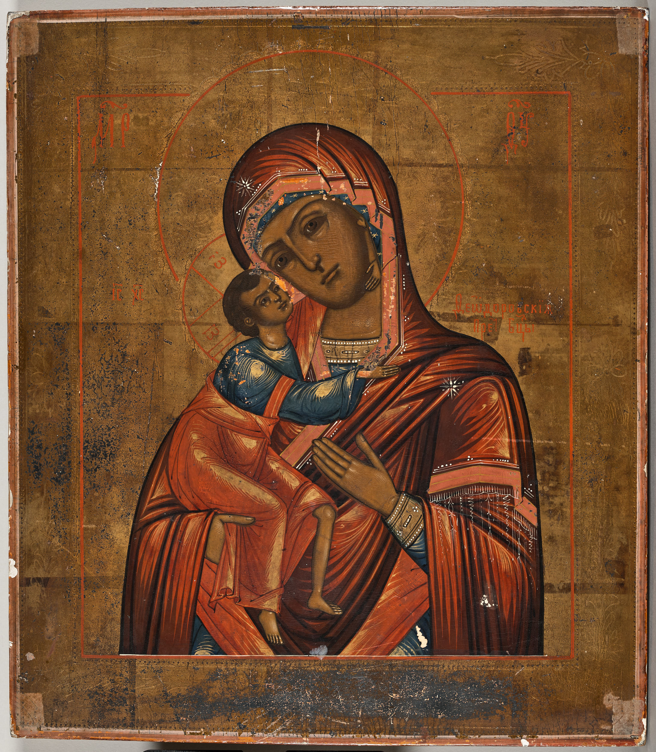 Prezentowana ikona Bogurodzicy Eleusy jest określana na ziemiach Rusi jako Umilenie w wariancie zwanym Fiodorowska – patrz S.12685MŁ. Pierwowzór ikony miał ocaleć w cudowny sposób w czasie najazdu plemion mongolskich na ziemie północno-wschodnie Rusi i objawić się na drzewie jednemu z przedstawicieli rodziny książęcej. Badacze wysnuwają kilka wersji pojawienia się obrazu wiążąc jego powstanie z dynastią Rurykowiczów. Najwcześniej wizerunek Fiodorowskiej Eleusy mógł powstać ok. 1164 r. dla monasteru w Gorodcu na zamówienie krzewiciela kultu maryjnego księcia Andrzeja zwanego Bogolubskim, syna Jerzego Dołdorukiego. Dwie inne wersje odnoszą powstanie obrazu do XIII w. i wiążą z osobą księcia Jarosława Wsiewołodowicza, syna Jarosława Wielkie Gniazdo i wnuka Jerzego Dołgorukiego. Obraz mógł zamówić książę Jarosław ok. 1218-1220 r. z okazji powrotu drugiej żony Teodozji, najpierw odebranej mu przez teścia, a potem zwróconej, tym bardziej, że z jej powrotem wiązało się urodzenie w 1219 r. syna o imieniu Fiodor czyli Teodor. Ikona mogła też powstać w 1239 r. na zamówienie Jarosława jako dar ślubny dla swojego syna Aleksandra Newskiego. Do tego przypuszczenia skłania fakt, że na odwrocie oryginału ikony Fiodorowskiej znajduje się wizerunek św. Paraskewy Piatnicy patronki narzeczonych i ślubów. Teoria ta pośrednio tłumaczy nazwę ikony mianowanej Fiodorowską. Teodor Strateg czyli Fiodor Stratylata, dowódca wojskowy i męczennik pierwszych wieków chrześcijaństwa – opiekun rycerstwa chrześcijańskiego, był często wybierany na patrona wśród przedstawicieli połockich Mścisławiczów, z których wywodziła się żona księcia Aleksandra. Nazwa tego wariantu Eleusy mogła też wynikać z faktu umieszczenia pierwowzoru ikony w monasterze św. Teodora Stratega w Kostromie w XIII w. Ikona Fiodorowskiej Bogurodzicy stała się patronalną dla dynastii Romanowów, co opisano pod S.12932MŁ.