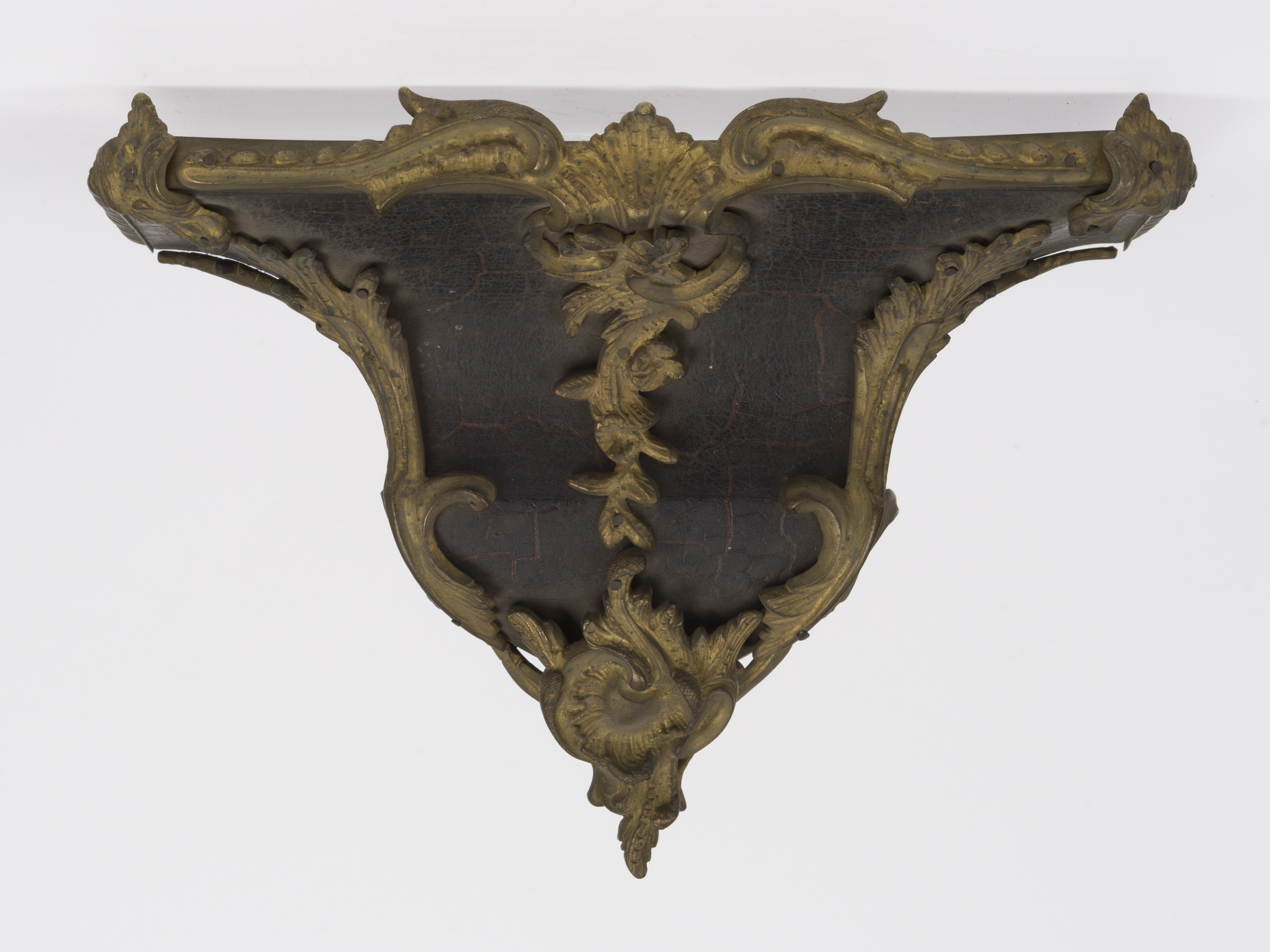 Niewielka konsolka ścienna o prostokątnym blacie, u góry szersza, zwęża się ku dołowi dając zarys odwróconej piramidy o łukowato wklęsłych bokach. Krawędzie narożne podkreślone zostały bogato rzeźbionymi motywami nieco kapryśnie potraktowanej wici roślinnej, zbiegającej się z czterech stron u dołu w mocno poskręcany motyw rocaille. Wzdłuż lekko falistej krawędzi blatu biegnie rzeźbiony ornament o formie wyciągniętej wici z perełkowaniem, pośrodku formującej podwójny łuk wypełniony wydłużonymi elementami rocaille przechodzącymi w rozdzielający grzbiety łuku motyw tzw. Koguciego grzebienia, od którego opada zwis ze splątanych ceownic poprzetykanych pędami różyczek. Gładkie powierzchnie tła zostały poczernione w celu podkreślenia jaśniejszych ornamentów.