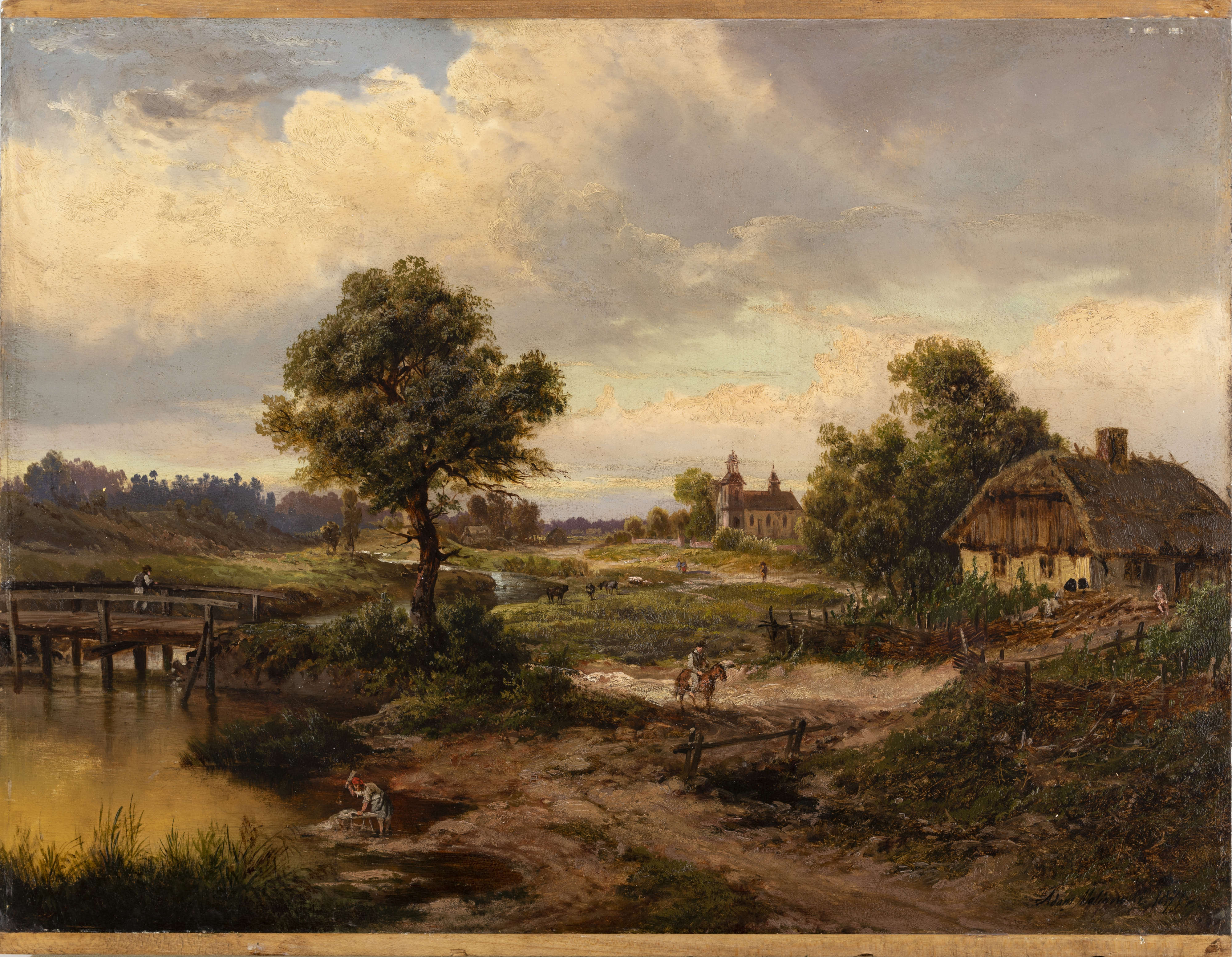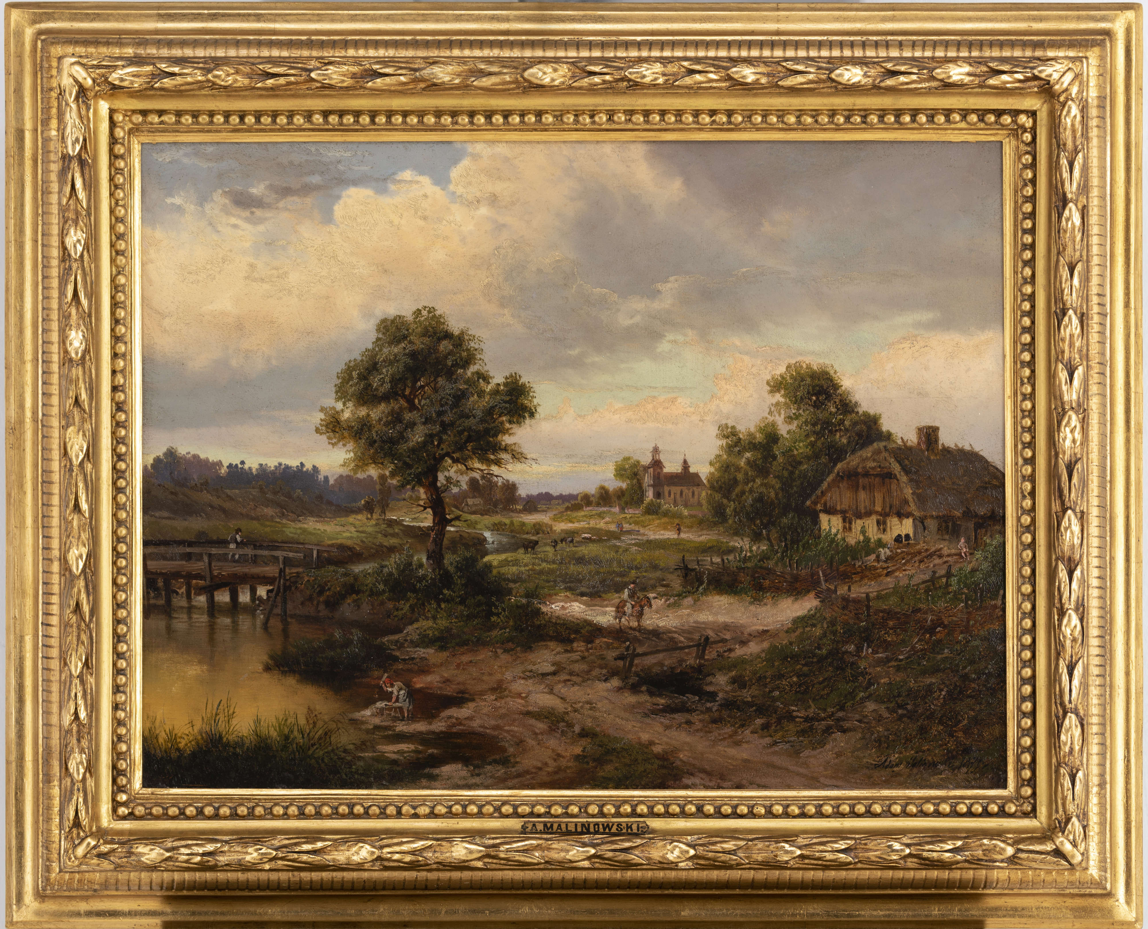 W tym akademickim nurcie kontynuacji malarskich motywów mieści się sielankowy Pejzaż z kościołem, tworzący otwartą, rozległą przestrzeń ze sceną rodzajową na pierwszym planie, ukazującą codzienne czynności wiejskiej społeczności – pranie, wypas bydła, odpoczynek; w centrum kompozycji znajduje się jeździec na koniu. Zróżnicowane czynności podejmowane przez rozproszone w pejzażu postaci odzwierciedlają stały rytm, stanowią dopełnienie świetlistego krajobrazu będącego zasadniczym tematem płótna. Odtwarzając detale przyrody, konarów, gałęzi, traw, wreszcie wiejskiej zabudowy, Malinowski tworzy nastrojowe wyobrażenie wyrażające harmonijną współobecność grup postaci z wszechogarniającym rytmem przyrody. Intensywność światła rozproszonego w otwartym krajobrazie, odbitego w nurcie rzeki, wydobywającego brunatny grunt, eksponującego zieleń gałęzi, nadaje obrazowi wyraz mistycznej jedności. W dalekim planie sylwetka kościoła zamyka kompozycję, nadaje obrazowi religijne przesłanie, wiążące kruchą codzienność z transcendencją.