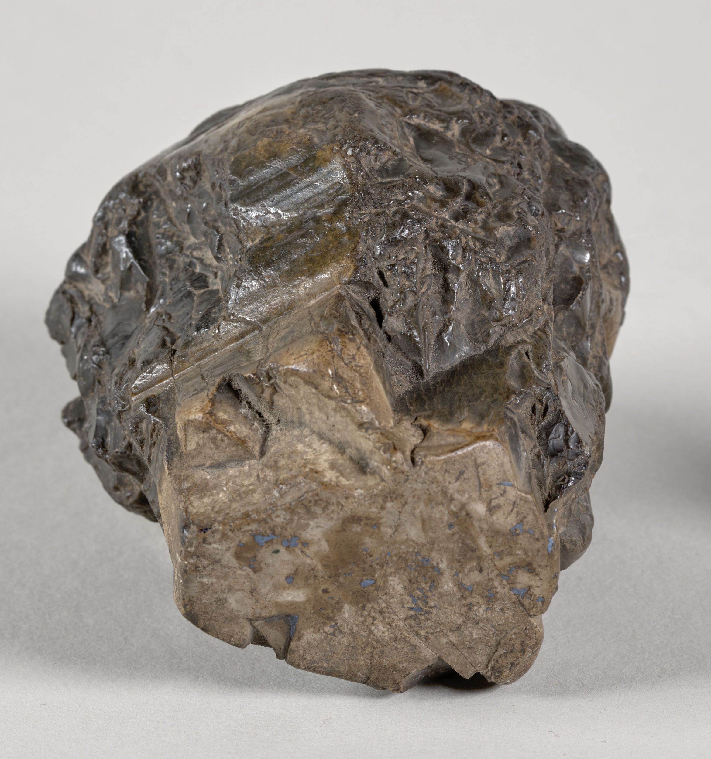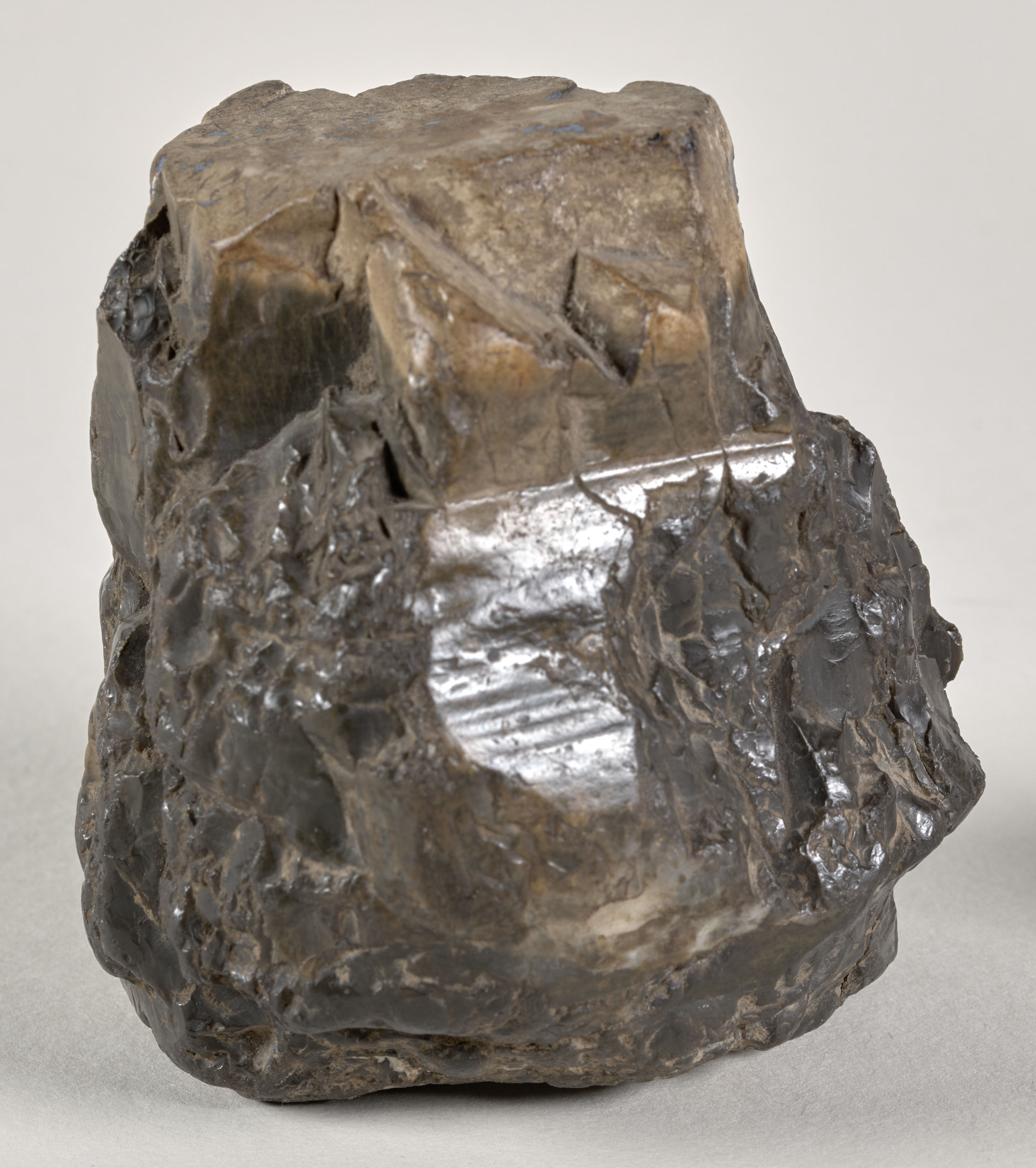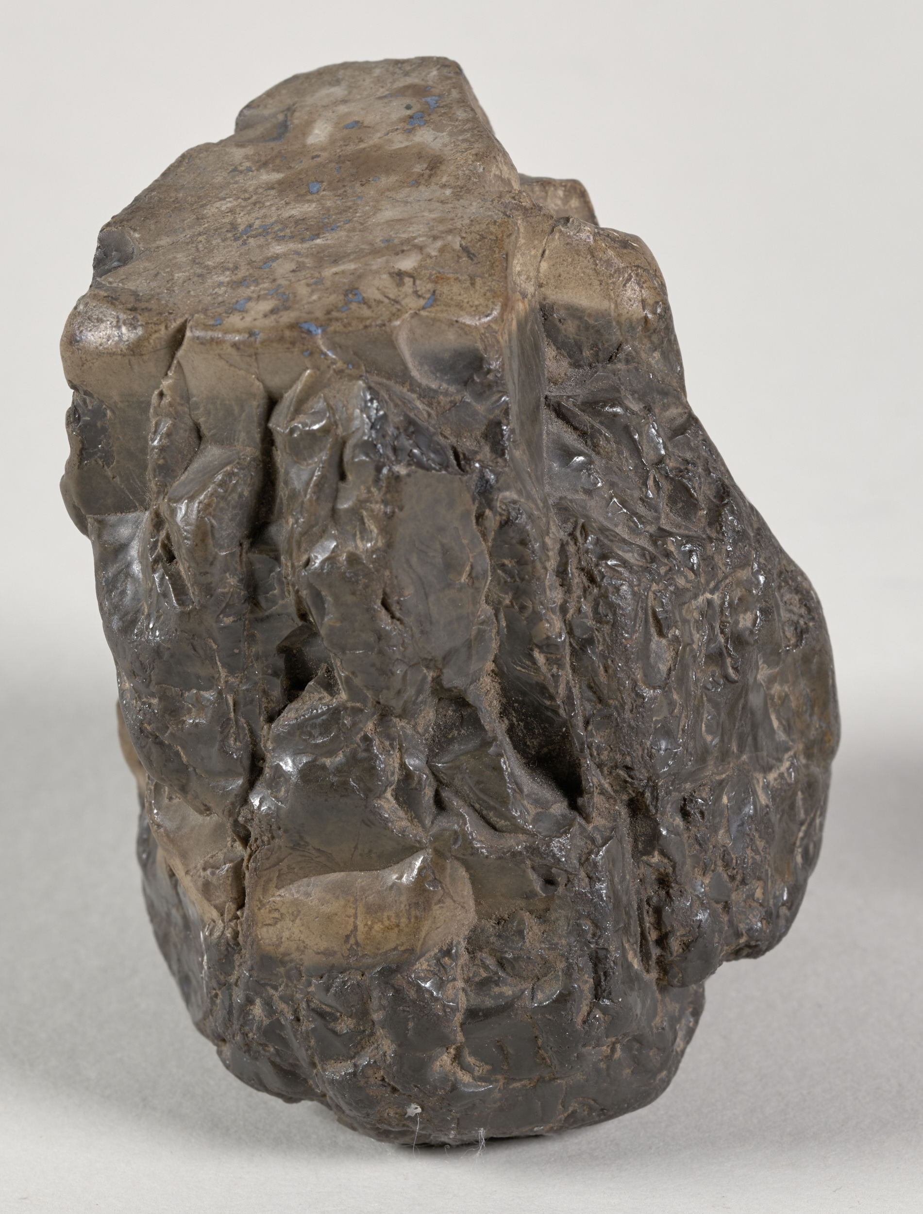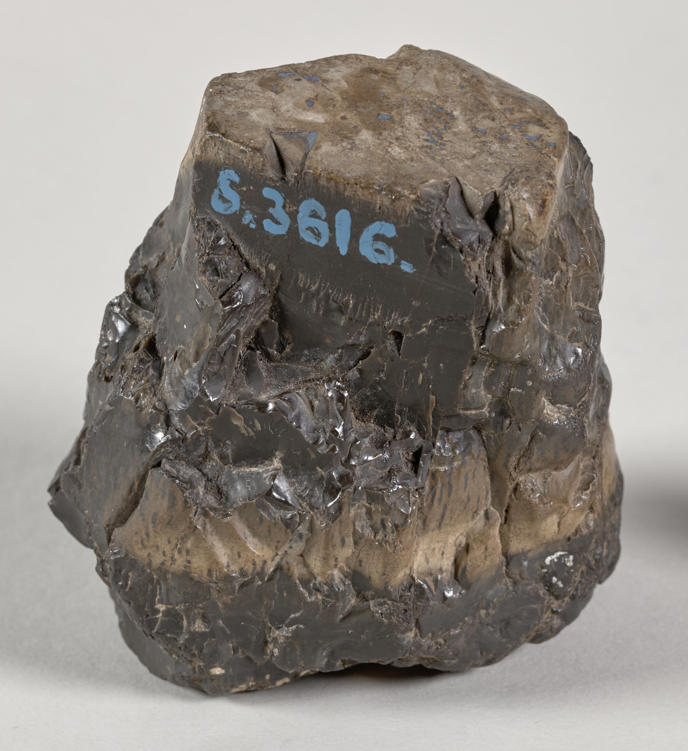 Obecnie omawiany przycisk o nr. inw. S3616MŁ to po prostu bryła krzemienia o nietypowej formie walca rozszerzającego się ku górze, a nawiązującej kształtem do kapitelu antycznej kolumny. Kolorystyka kamienia utrzymana jest w różnych tonacjach brązu, a nieszlifowane ścianki powodują załamywanie promieni słonecznych co dodatkowo podnosi estetykę eksponatu.
