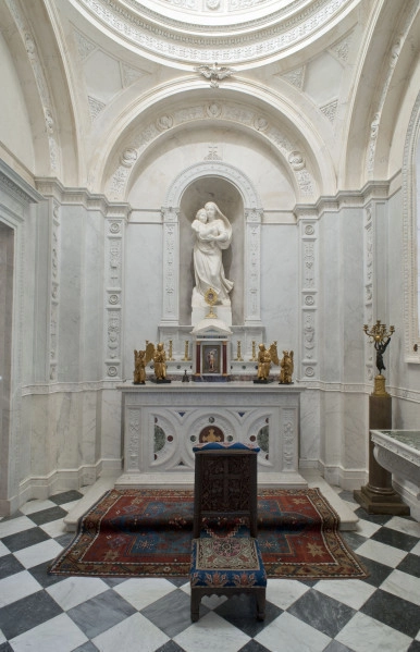 Obecny wygląd kaplicy jest głównie dziełem artystów włoskich – Vincenzo Gaiassiego i Luca Caraminiego. Poza opracowaniem w szczegółach ścian z marmuru karraryjskiego, zrealizowali oni również cyborium ołtarzowe (Caramini) oraz wzorowaną na Madonnie Sykstyńskiej Rafaela statuę (Gaiassi). Mozaikowe drzwiczki do tabernakulum ze sceną Zmartwychwstanie Chrystusa wykonał w Rzymie Salvatore de Rossi, a dwie kropielnice z czerwonego marmuru – Juliusz Troschell. Pokrywająca wnętrze kopuły stiukowa dekoracja, w typie mistrza włoskiego renesansu Jacopo Sansovina, jest pracą chłopa z pobliskiego Powsinka – Józefa Klimczaka.