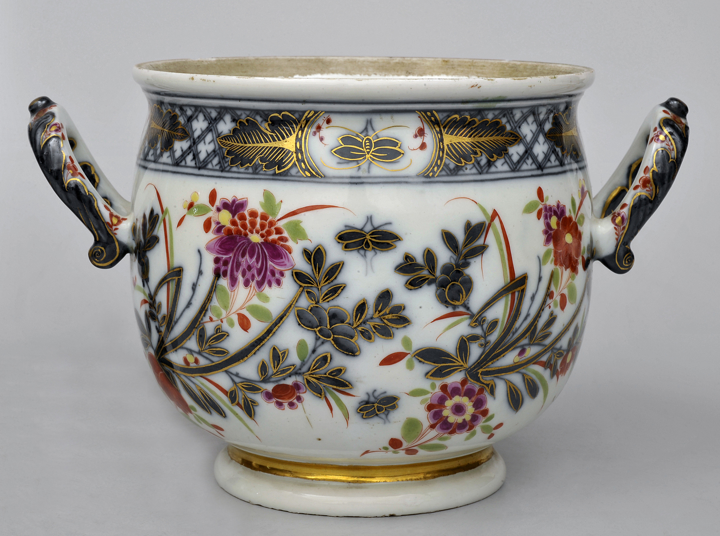 Porcelanowa waza z uchwytami, o cylindrycznym kształcie z brakującą pokrywą. Ozdobiona kwiatową dekoracją inspirowaną Dalekim Wschodem, malowaną podszkliwnie kobaltem oraz farbami naszkliwnymi w kolorach czerwieni żelazowej, różu i zieleni. Niektóre kontury roślin i ornamentów zostały podkreślone subtelnym złoceniem. Takie zdobienie powstało pod wpływem japońskiej porcelany w stylu Imari, pochodzącej z miasta Arita, a importowanej do Europy z położonego niedaleko portu Imari, skąd została zaczerpnięta jej nazwa.
