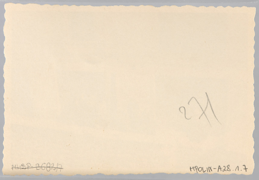Na zdjęciu widoczne: mur getta, dolna część budynku i ludzie pod ścianą oraz przy murze oraz ludzie w oknie. Ludzi na chodniku jest trzynastu, w tym dziesięciu lub jedenastu mężczyzn i trzy lub dwie kobiety. Jeden z mężczyzn z długą deską, na tej fotografii widać, że opiera się o nią, ma założoną nogę. Po lewej mężczyzna tuż przy murze, patrzy prosto w kadr, uśmiecha się; w murze od strony aryjskiej w tym miejscu wnęka-nyża. Wszyscy na chodniku mają nakrycia głowy, na przedramionach uwyraźniają się opaski dyskryminacyjne - z gwiazdą Dawida.
