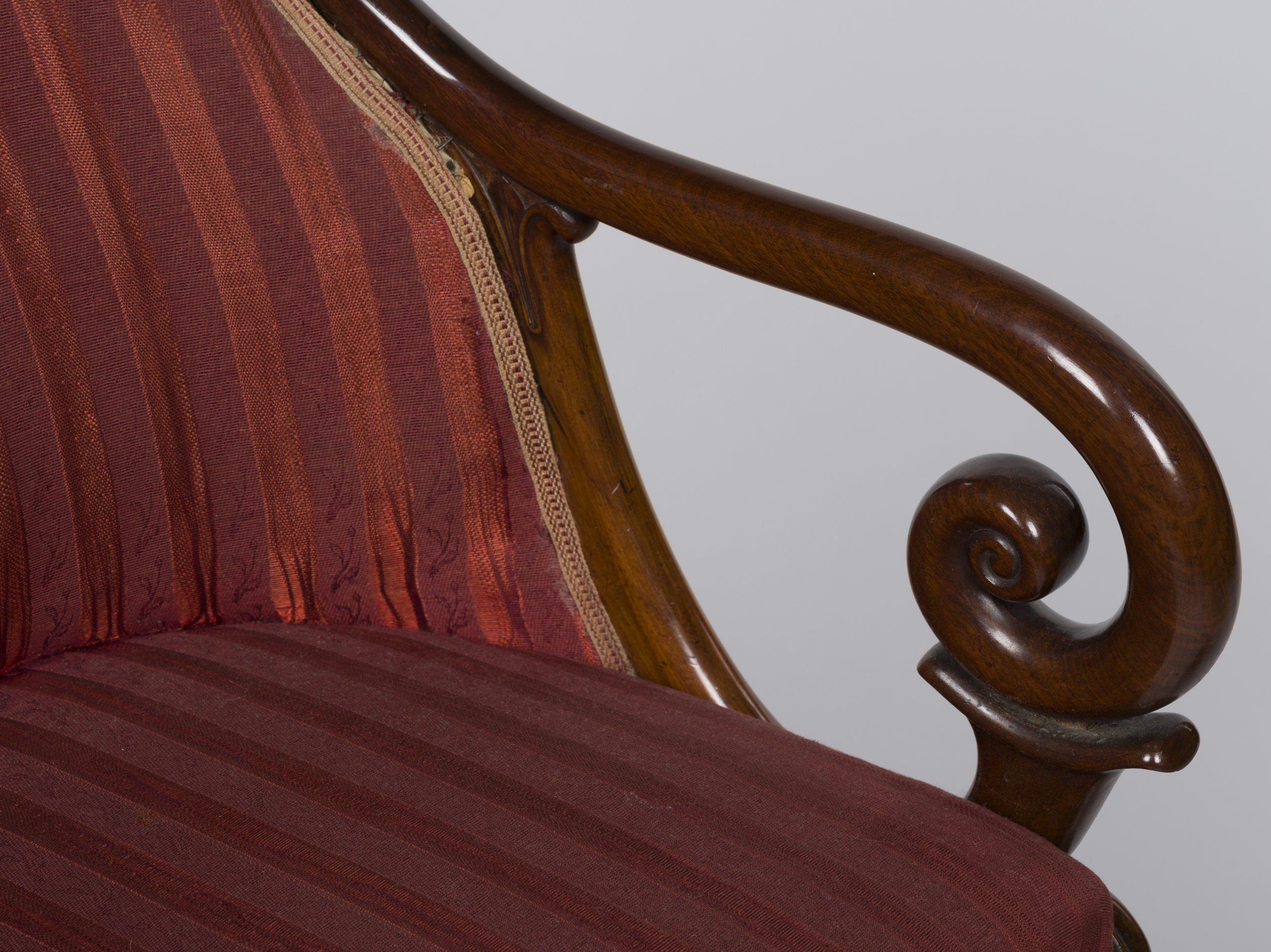 Fotel o półkolistym siedzisku, wsparty na czterech wąskich zbieżnych szablastych nogach o zaokrąglonych krawędziach. Przednie nogi wygięte w przód, w górnej partii ozdobione płaskorzeźbioną wolutą skierowaną ku tyłowi, tylne – ze względu na ustawienie na łuku są odgięte do tyłu i na zewnątrz. Odchylone nieco do tyłu oparcie jest pełne, od góry łukowato zamknięte, płaszczowo wygięte zgodnie z zarysem siedziska, i spływa łagodnie na boczne oskrzynie siedziska, a następnie znajduje kontynuację w wygiętych łukowato ku górze, wachlarzowato rozszerzonych wspornikach poręczy. Nieco poniżej górnej krawędzi oparcia, pośrodku, znajduje się podłużny poziomy owalny otwór stanowiący uchwyt. Poręcze o okrągłym przekroju, nieco węższe u góry i rozszerzające się ku dołowi, płynnie spływają od górnej części oparcia i zwijają się u dołu w nieduże woluty opierając się wspornikach. Carga jest prosta, gładka, nad nogami przechodząca w prostopadłościenne kostki. Siedzisko i oparcie są tapicerowane i zostały obite malinowym atłasem w paski naprzemiennie gładkie i z drobnym ornamentem roślinnym.