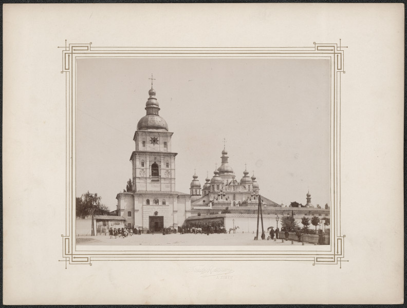 Fotografia prezentuje zespół klasztorny od południowego zachodu, od strony frontowej z Placu Michajłowskiego. U wejścia do monastyru uwiecznieni zostali ludzie, przeważnie świeccy: chłopi w futrzanych czapach, przekupki oferujące różne towary, damy z parasolkami, dorożkarze. Na lewo od dzwonnicy nadbramnej za wysokim murem, widoczne są na ternie klasztoru drzewa. W późniejszym czasie na tym terenie wzniesiono budynek Kijowskiej Prawosławnej Akademii Teologicznej.