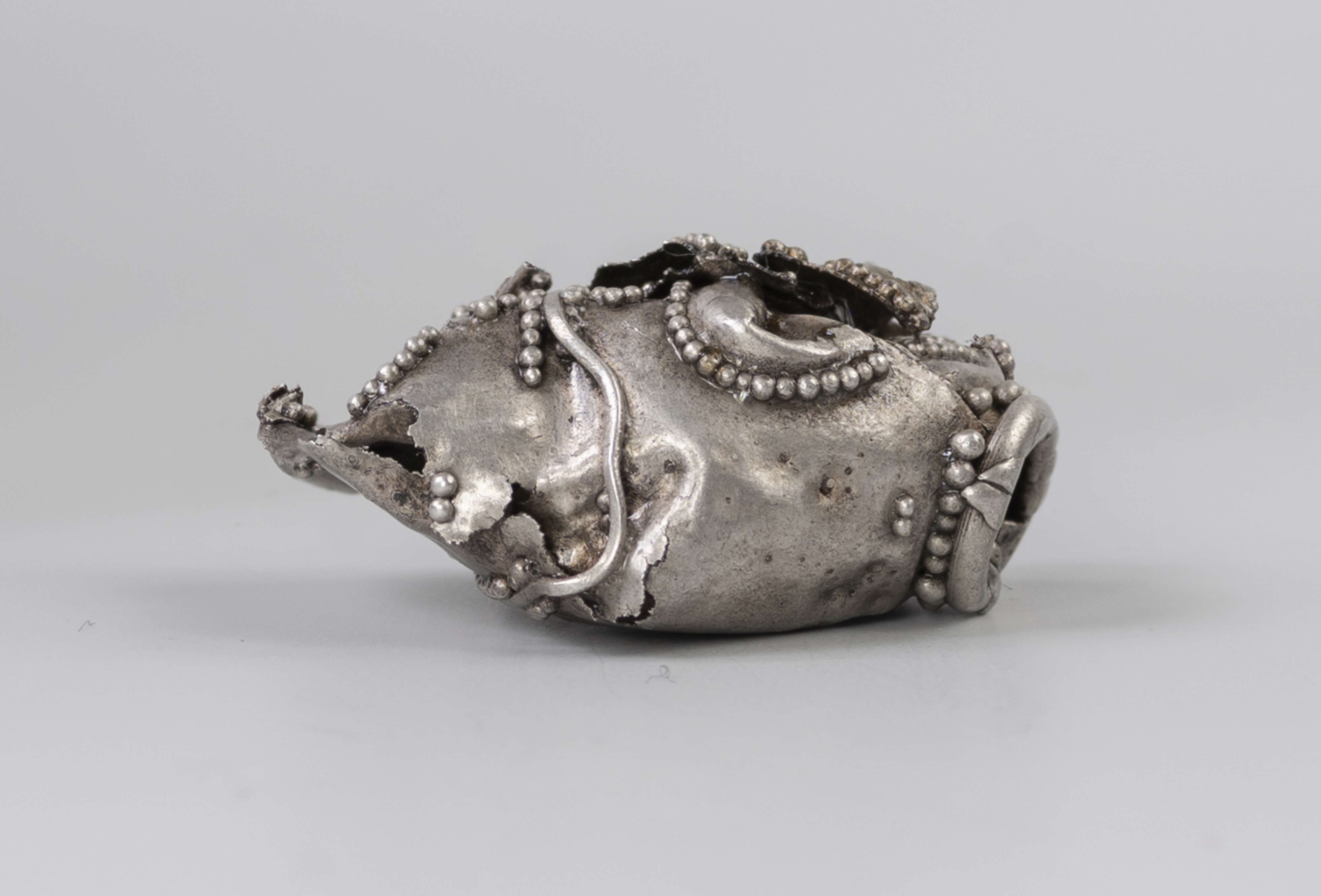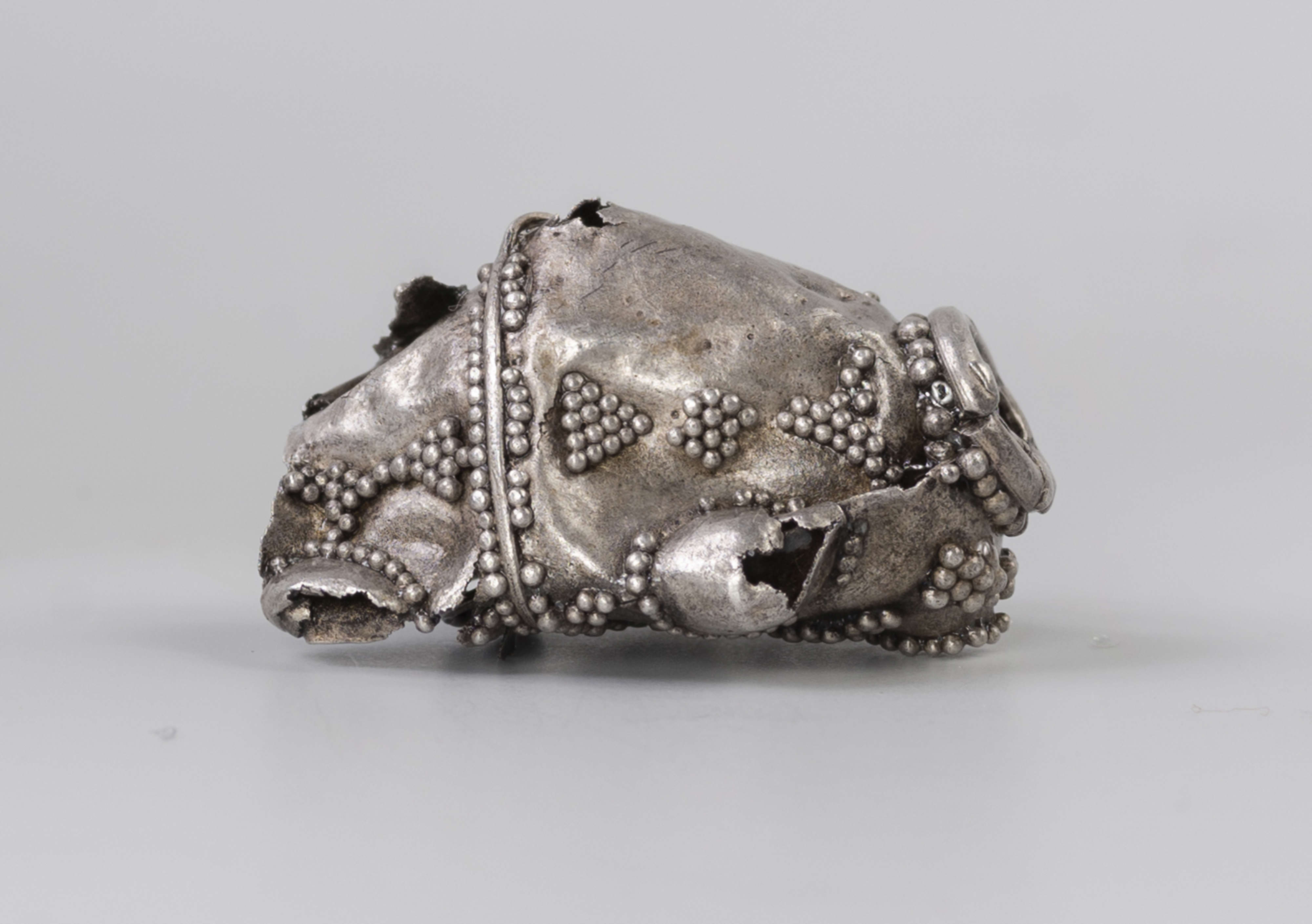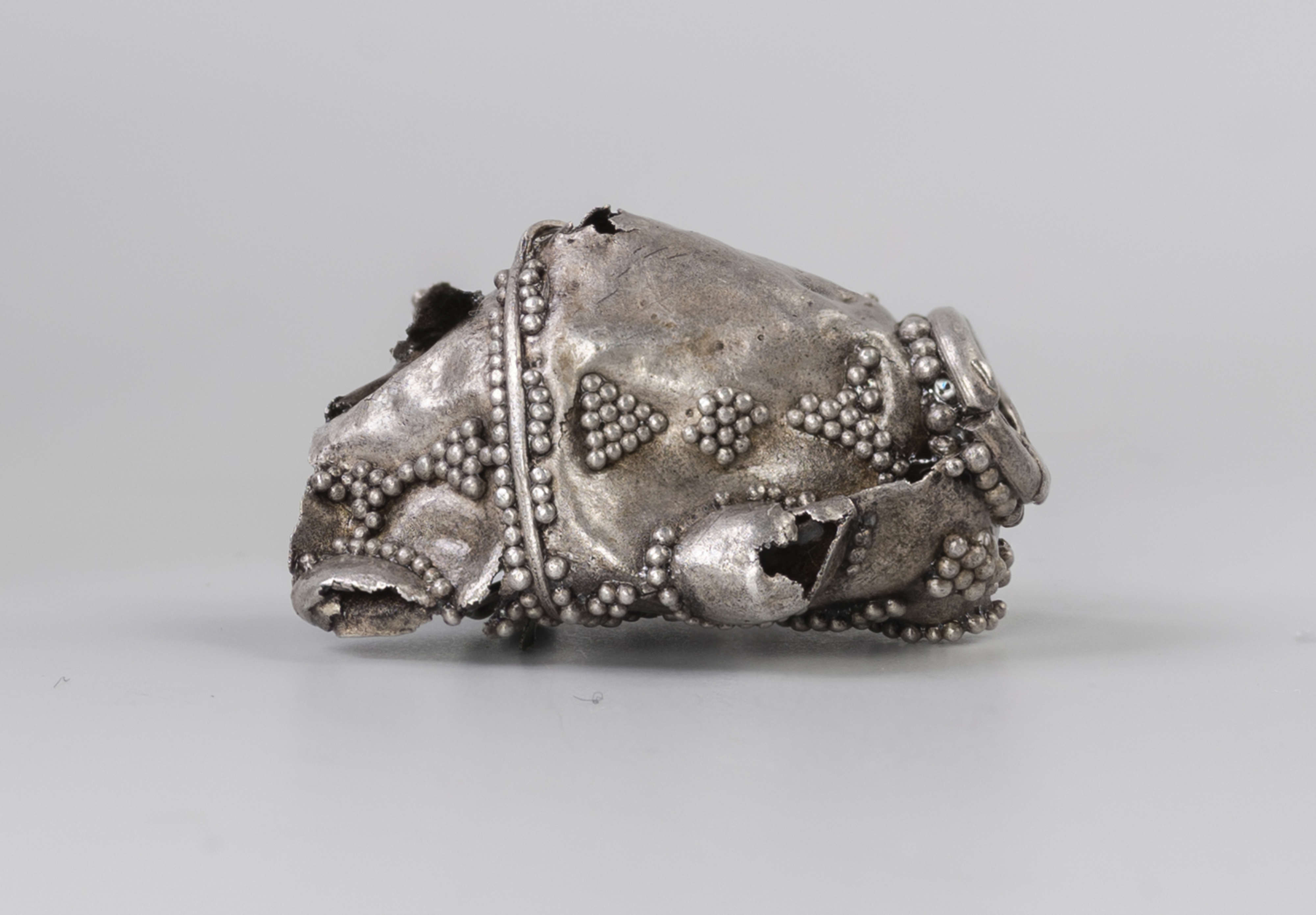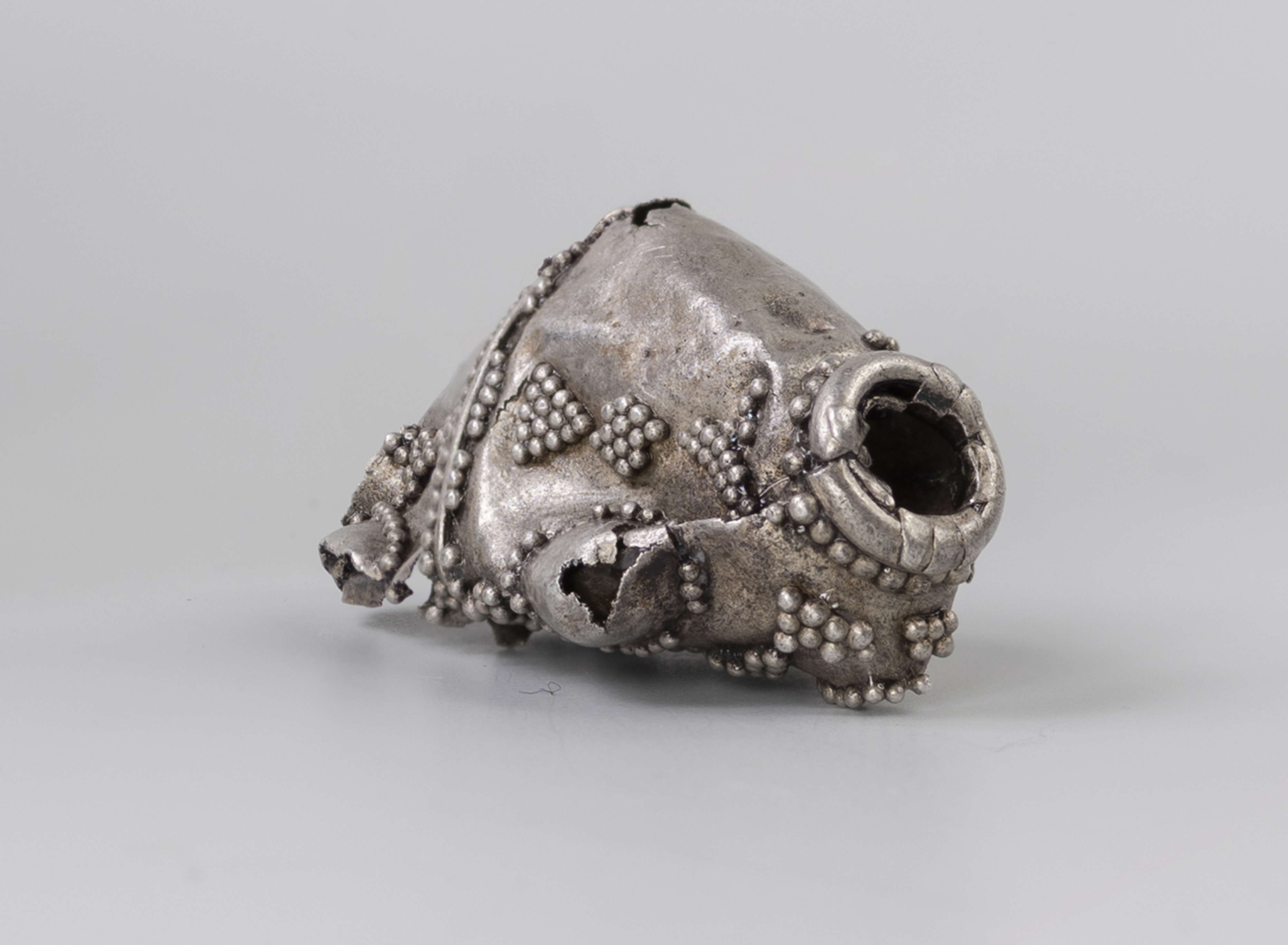Paciorek jest wykonany niezwykle misternie. Jego wyprodukowanie wymagało dużej wprawy jubilerskiej. Na każdej połówce znajduje się rząd złożony z czterech guzów. W miejscu łączenia półkul przebiega drucik, po którego obydwu stronach występują dwa rzędy granulek. Otwór paciorka jest również obwiedziony granulacją. Pomiędzy guzkami a linią łączenia półkul są umieszczone małe romby z granulek. Rombami zdobione są przestrzenie pomiędzy guzami, po których obu stronach znajdują się jeszcze trójkąty.