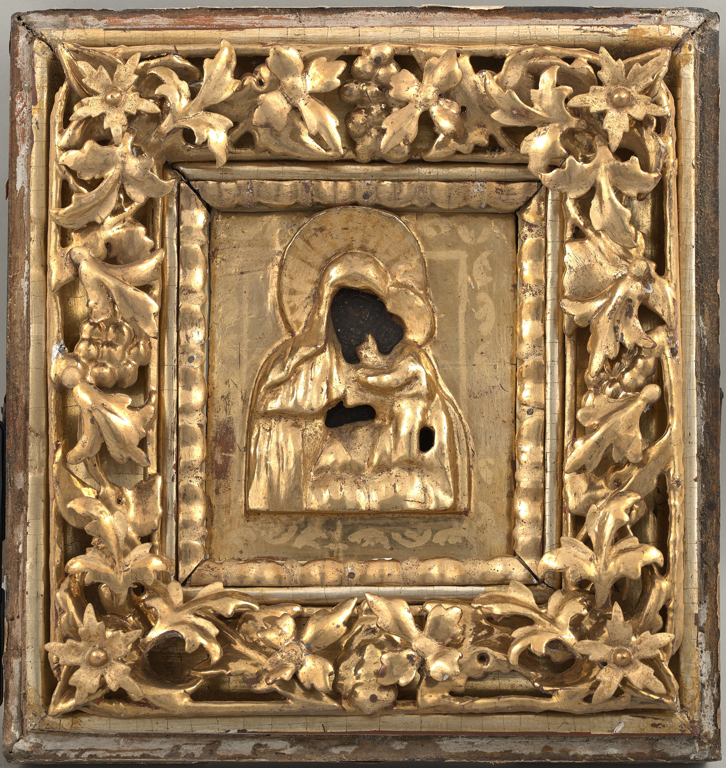 Prezentowana ikona Bogurodzicy z Chrystusem Ocalenie Zagubionych została ozdobiona złoconym drewnianym okładem, oprawiona w ażurową ramę i umieszczona w przeszklonym drewnianym kiocie. Źródłem tego przedstawienia spopularyzowanego w Rosji od XVIII w. był tekst spisany na wschodzie chrześcijaństwa w VII w. Opowiadanie „Skrucha Teofila ekonoma cerkiewnego w mieście Aden” dotyczyło sługi domu biskupiego, który niesprawiedliwie oczerniony i wydalony, bluźnił Bogu w poczuciu krzywdy i podpisał cyrograf z diabłem. Opamiętawszy się żałował za grzech modląc się przed nieokreśloną ikoną Bogurodzicy, która zwróciła mu cyrograf wraz z obietnicą odpuszczenia winy. W opowiadaniu, znanym w rosyjskim prawosławiu od XVII w., Bogurodzica po raz pierwszy została nazwana Ocaleniem Zagubionych. Rosyjski pierwowzór ikony wiąże się z historią ocalenia od zamarznięcia Teodora Obuchowa, który wracając z podróży do domu w dniu Chrztu Pańskiego zabłądził w zamieci śnieżnej, zrozumiawszy beznadziejne położenie puścił wolno konie, położył się na saniach i kierując myśli ku Bogurodzicy ślubował fundację ikony za ocalenie życia. Podróżny został odnaleziony przez człowieka wyprowadzonego z domu głosem Bogurodzicy. Ocalony Teodor dotrzymał obietnicy, zamówił do cerkwi w rodzinnej wsi Bór kopię ikony Bogurodzicy z 1707 r. znajdującej się w cerkwi św. Jerzego w Wołchowie. Odtąd oba wizerunki zasłynęły cudami, a ich święto ustanowiono na 18 (5 lutego wg kalendarza juliańskiego). Ikony Bogurodzicy zwane Ocalenie Zagubionych, w odniesieniu do ludzi nie mających nadziei na ratunek, spopularyzowano w różnych wariantach. Dzieciątko może się pojawić zarówno po lewej, jak i po prawej stronie obrazu, postacie nie zawsze przytulają się policzkami, na niektórych wizerunkach Bogurodzica ma odsłoniętą głowę, z włosami opadającymi na ramiona, może Ona przyjąć postawę stojącą lub siedzącą z Jezusem stojącym na jej kolanach.
