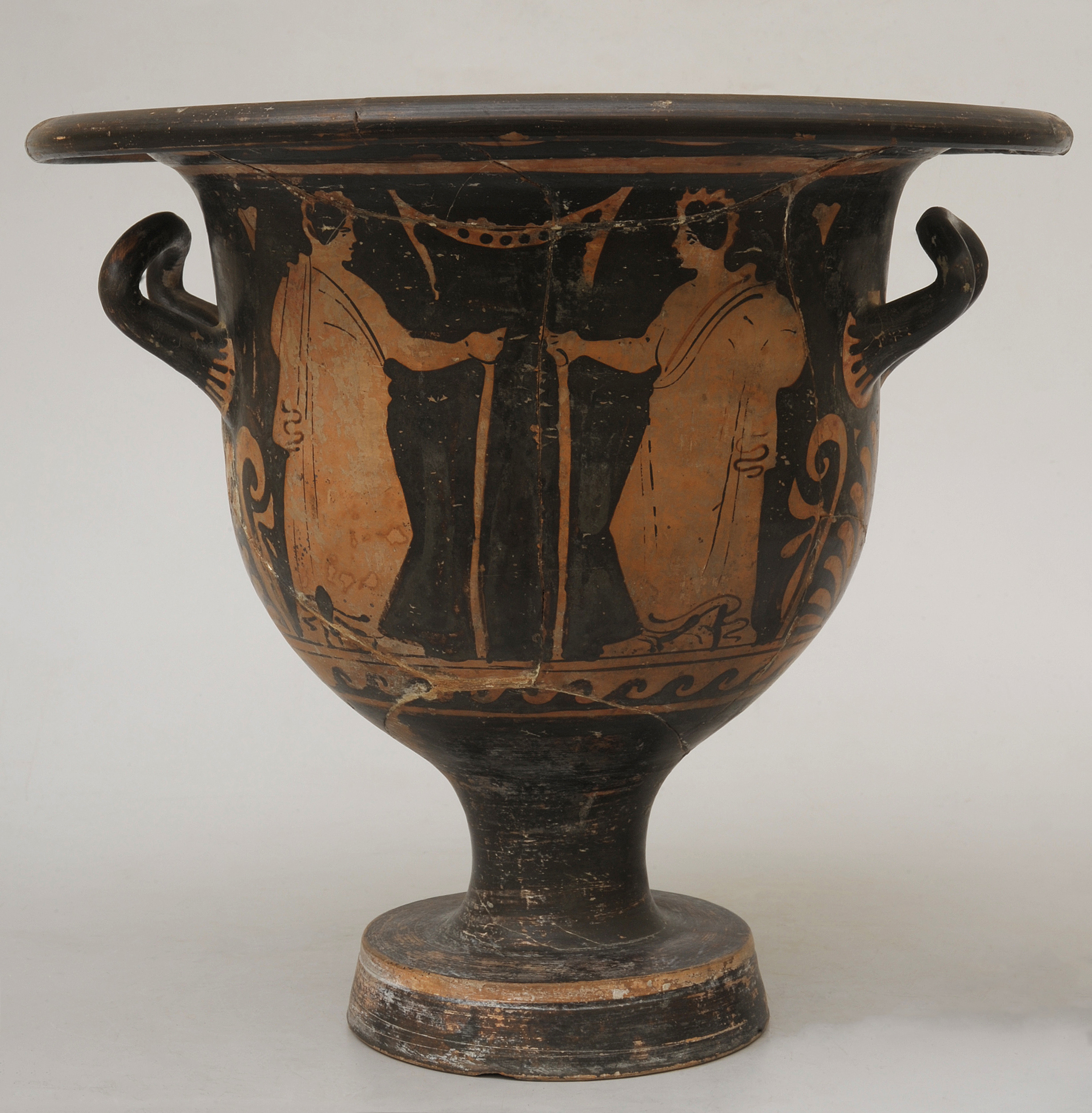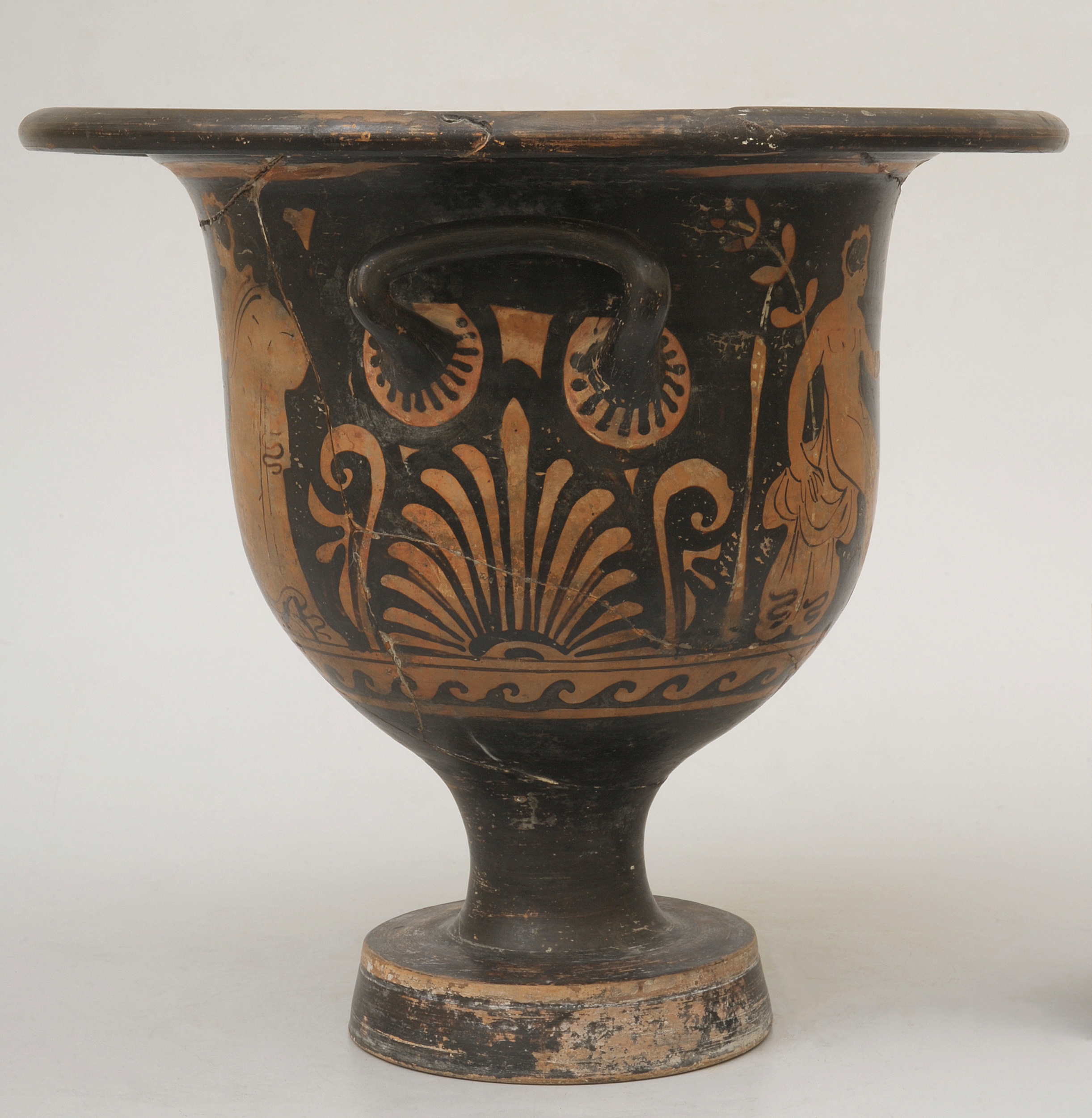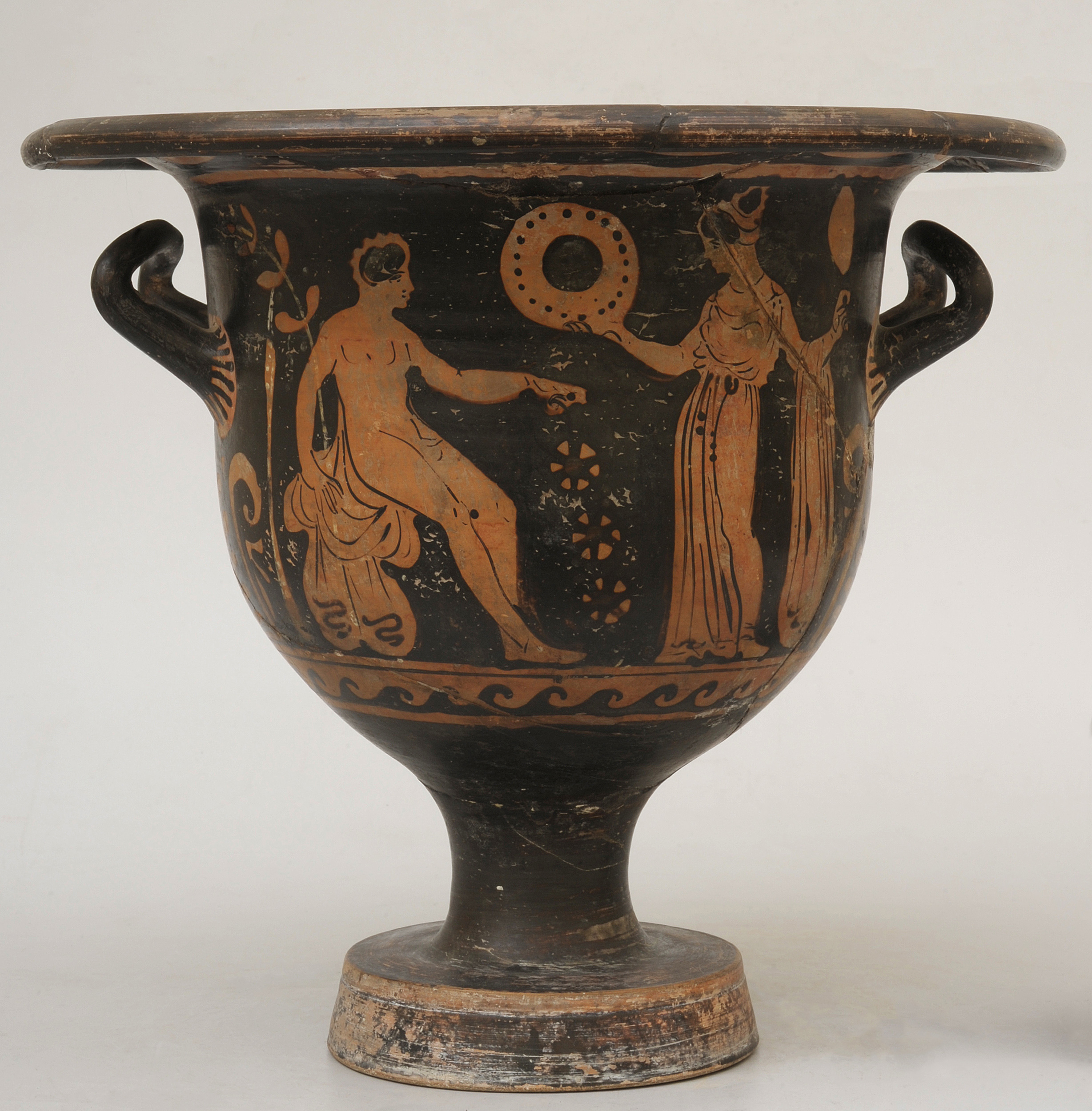 Starożytni Grecy pili wino zmieszane z wodą, a zwyczaj ten wymagał stworzenia odpowiednich naczyń do łączenia obu płynów – kraterów. Za względu na ich rozpowszechnienie istnieje bardzo wiele wariantów tej formy. Są to jednak zawsze pojemniki głębokie, o szerokiej i niskiej szyi (co ułatwiało korzystanie z nich) zwykle na niskiej stopce, z dwoma uchwytami (zwanymi imadłami). Ze względu na ich charakterystyczne kształty wyróżnia się kilka typów kraterów, takich jak: kolumienkowy, wolutowy, kielichowy czy dzwonowaty. Zabytek wilanowski należy do tego ostatniego – najprostszego, a także wykształconego najpóźniej, a jednocześnie najbardziej popularnego na terenach Południowych Włoch, gdzie najprawdopodobniej powstał. Powierzchnię naczynia zdobią dosyć często spotykane przedstawienia namalowane w technice czerwonofigurowej. Po jednej stronie widzimy siedzącego nagiego mężczyznę i stojącą, ubraną w chiton kobietę, która trzyma w dłoni okrągły przedmiot. Najprawdopodobniej jest to wieniec, może to być także tympanon – bęben podobny do tamburynu, którego błonę wykonywano ze skóry. Po drugiej stronie przedstawiono dwie stojące, wsparte na kijach postacie męskie w długich płaszczach. Dekorację uzupełniają popularne ornamenty – falowy pod przedstawieniami figuralnymi, palmety pod uchwytami i wieniec z liści laurowych pod wylewem.