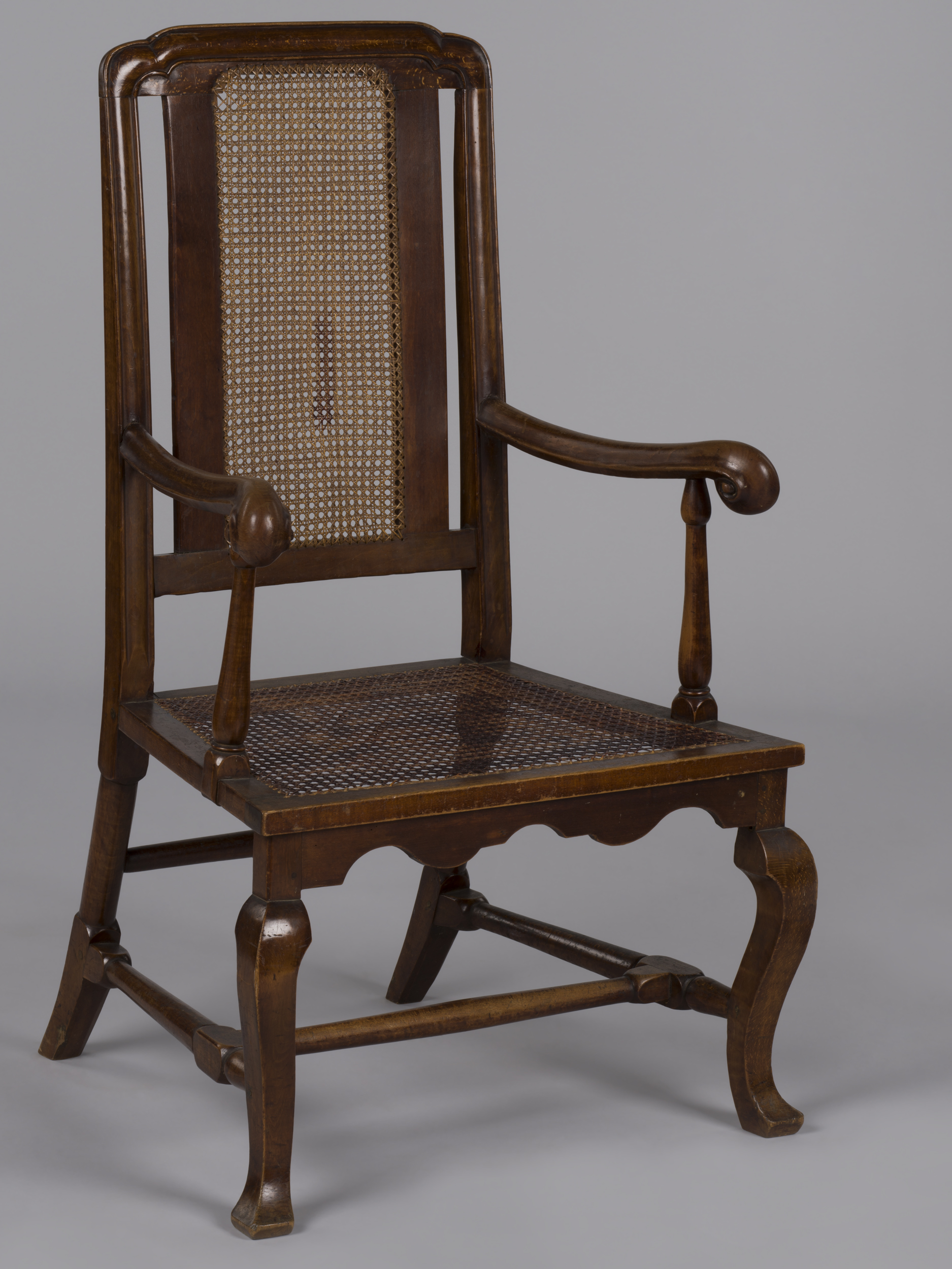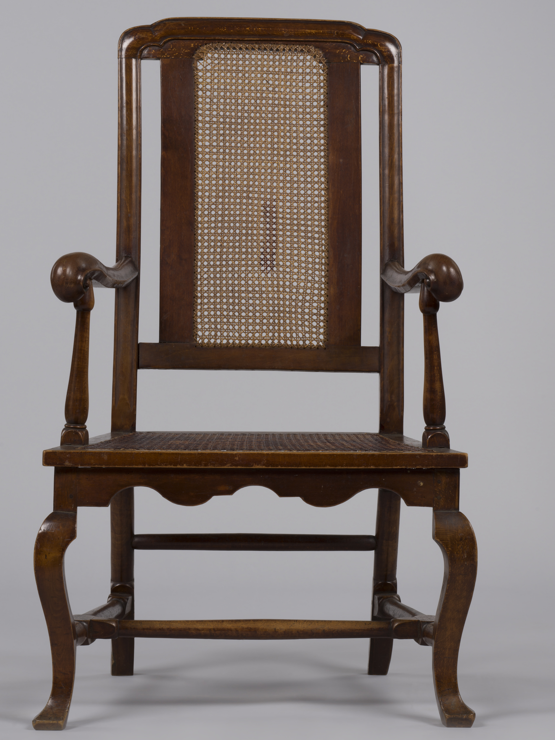 Fotel należy do z zespołu 5 zachowanych w zbiorze wilanowskim (Wil.2967, Wil.2968, Wil.2969, Wil.2970, Wil.2978). Reprezentuje typ mebli angielskich z początku XVIII w. dzięki zmianom w konstrukcji charakteryzujący się lekkością i przede wszystkim funkcjonalnością. Rama oparcia pleców przechodzi bezpośrednio w tylne nóżki fotela. Rama siedziska od tyłu umocowana została bezpośrednio do ramy oparcia, z przodu wsparta na frontowej desce do której zredukowano oskrzynie. W ażurowym oparcie pleców i w siedzisku wykorzystano plecionkę trzcinową. Tylne nogi toczone, z wzmocnieniami kostkowymi w miejscach łączenia z wiązaniem zachowują formy konstrukcyjne, przednim nadano cechy dekoracyjnego wygięcia cabriole. Kształt fotela, wyważone proporcje, wygięcia linii przednich nóg i krawędzi deski oskrzynia, podpory poręczy, plecionka staranne wykonanie sprawiają, że fotel nie pozbawiony jest elegancji