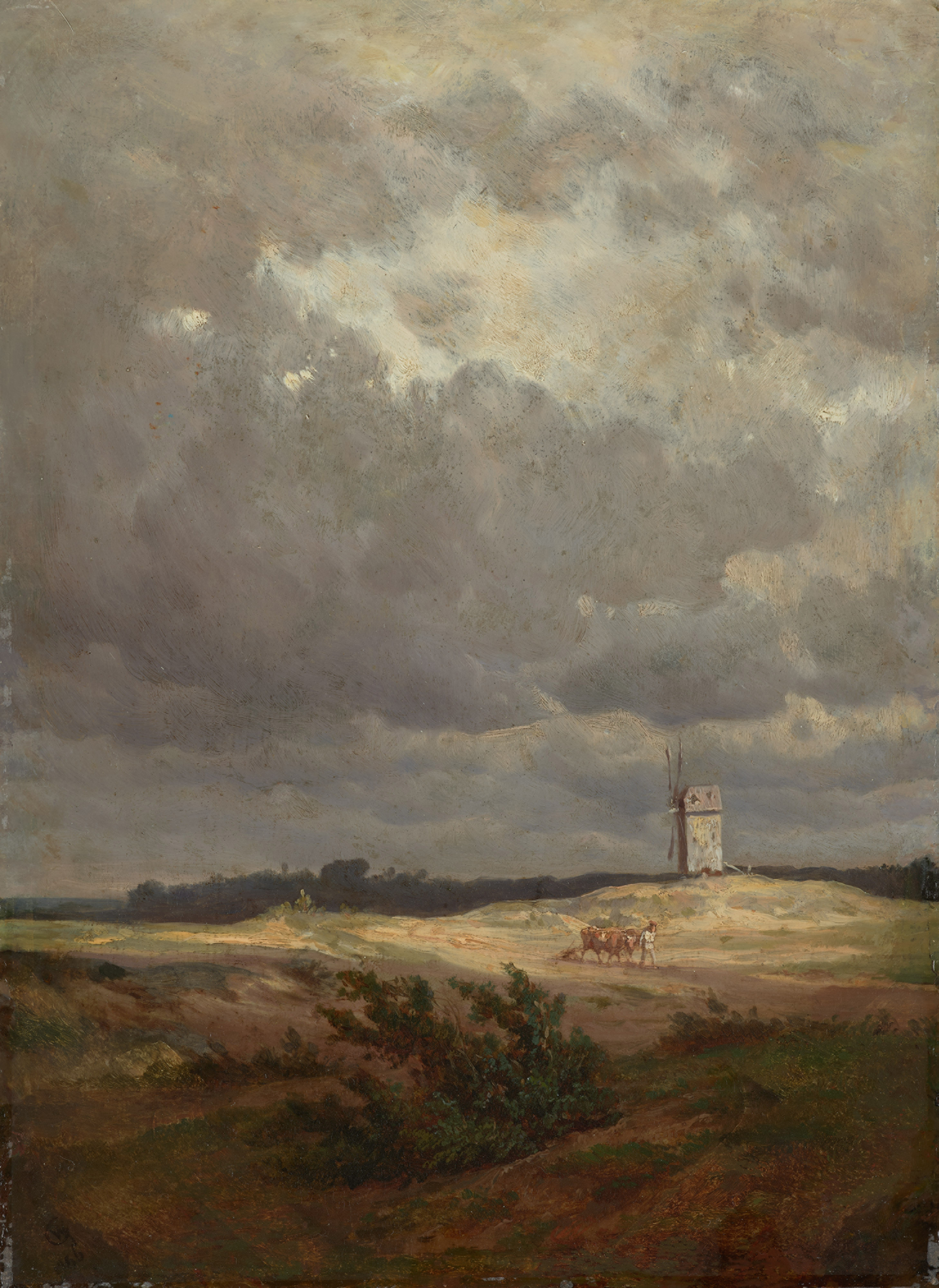 Wojciech Gerson naukę rozpoczął w 1839 roku w warszawskim II Gimnazjum Filologicznym. W latach 1844–1850 studiował w tamtejszej Szkole Sztuk Pięknych, początkowo na Wydziale Architektury, później na Wydziale Malarstwa – w pracowniach Jana Chrystiana Breslauera, Feliksa Piwarskiego i Marcina Zaleskiego. Pierwszy z nich, wybitny pejzażysta po düsseldorfskim treningu, rozbudził w Gersonie zainteresowanie krajobrazem. W latach 1849–1853 młody artysta związał się z Cyganerią Warszawską, z którą pieszo zwiedził Kielecczyznę, Lubelszczyznę, Mazowsze i Kujawy, Wileńszczyznę oraz Kowieńszczyznę. W latach 1853–1855 Gerson uzyskał dyplom Imperatorskiej Akademii Sztuk Pięknych w Sankt Petersburgu. W roku ukończenia studiów namalował na miedzianej blasze kameralny pejzaż, który znalazł się w kolekcji szczecińskiej. Rozległy krajobraz o obniżonej linii horyzontu ukazuje na pierwszym planie pochylony krzew porastający niewielkie wzniesienie. W tle, u stóp piaszczystego pagórka z wiatrakiem, wprowadzono drobny sztafaż – chłopa z parą wołów ciągnących pług. Ponad ciemną linią lasu znaczną część pola obrazowego zajmuje studium nieba zasnutego kłębiastymi obłokami – właściwy temat obrazu. Brunatno-sina paleta barwna, układ kompozycyjny oraz dobór motywów przypominają konwencję siedemnastowiecznego malarstwa holenderskiego, cenioną przez twórców rodzącego się realizmu. Do pomysłu tego artysta powrócił dekadę później, tworząc horyzontalny Krajobraz pochmurny z krowami. Miedziane podobrazie należało do nietypowych, choć stosowanych w XIX wieku. Gerson wykonał na tym podłożu cykl obrazów dla statków pasażerskich Spółki Żeglugi Parowej na Rzekach Spławnych Królestwa Hrabiego Zamoyskiego. Pokłady „Płocka” (1852) i „Włocławka” (1853) zdobiły widoki miast i zabytków architektury, zaś „Narwi” lub „Niemna” (1856–1857) seria siedmiu drzew polskich. Pejzaż z wiatrakiem stanowi prawdopodobnie pokłosie zleceń od Zamoyskiego, które przyjmowali wówczas także Julian Cegliński i Franciszek Kostrzewski.