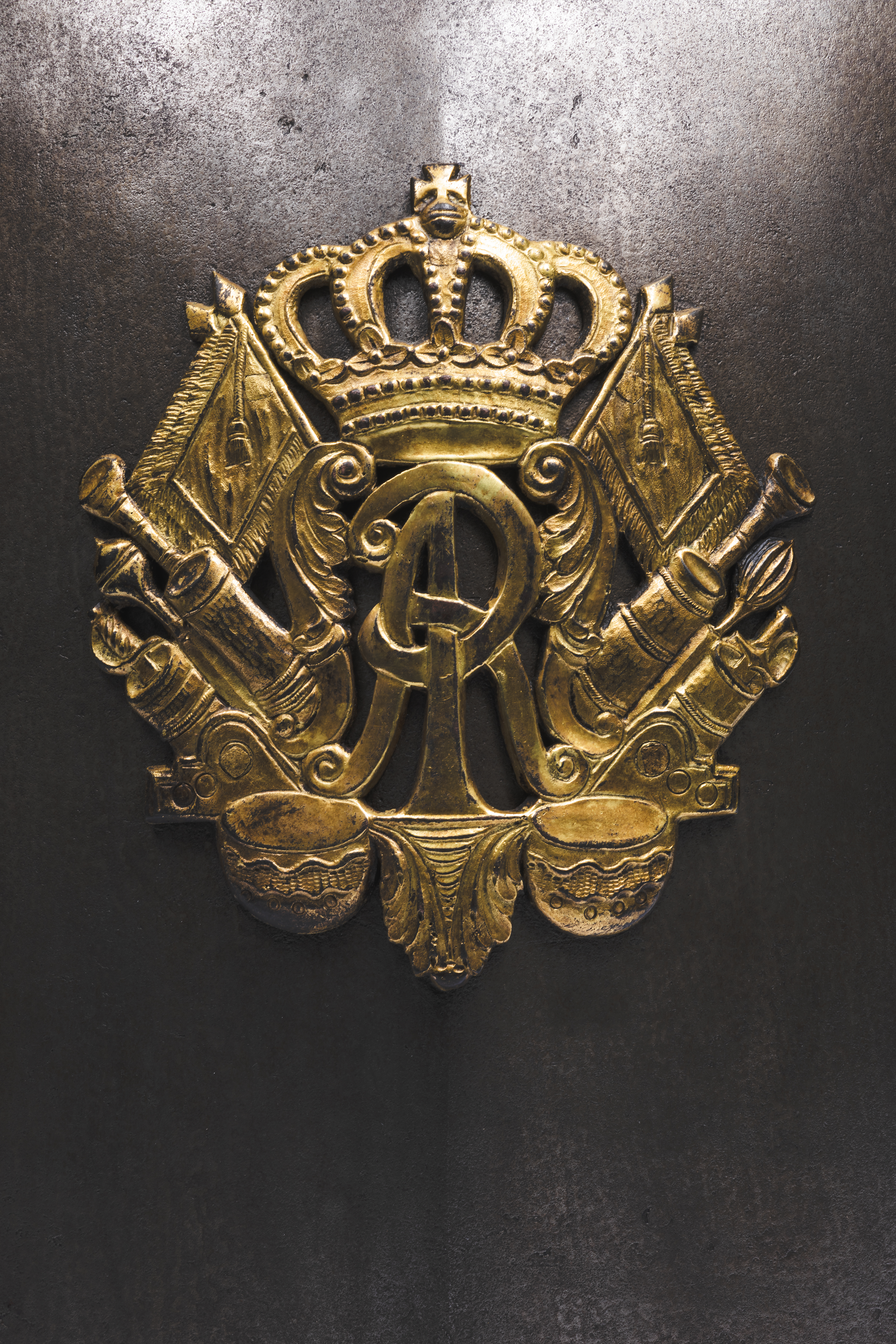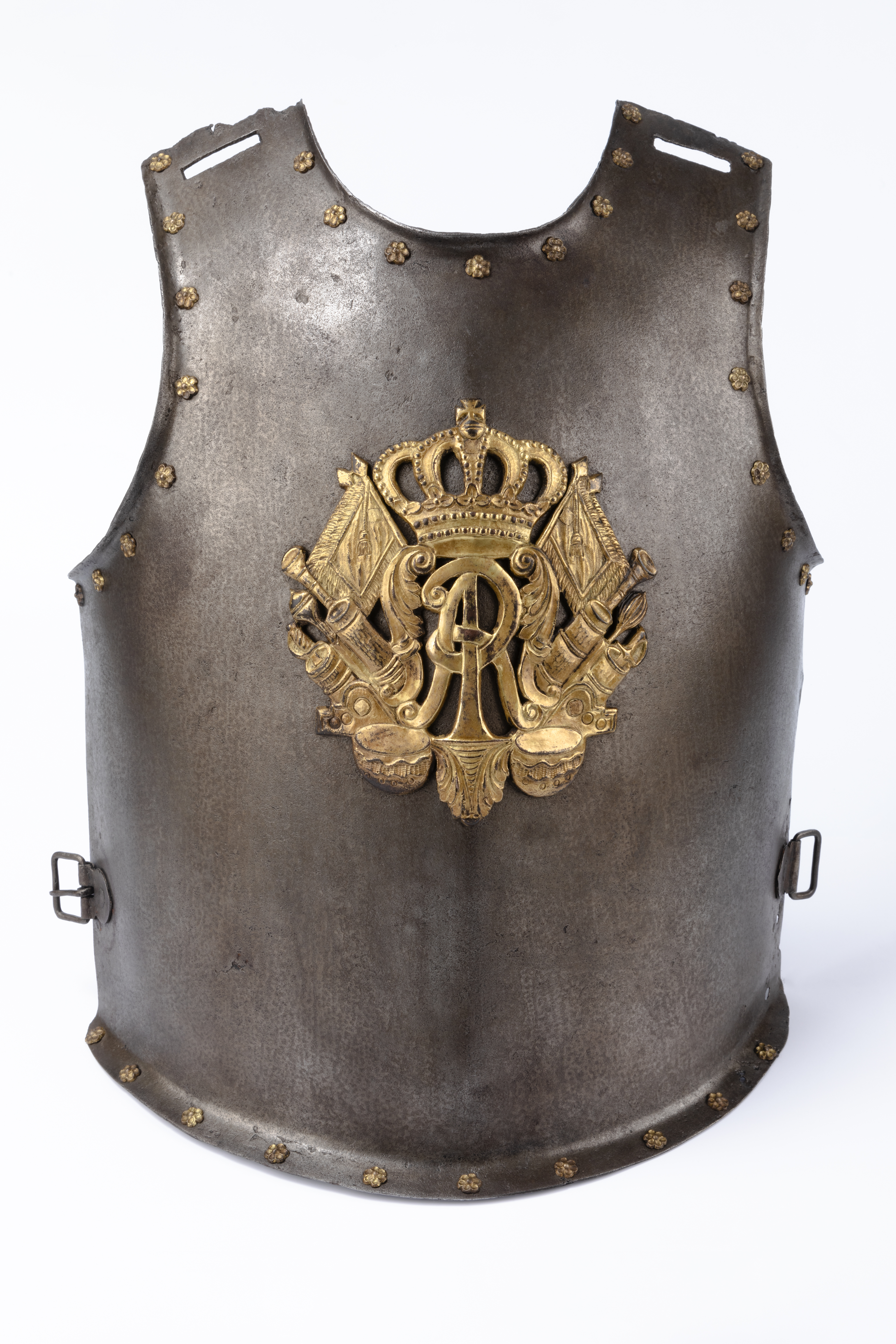 Napierśnik oficerski, wykuty z jednego kęsa blachy, z granią biegnącą pionowo przez środek oraz z brzegami wywiniętymi na zewnątrz. Zewnętrzna krawędź ozdobiona jest 34 nitami ze złoconymi główkami w formie kwiatów o sześciu płatkach, pierwotnie przytrzymującymi wewnętrzne obicie. W górnej części ramion wykute dwa prostokątne otwory do przewleczenia szelek służących jako mocowanie. W dolnej partii napierśnika, bo bokach stalowa sprzączka oraz szlufka. W centralnej części zamocowana za pomocą nitów brązowa, złocona ogniowo plakieta z reliefem w postaci cyfry AR stojącej na palmetowej konsoli z akantowymi wolutami po bokach oraz zamkniętą koroną na górze. W tle panoplium złożone z symetrycznie rozłożonych kotłów, trąbek, sztandarów oraz luf dział. Pomiędzy nimi elementy uzbrojenia zaczepnego — buzdygan, buława, szabla oraz rapier. Od strony wewnętrznej nity podbite podkładkami.