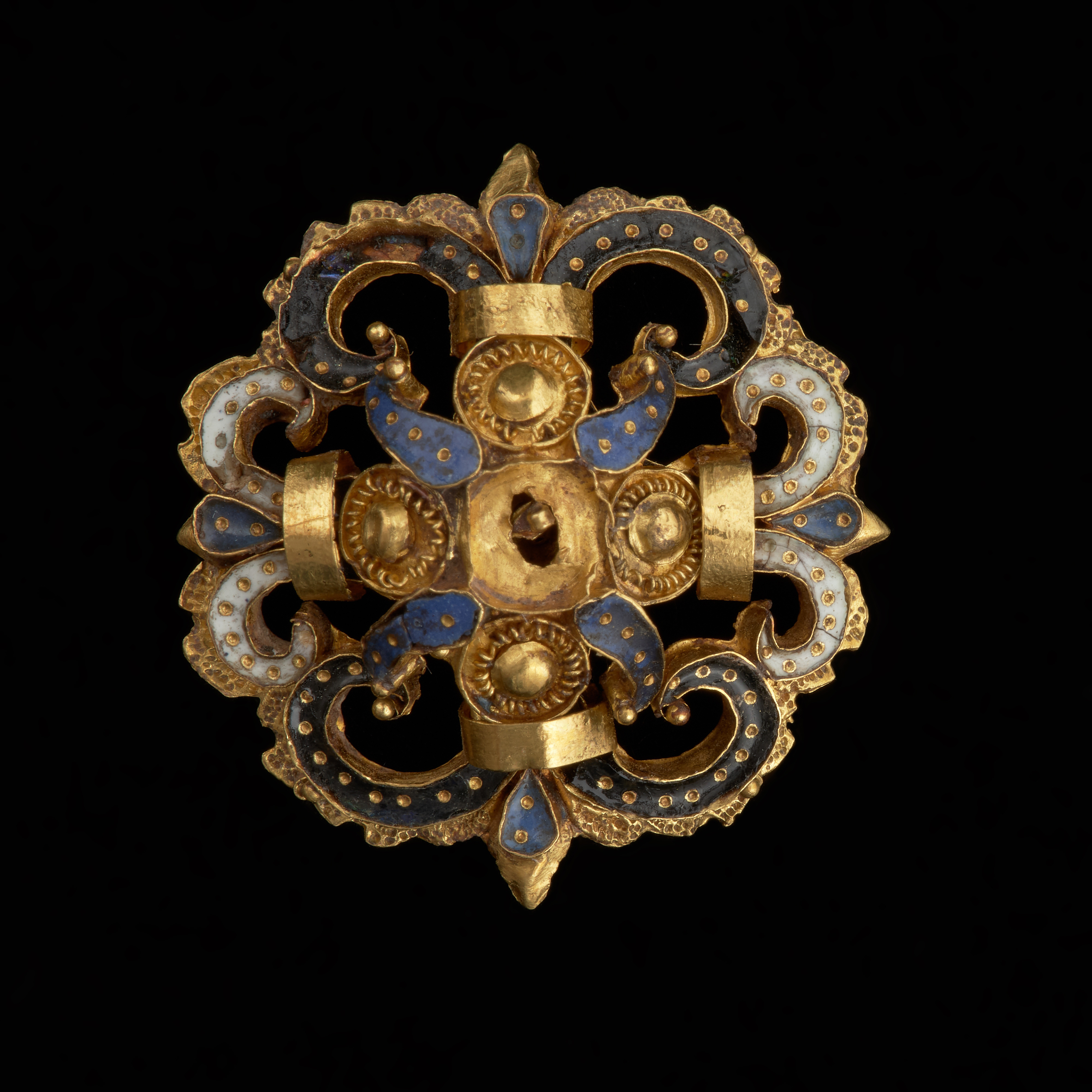 emalia czarna, emalia niebieska, emalia biała, drut złoty, złoto