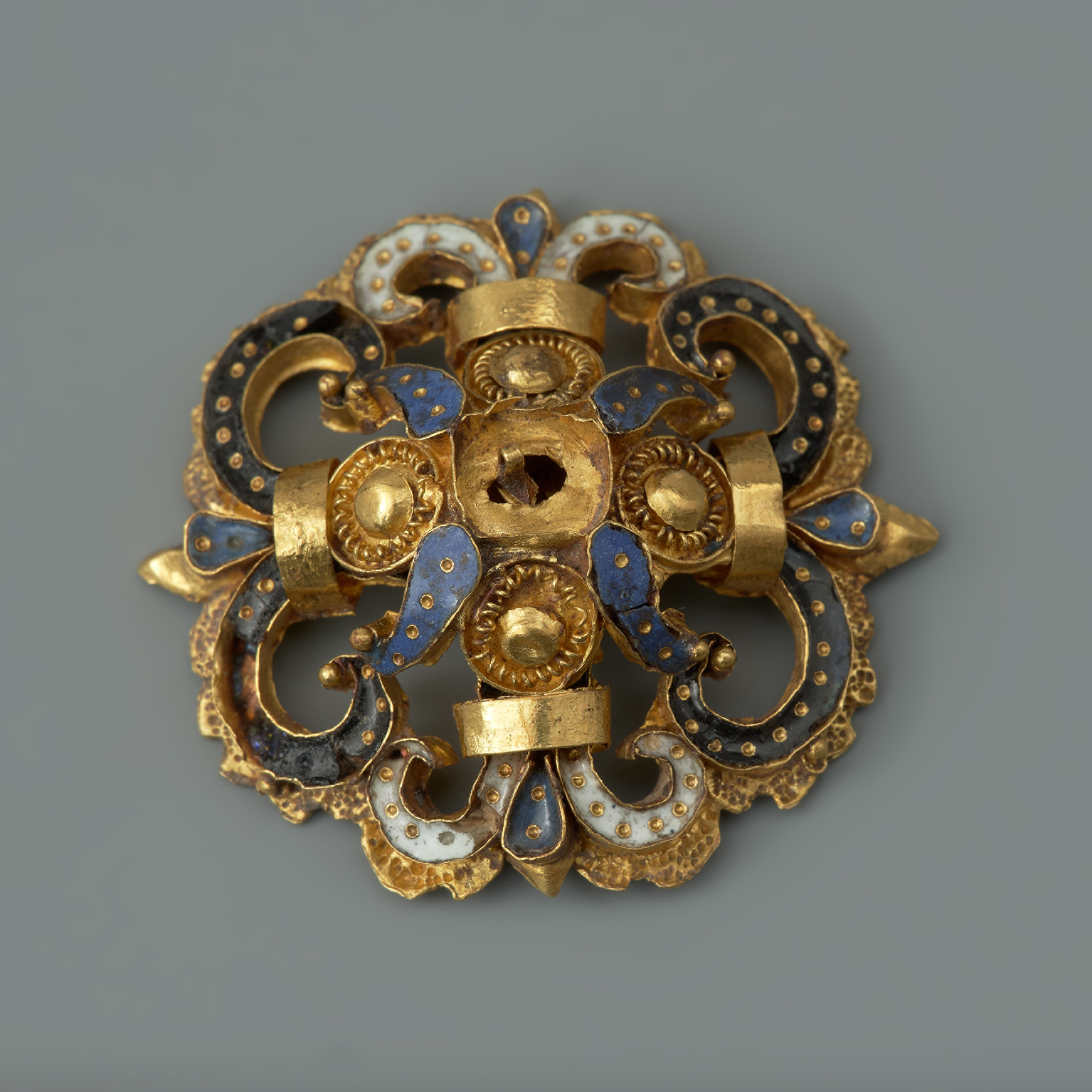 Kompozycja ażurowych rozet, znalezionych w krypcie szczecińskiego zamku, składa się z centralnie umieszczonego złotego guza, wokół którego zostały rozmieszczone cztery mniejsze guzy otoczone spiralnie zwiniętym drutem, a także płatki zdobione ciemnoniebieską emalią oraz woluty wypełnione czarną oraz białą emalią, spięte złotymi taśmami. Elementy emaliowane są inkrustowane regularnie rozmieszczonymi złotymi kropkami (części brakuje). Zachowane klejnoty należą do popularnego w Europie Środkowej i Północnej pod koniec XVI i w pierwszych dziesięcioleciach XVII wieku typu ażurowych ozdób kształtowanych ze złotej blachy, zdobionych emalią komórkową inkrustowaną złotem, a także filigranem, granulacją i niekiedy perłami.