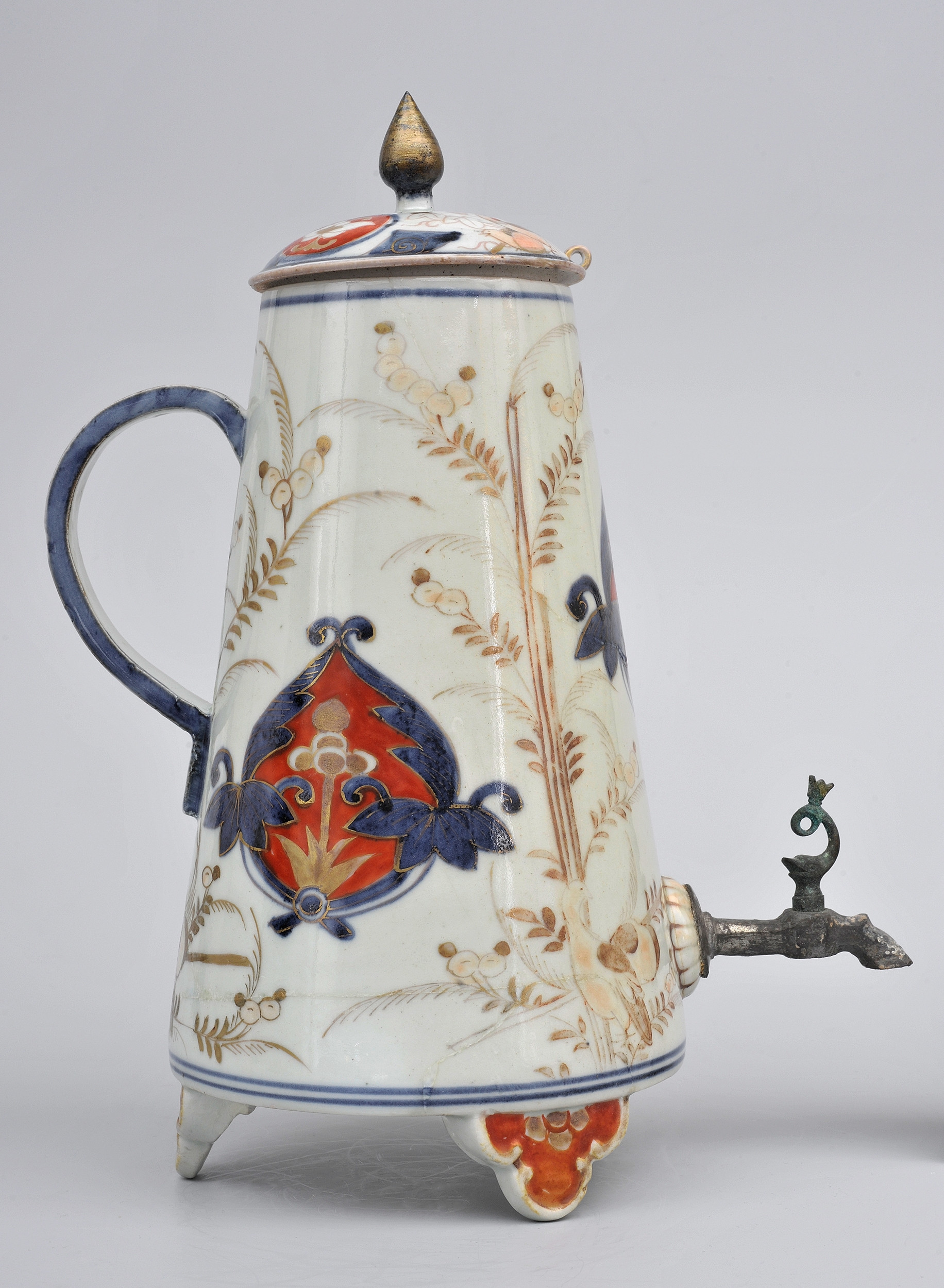 Porcelanowy imbryk do kawy w formie stożka ściętego u góry z płaską pokrywką zwieńczoną gałką, przymocowaną do korpusu niewielkim zawiasem. Naczynie spoczywa na trzech nóżkach w kształcie trójliścia. Z przodu, w dolnej partii brzuśca, przymocowano metalowy kranik z kurkiem w formie delfina. Z tyłu przytwierdzono duże ucho o prostokątnym przekroju. Szlachetna biel porcelany została ozdobiona stosunkową oszczędną ornamentyką japońskiego imari połączonego z dekoracją złotego imari. Imbryk zdobią złote kłosy z bladoróżowymi detalami, ptaki oraz czerwone rezerwy ujęte kobaltowymi liśćmi ze stylizowanym motywem roślinnym. Rezerwą określa się pole wyodrębnione krawędzią, wypełnione dekoracją.