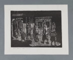 Jest to wersja grafiki „Ulica w getcie I”, 1945 różniąca się nieznacznie ograniczeniem liczby osób i sposobem opracowania postaci i tła, większym światłocieniem, zastosowaniem dużych czarnych powierzchni. | RP