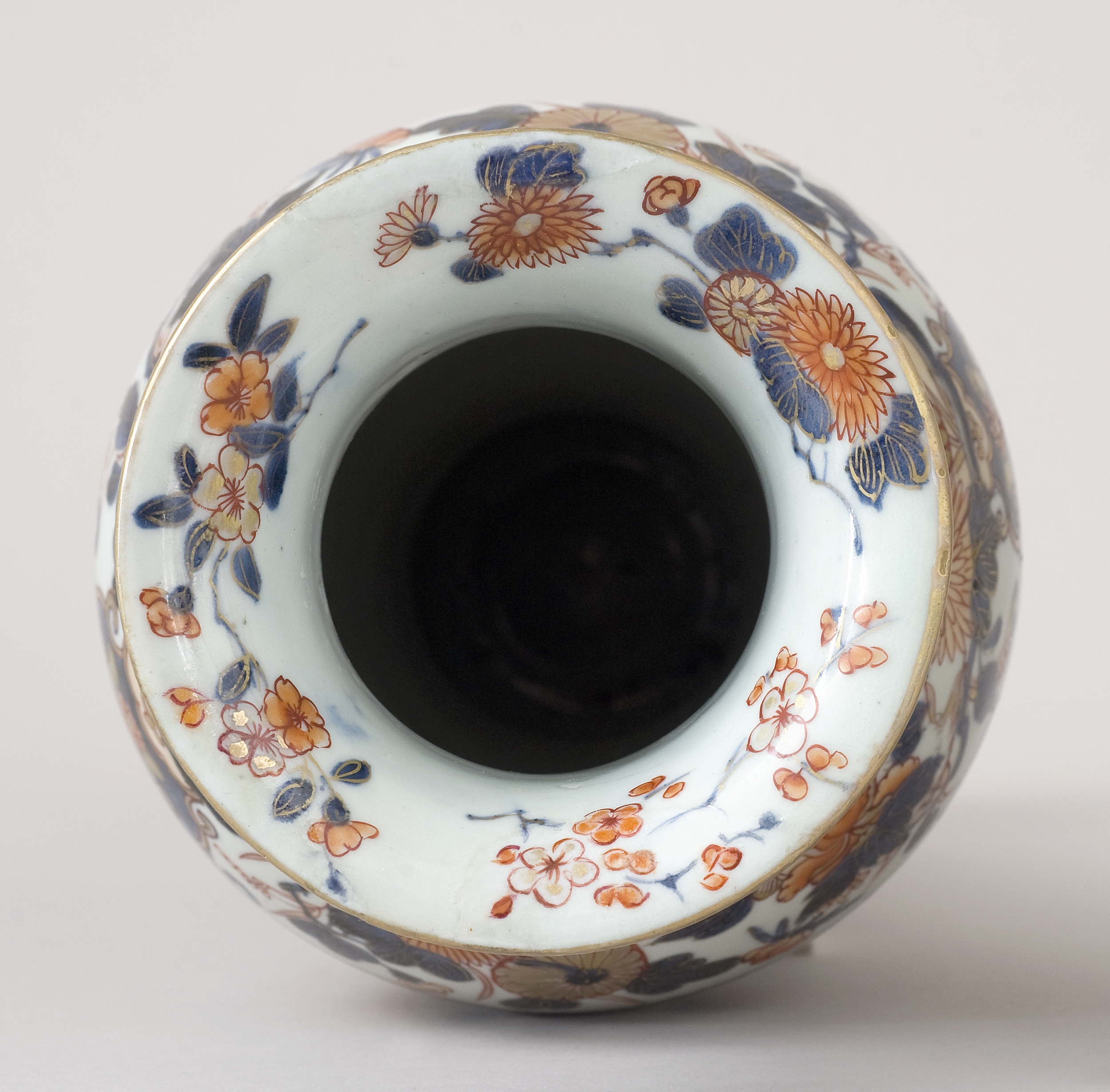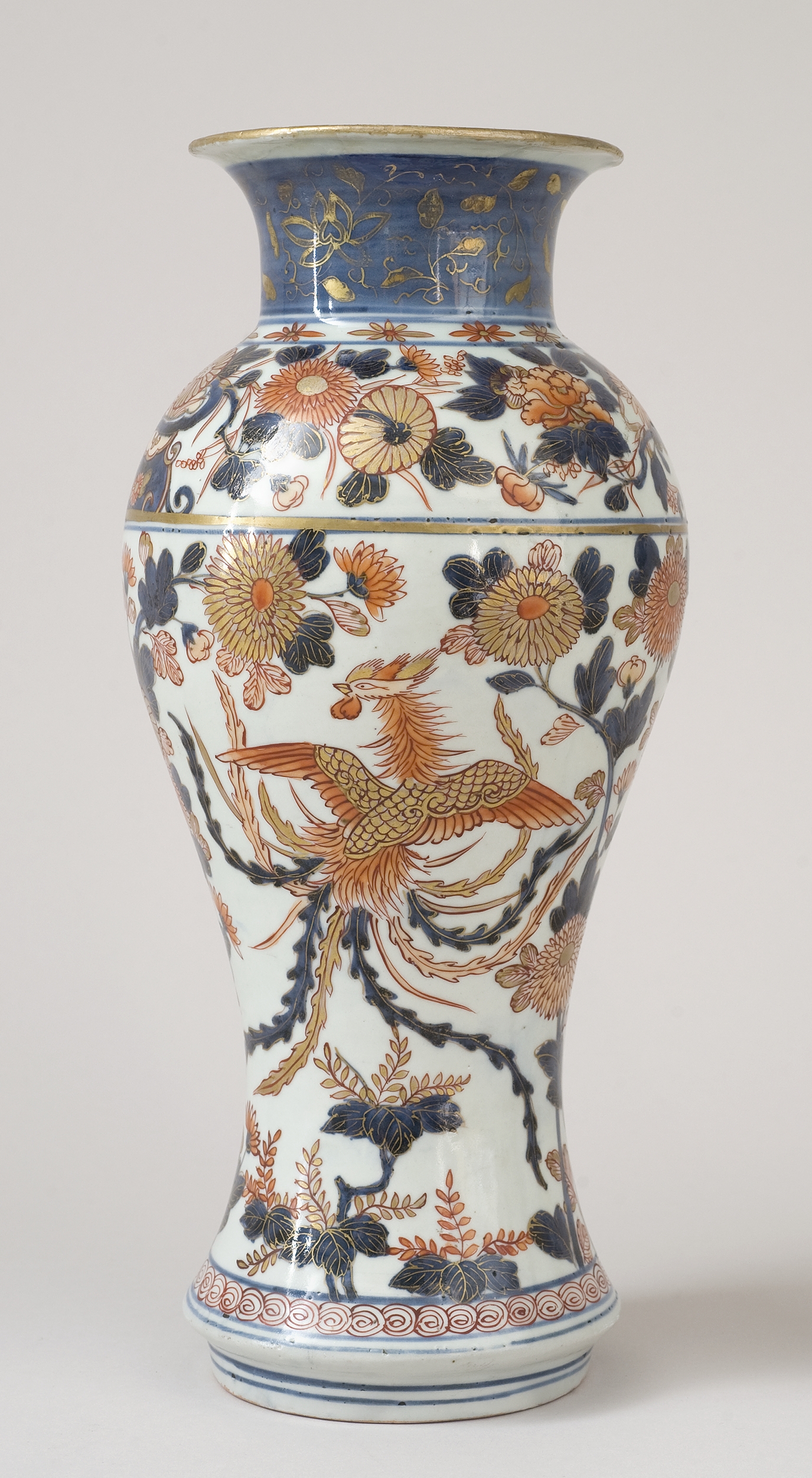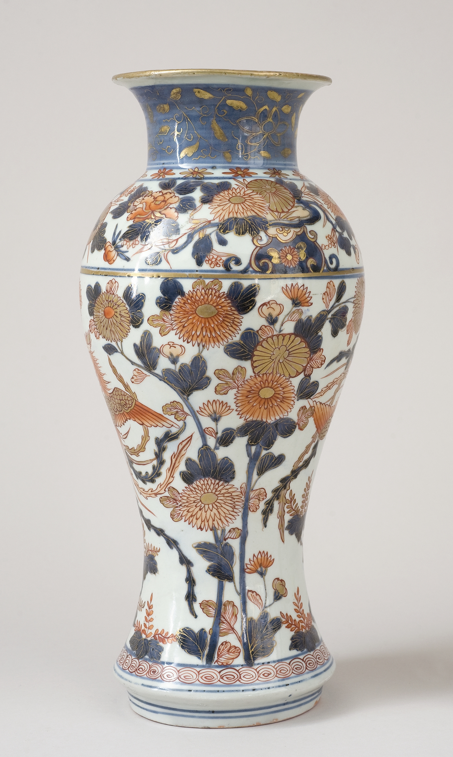 Porcelanowy owoidalny wazon dekorowany w stylu „chińskie imari”. Wysmukły, „lekki” kształt naczynia został uzyskany dzięki wydłużonej, esowatej linii brzuśca, i wysokiej szyi z delikatnie rozszerzającym się wylewem. Szlachetna biel porcelany została ozdobiona barwną ornamentyką wywodzącą się z wyrobów japońskiego imari.