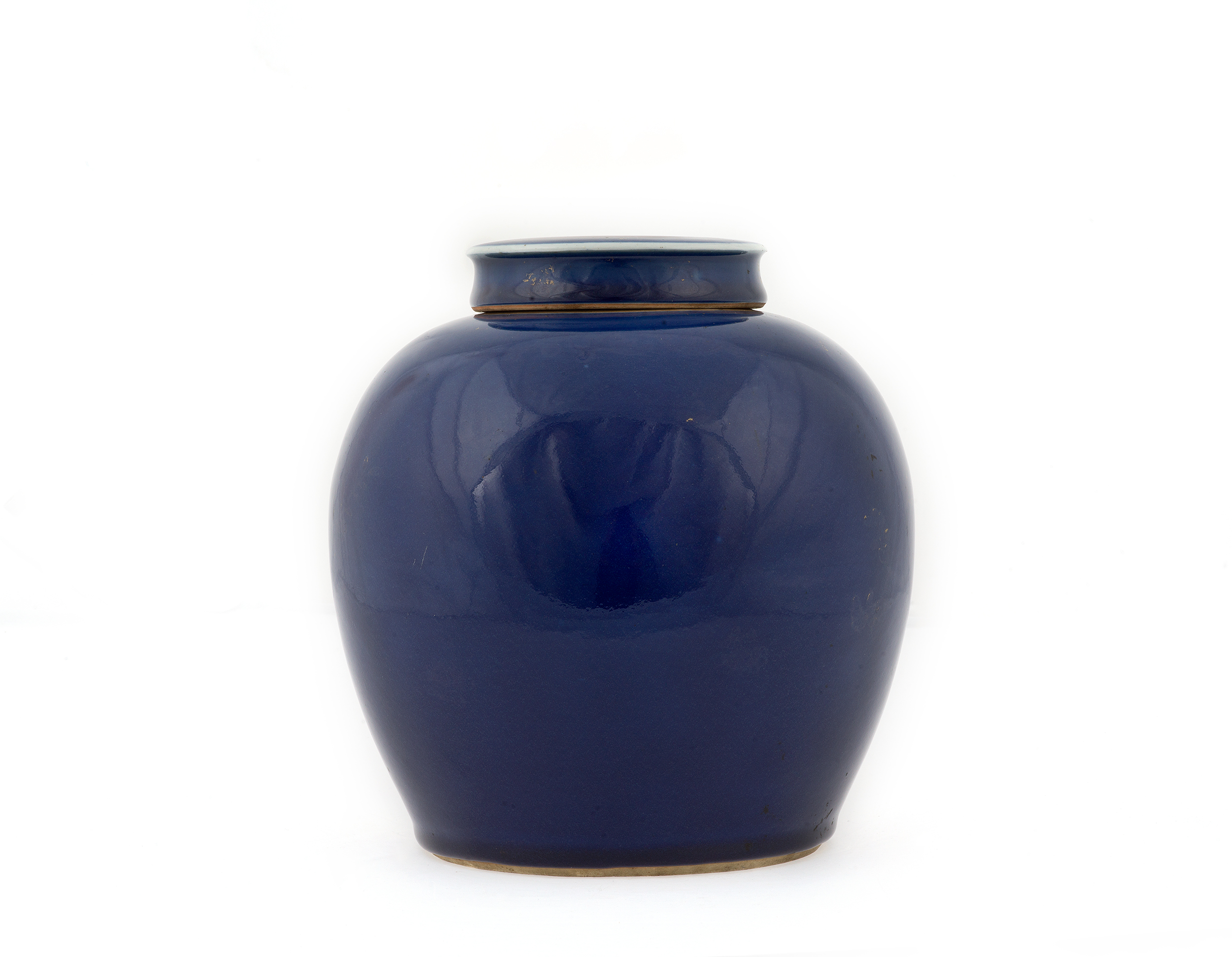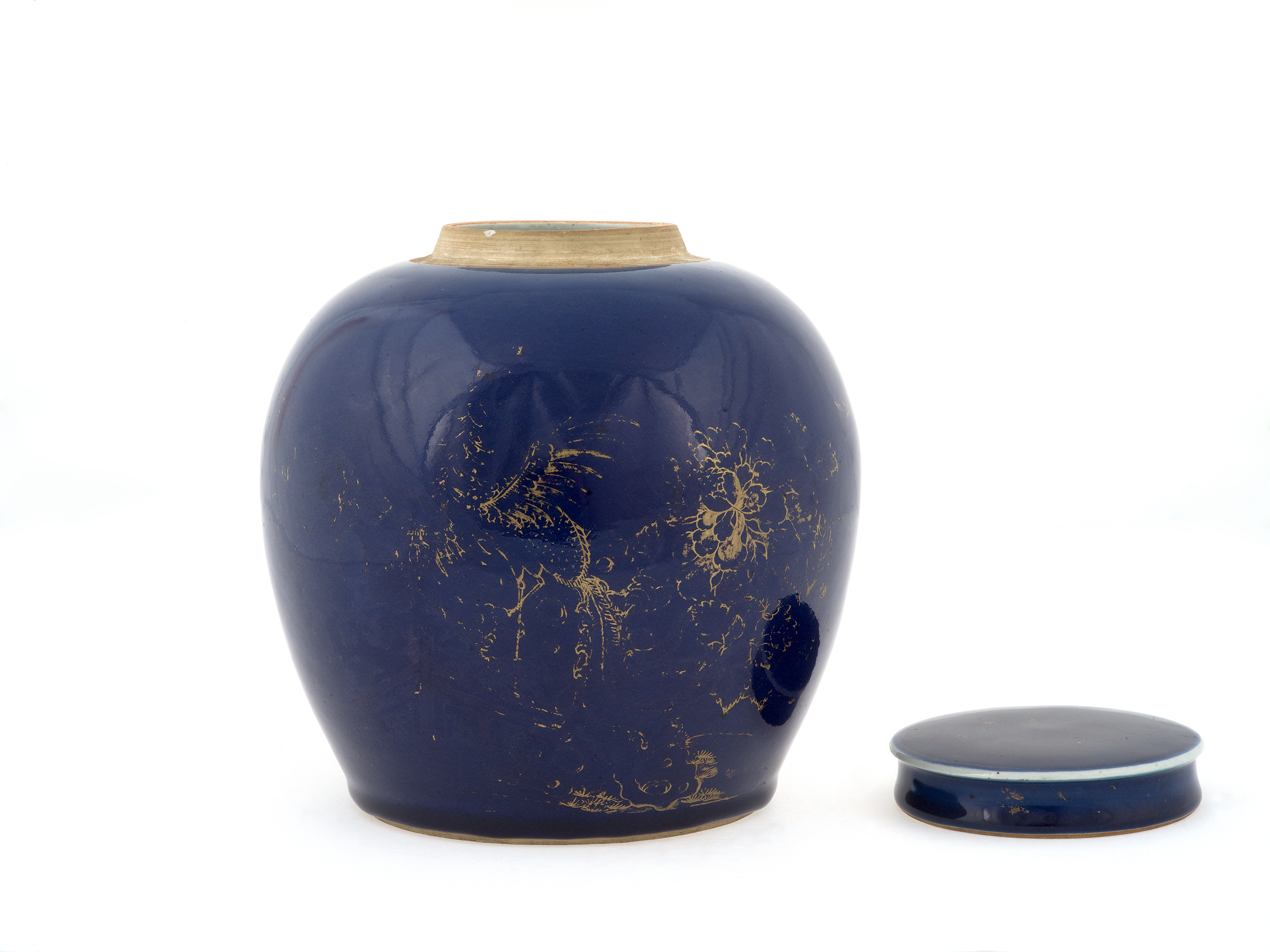 Chińskie porcelanowe naczynie na imbir charakteryzuje się owoidalnym kształtem z wysokimi ramionami i z cylindryczną, często płaską pokrywką. Taki właśnie kształt ma pojemnik na imbir z wilanowskiej kolekcji. Niezwykły kolor naczynia i głębia jego zdobienia powstała poprzez nadmuchiwanie przez rurkę i gazę rozdrobnionego proszku kobaltowego na powierzchnię naczynia, i następnie pokrycie jej szkliwem. Złotą dekorację wykonano po wypaleniu pojemnika malując ją odpowiednio przygotowanym złotem. Zachowała się jedynie fragmentarycznie - ze względu na charakter zdobień najbardziej narażona na zniszczenie. Zachowana dekoracja przedstawia subtelnie i wyrafinowanie wykonany rysunek feniksa i bujnego kwiatu peonii. Pozostała część ornamentyki pozostaje nieczytelna.