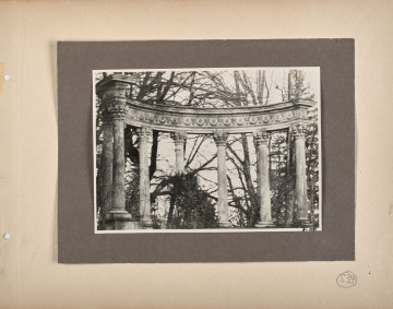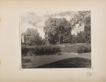 Fotografia przedstawia fragment dawnych fortyfikacji od strony południowo- wschodniej z fosą, murami oraz lipami rosnącymi wzdłuż alei wokoło fosy w miejscu dawnego wału. Ta lipowa aleja zasadzona została jeszcze przez księżnę Izabellę Lubomirską (zm. w 1816 r) po rozsunięciu wałów usypanych przed fosą. Ziemne wały wraz z murami i fosą tworzyły wzniesione w XVII wieku fortyfikacje łańcuckie. W końcu XVIII wieku systemem ten był już nieużyteczny - założono więc wewnątrz fosy, w bezpośrednim otoczeniu zamku pierwszy ogród a wokoło fosy zasadzono po rozsunięciu wałów, obiegające fosę aleje lipowe. Rozrosły się one i wraz porastająca mury roślinnością przydały zamkowi olbrzymiej malowniczości. W dalekim planie widoczna jest wschodnia elewacja zamku.