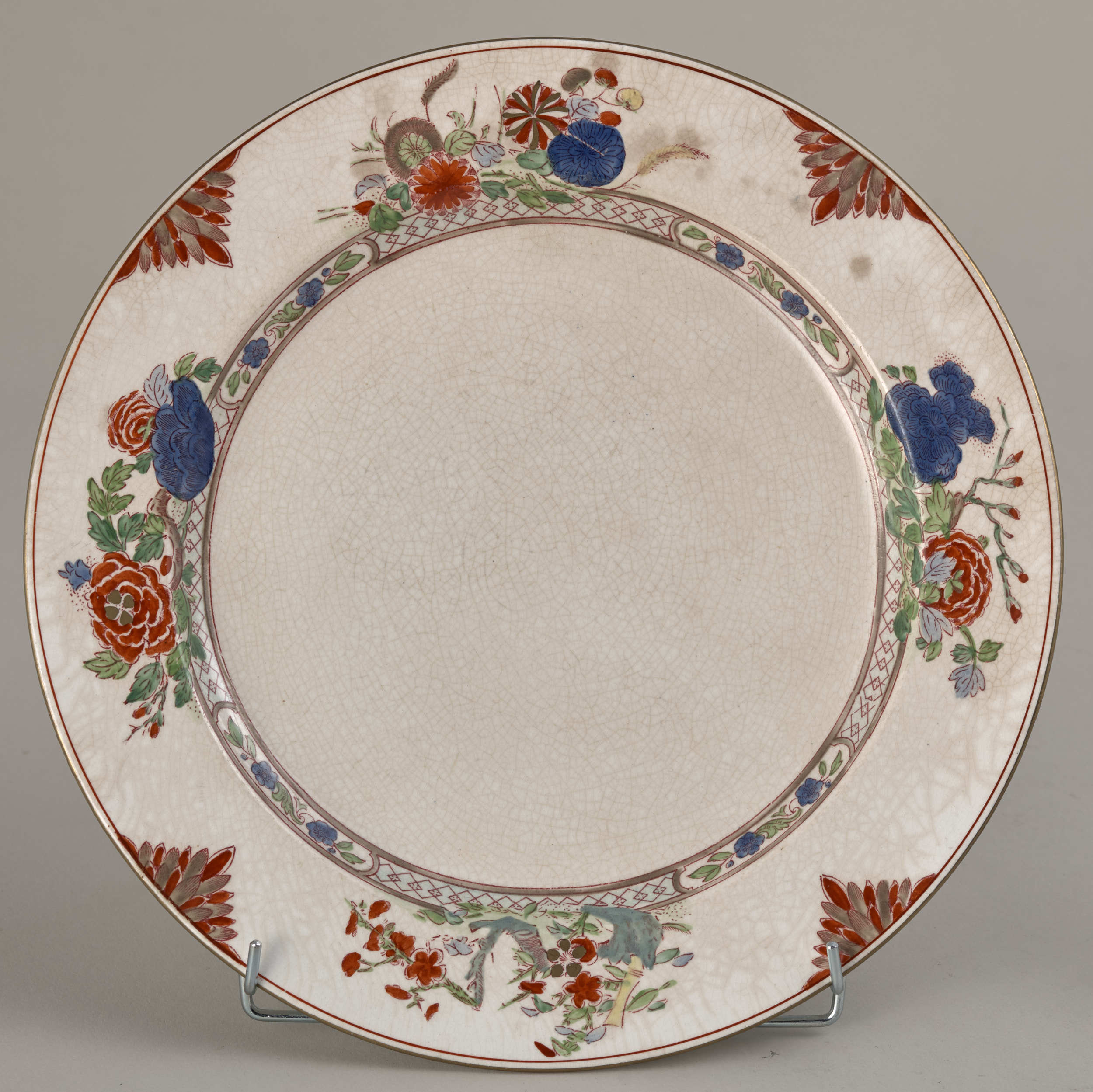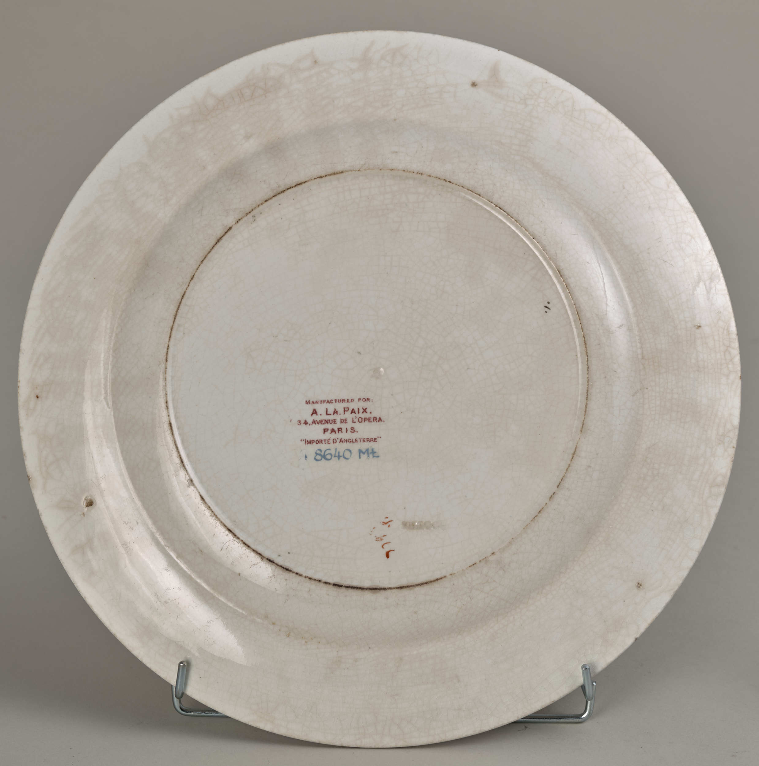 Talerz płytki z dekoracją chinizującą Talerz płytki, fajansowy o lekko kremowym odcieniu, pokryty siatką ozdobnych spękań szkliwa, zdobiony dekoracją malarską w typie dalekowschodnim o motywach roślinno – geometrycznych, a skoncentrowaną w partii kołnierza. Szczegółowy rysunek wzoru dekoracji naniesiony drukiem w kolorze purpurowym, następnie już na szkliwie- ręcznie podmalowany farbami w kilku kolorach: rdzawa czerwień, ciemnoniebieski, zielony, piaskowo-beżowy. Natomiast w mniejszości użyto farb w kolorach: jasnoniebieskim, stalowozielonym, seledynowym i żółtym. Na dekorację tę składa się pas ornamentu geometrycznego z motywem rombów, biegnący tuż pod krawędzią wrębu, następnie cztery duże kompozycje kwiatowo-roślinne, a jedno z nich z motywem połamanego krzewu, rozmieszczone na kołnierzu, blisko pasa ornamentu. Kompozycje te rozdzielone są liściastymi półrozetami. Złoto znajduje się jedynie w pasku lamującym brzeg kołnierza i drobnych elementach trzech kwiatów w dużych kompozycjach. Odwrocie talerza pokryte jest pod szkliwem szarymi plamkami. Widoczne oznakowania: w centralnym punkcie litera „B”, sygnatura fabryki „BOOTHS” – obydwa znaki stemplowane w masie i duża pieczęć drukowana podszkliwnie w kolorze bordowym: „MANUFACTURED FOR:/A.LA.PAIX,/34.AVENUE DE L’OPERA, /PARIS./IMPORTE D’ANGLETERRE”. Pod nią napis z aktualnym nr inwen. Anglia, Hanley, XIX w.