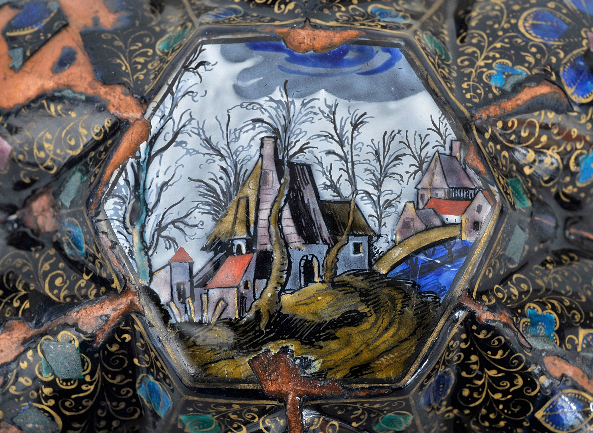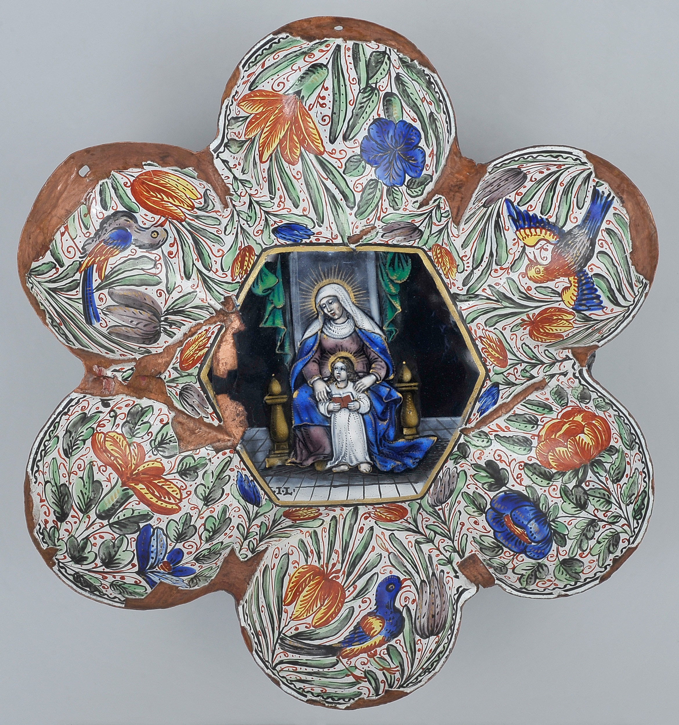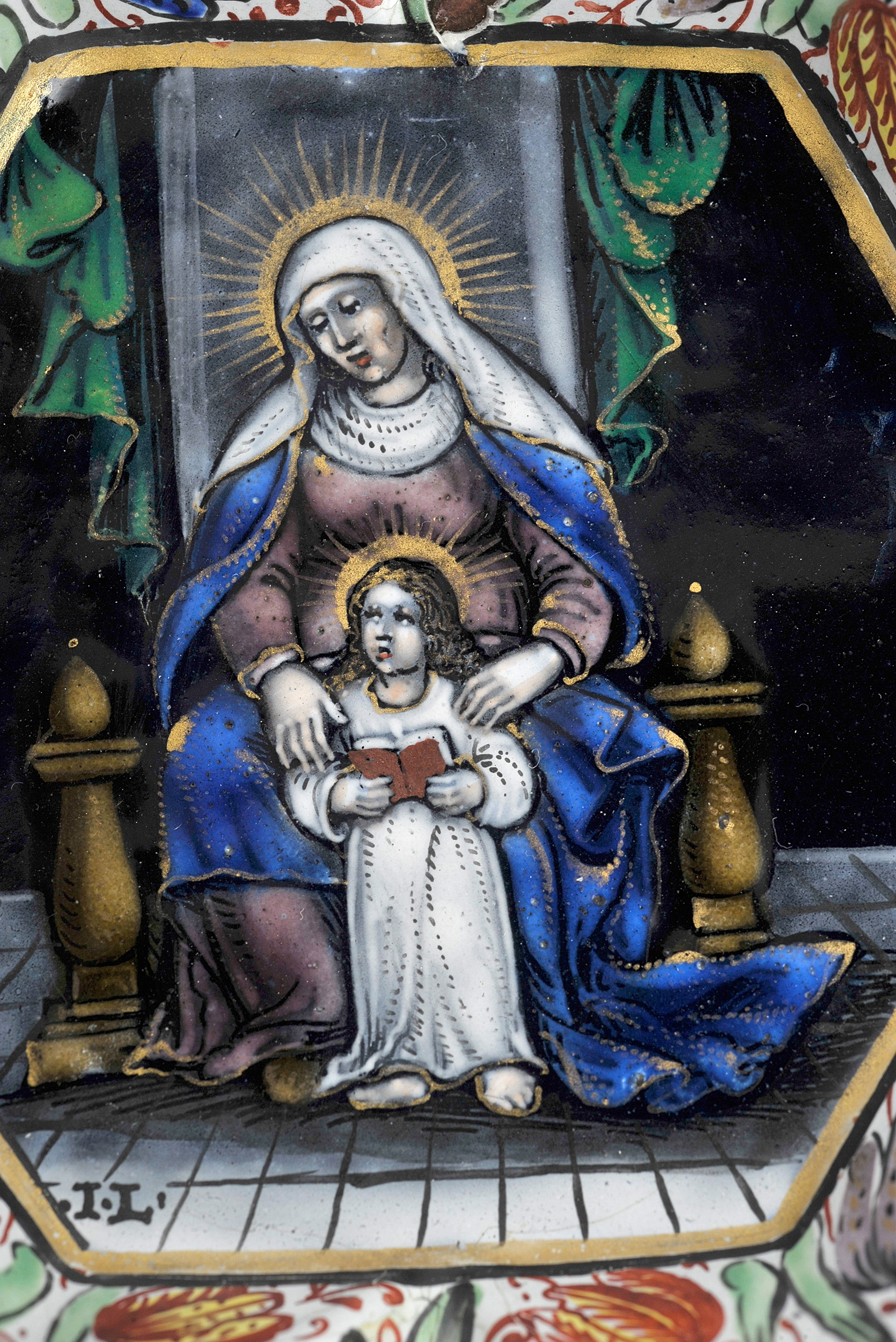 Czarka o sześciokątnym dnie i sześciopłatkowym kołnierzu, z obu stron pokryta wielobarwną emalią. Dekoracja kołnierza od wewnątrz skomponowana na białym tle z przedstawieniami różnobarwnych kwiatów i ptaków w tonacji żółtej, niebieskiej i zielonej. Boki czarki pokryte od zewnątrz czarną emalią ze złoconą arabeską oraz kwiatami o szafirowych płatkach. Dekoracje te stanowią bordiurę dla scen umieszczonych po obu stronach dna. Na sześciobocznej plakiecie od wewnątrz przedstawiona jest scena z siedzącą na tronie św. Anną, uczącą czytać małą Marię. Od zewnątrz na dnie widnieje pejzaż jesienny z bezlistnymi drzewami oraz domkami wzdłuż drogi i szafirową rzeką. Na brzegach kołnierza widoczne ślady po dwóch niezachowanych uchwytach. W lewym dolnym rogu przedstawienia wewnątrz czarki czarną farbą namalowany jest monogram I.L. (monogramem tym posługiwał się zarówno Jacques Laudin I, jak i Jacques Laudin II).